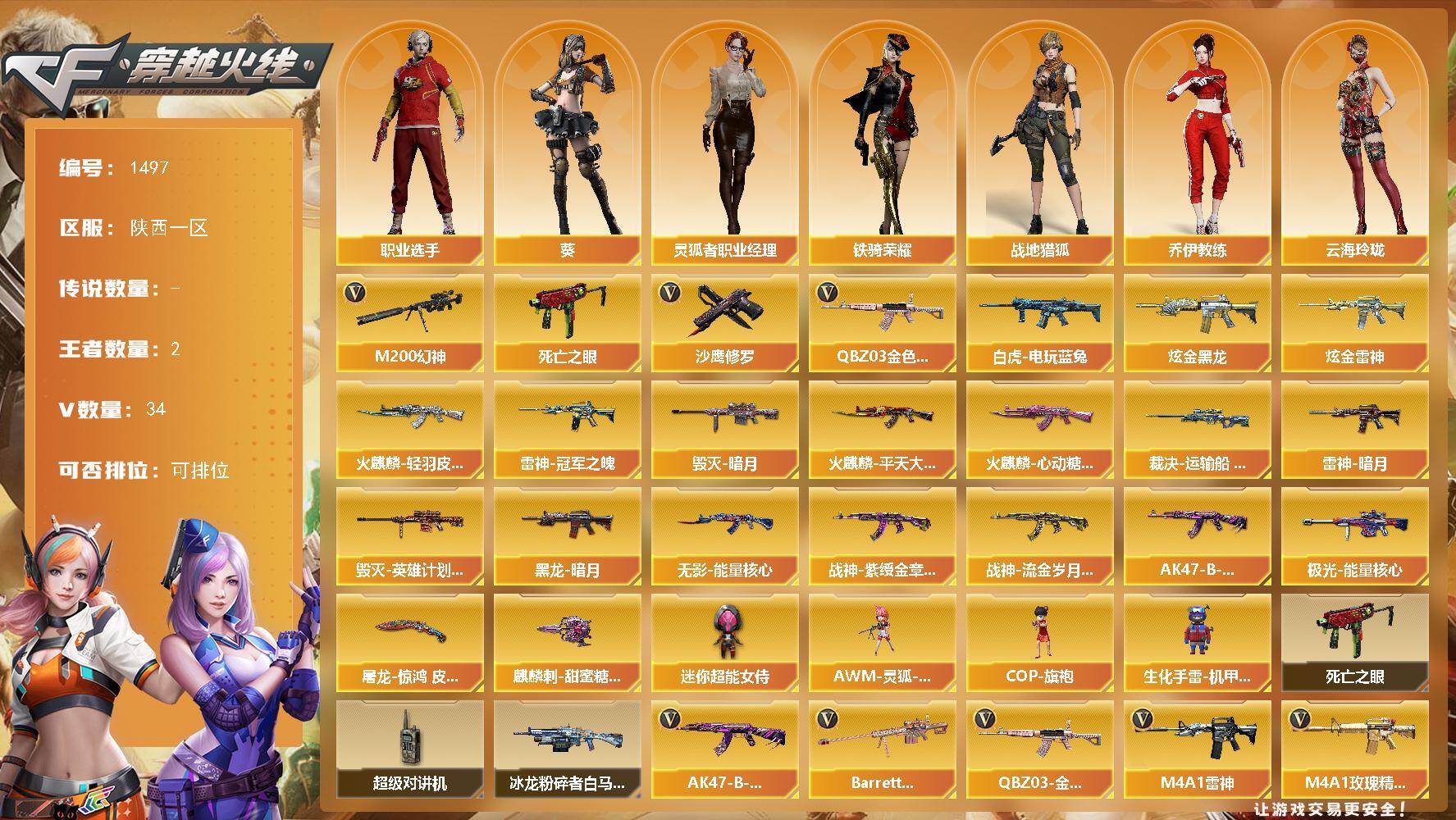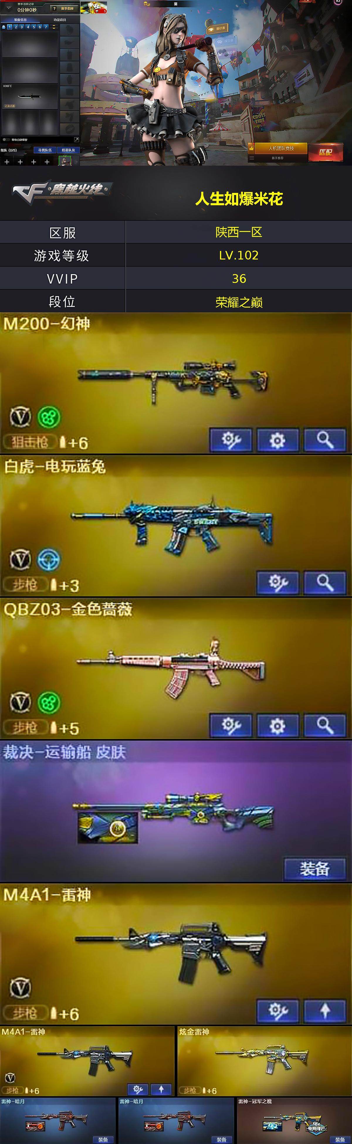 [15483309]陕西一区-34V-2王者-2炫金 【热门武器】:QBZ03-金色蔷薇,M200-幻神,死亡之眼*2,白虎-电玩蓝兔,沙鹰-修罗*2 【王者炫金武器】:炫金黑龙,炫金雷神 【皮肤】:裁决-运输船 皮肤,雷神-暗月*2,雷神-冠军之魄,火麒麟-轻羽皮肤,火麒麟-平天大圣,火麒麟-心动糖果,毁灭-暗月,毁灭-英雄计划 皮肤,黑龙-暗月,无影-能量核心,战神-紫绶金章皮肤,战神-流金岁月皮肤,AK47