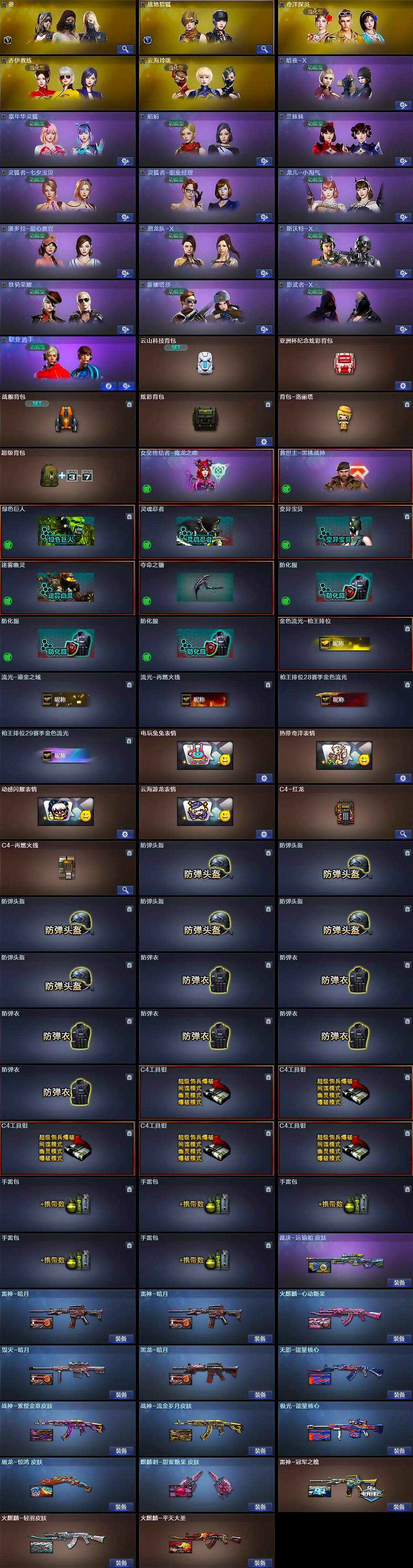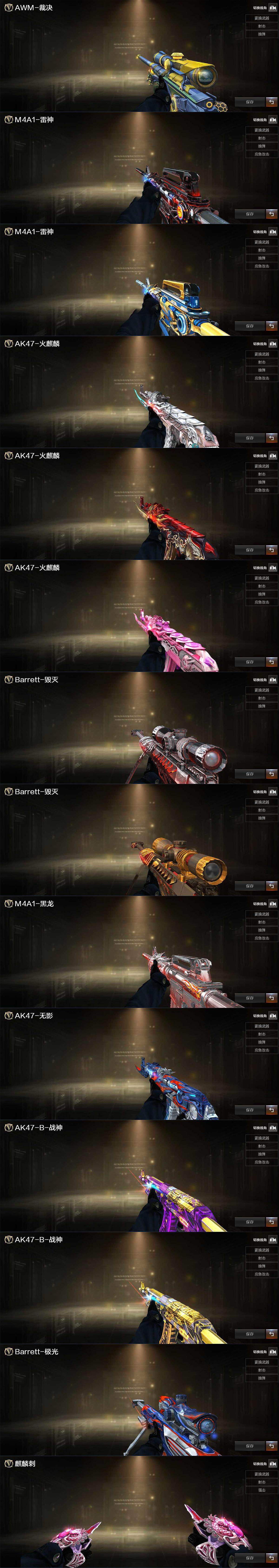 【皮肤】:裁决-运输船 皮肤,雷神-暗月*2,雷神-冠军之魄,火麒麟-轻羽皮肤,火麒麟-平天大圣,火麒麟-心动糖果,毁灭-暗月,毁灭-英雄计划 皮肤,黑龙-暗月,无影-能量核心,战神-紫绶金章皮肤,战神-流金岁月皮肤,AK47