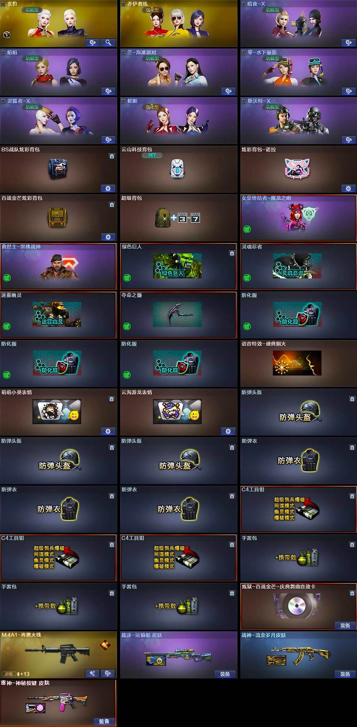 - [15246173]安徽一区-19V-2王者-0炫金 【王者炫金武器】:王者之怒 【音效卡】:Barrett-碧霄极光音效卡,炼狱-百战金芒-庆典舞曲音效卡 【皮肤】:雷神-暗月,M4A1-再燃火线,雷神-神秘按键 皮肤,火麒麟-雷神,战神-紫绶金章皮肤*3,战神-流金岁月皮肤*3,轻型军用手斧-再燃火线 【角色】:乔伊教练,修道士,云海玲珑,嘉年华灵狐,娟娟,灵狐者-X,龙儿,潘多拉-甜心教官,潜龙队-X,青霞仙子,蜀雪,雪莉杨,雪莉杨-摸金校尉,影武者-X 【人偶武器】:AWM-灵狐-15周年嘉年华,迷你深渊冰龙,闪光弹-小乔 【挑战大师】:AK47-冰龙粉碎者,激光毁灭者III 【英雄级武器】:AK47-麒麟,M4A1-雷神,王者之影-觉醒版,AK-47-猩红传说*6,AK47-B-战神,炼狱-百战金芒,麒麟刺-百战金芒,M4A1-苍鸣雷神 【道具】:冰冰企鹅背包-猛男专用,女皇终结者-背包,炫彩背包,百战金芒炫彩背包,超级背包,女皇终结者-魔龙之吻,绿色巨人,灵魂忍者*3,变异宝贝,妖姬,迷雾幽灵,生化弹匣,夺命之镰,防化服*3,流光-鎏金之域,语音特效-盛典烟火,萌萌小葵表情,防弹头盔*8,防弹衣*7,C4工具钳*3,手雷包*5 【特殊枪械】: