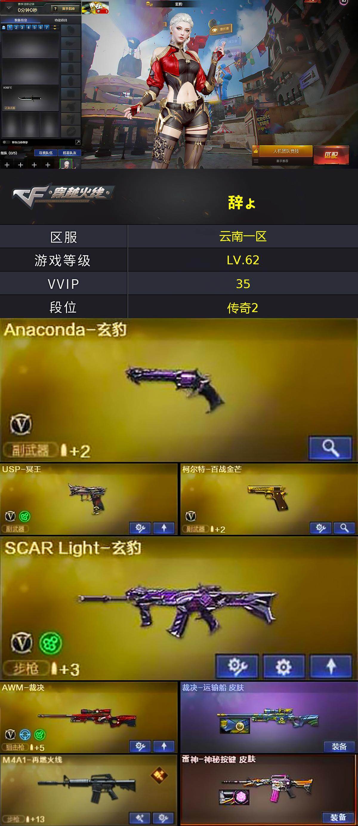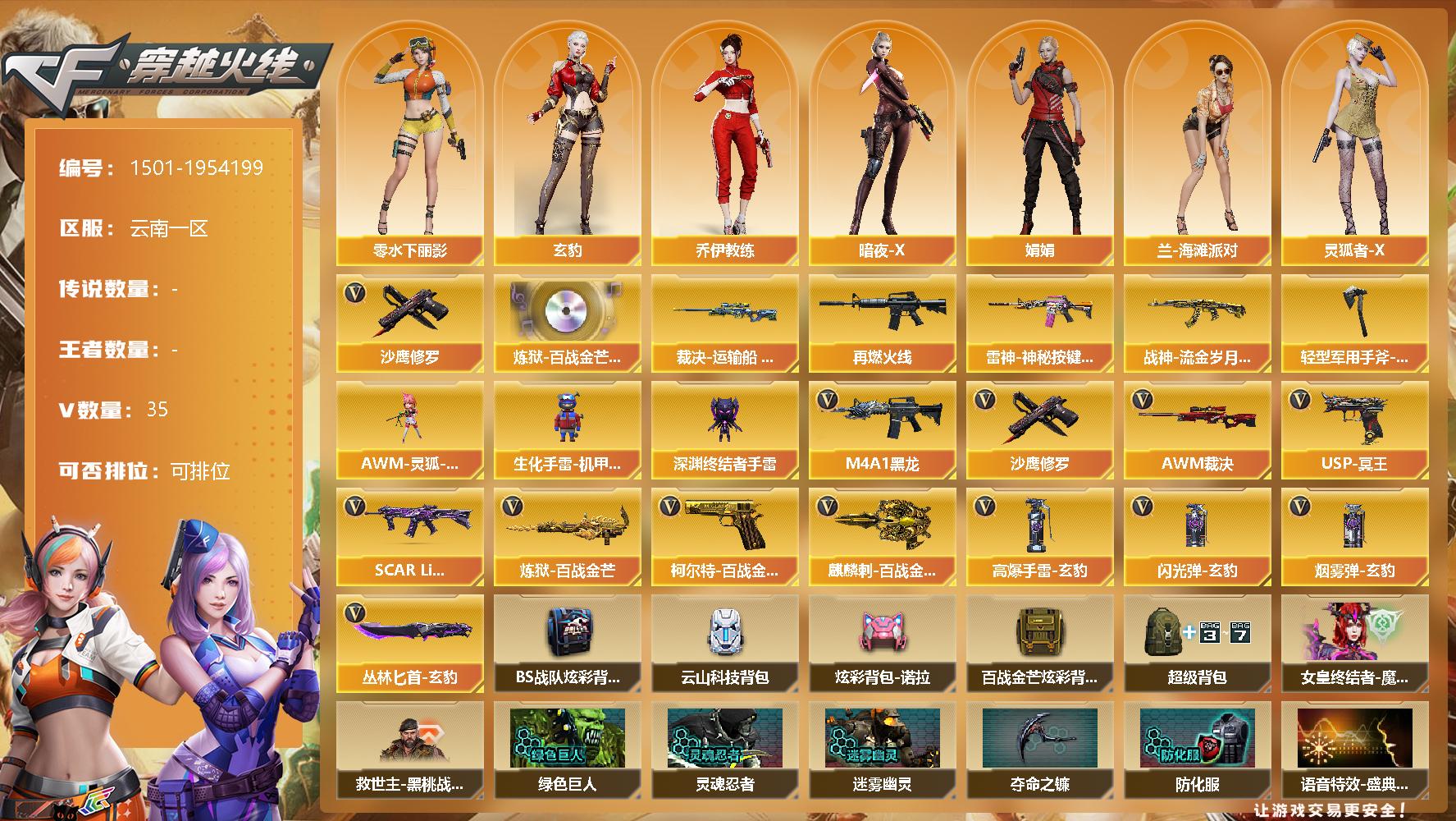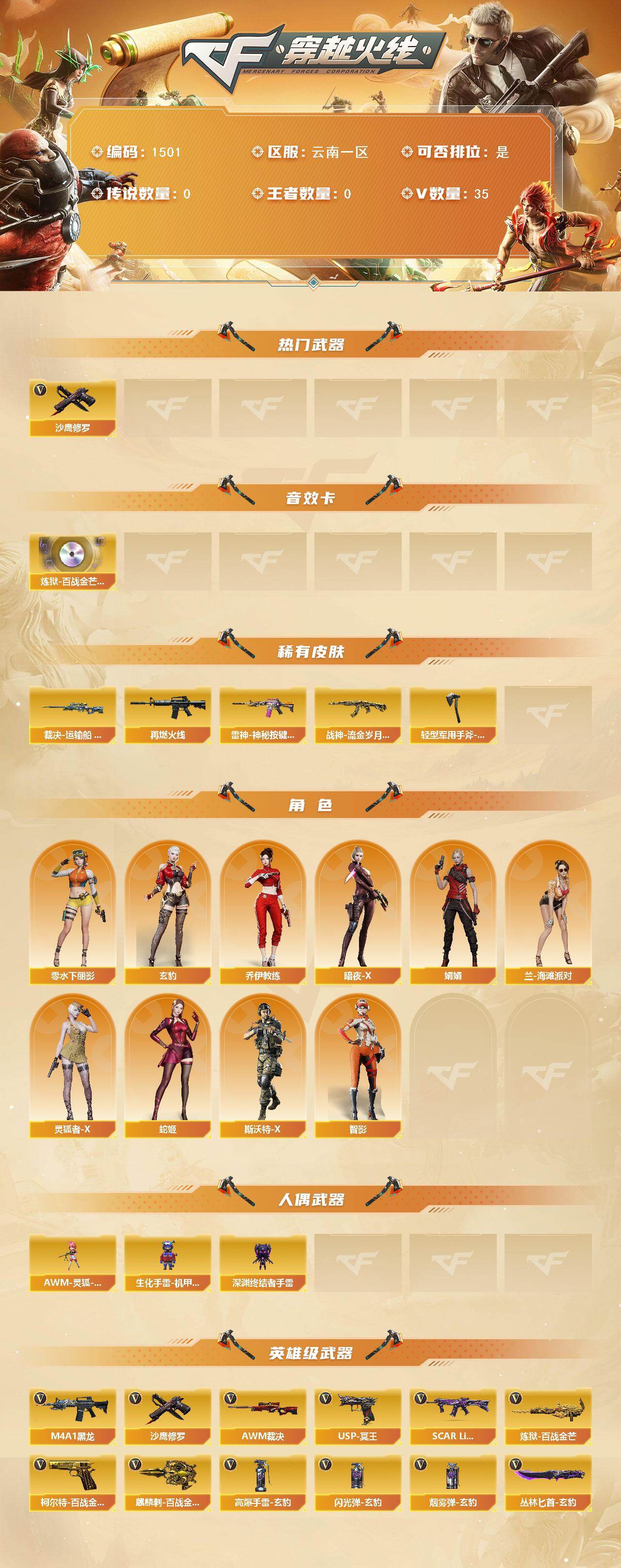 [15483424]云南一区-35V-0王者-0炫金 【热门武器】:沙鹰-修罗*2 【音效卡】:炼狱-百战金芒-庆典舞曲音效卡 【皮肤】:裁决-运输船 皮肤,M4A1-再燃火线,雷神-神秘按键 皮肤,战神-流金岁月皮肤,轻型军用手斧-再燃火线 【角色】:玄豹,乔伊教练,暗夜-X,娟娟,兰-海滩派对,零-水下丽影,灵狐者-X,蛇姬,斯沃特-X,智影 【人偶武器】:AWM-灵狐-15周年嘉年华,生化手雷-机甲核心,深
