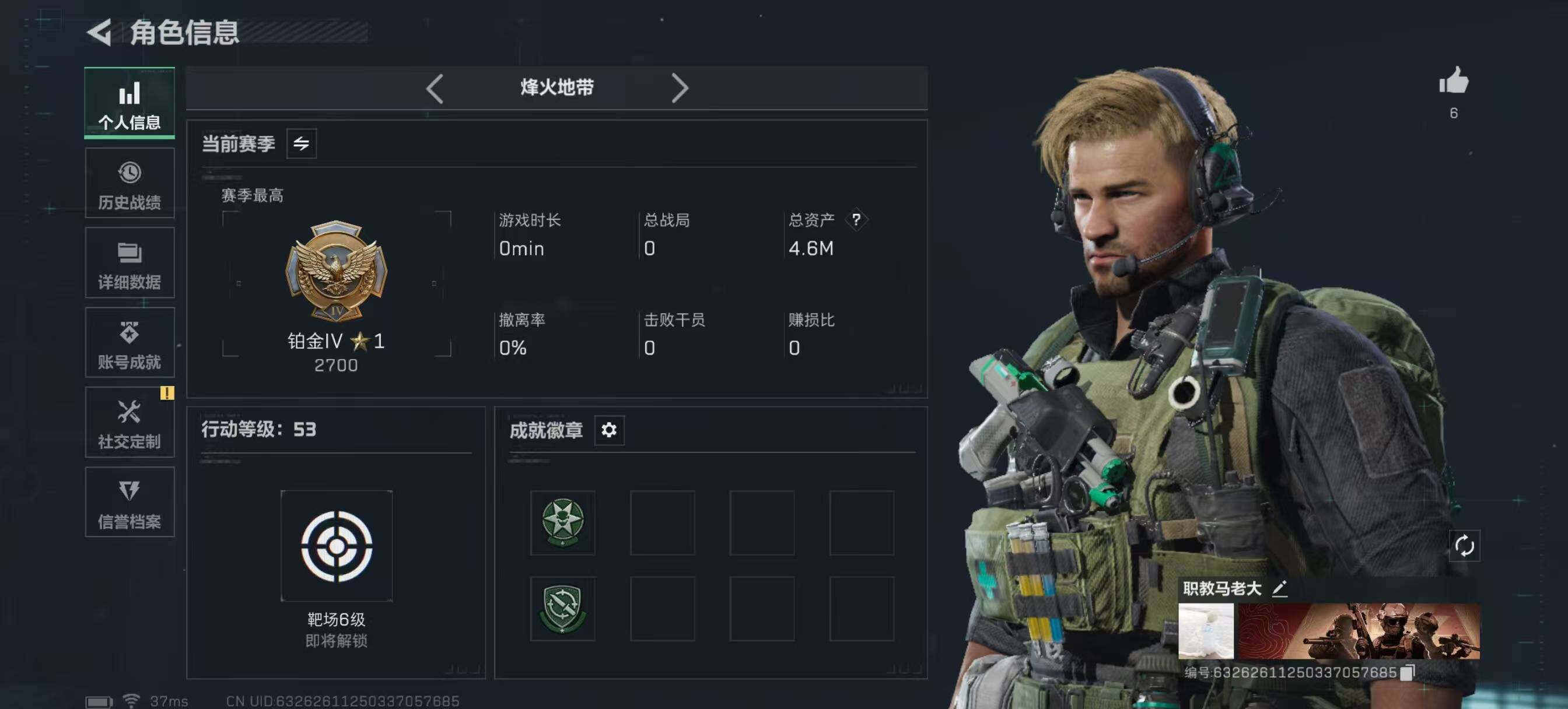 [15483470]4m总资产-2436k哈伏币-53烽火等级-铂金-1战场等级-无军衔