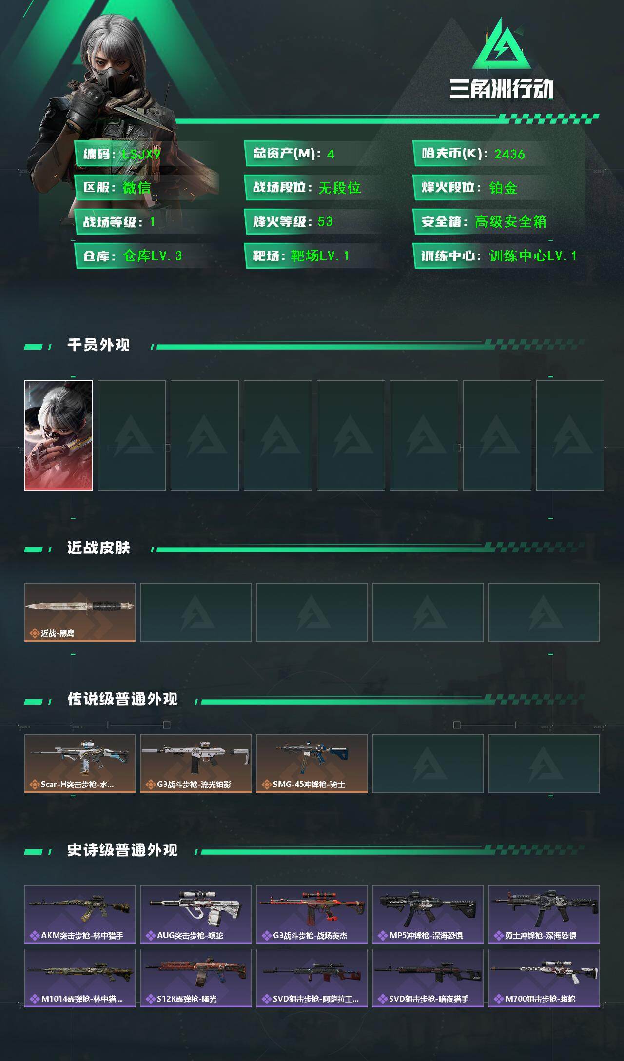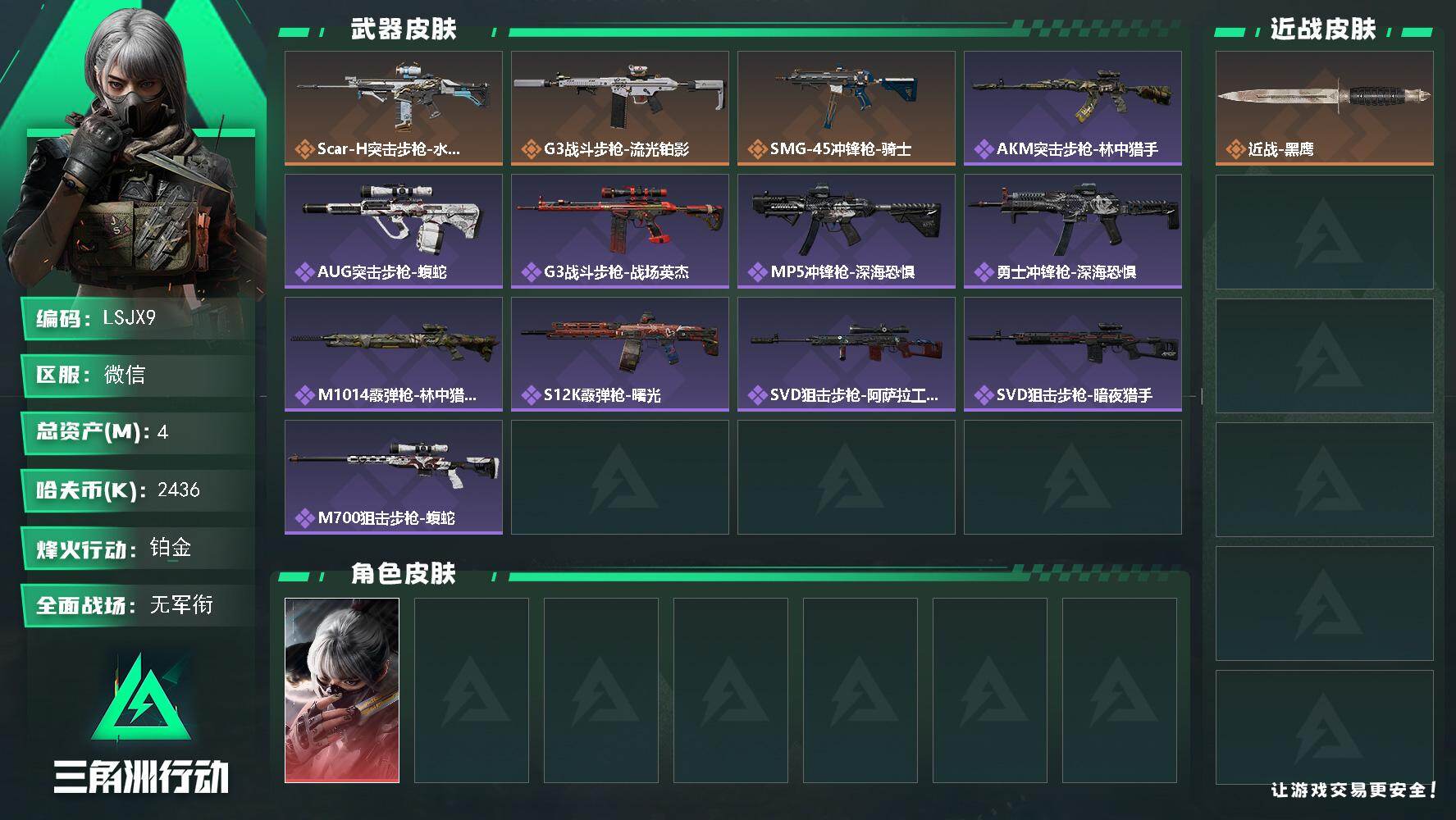 [15483470]4m总资产-2436k哈伏币-53烽火等级-铂金-1战场等级-无军衔 【干员外观】:骇爪-水墨云图 【近战皮肤】:近战-黑鹰 【传说外观】:SCAR-H战斗步枪-水墨云图,G3战斗步枪-流光铂影,SMG-45冲锋枪-骑士 【史诗外观】:AKM突击步枪-林中猎手,AUG突击步枪-蝮蛇,G3战斗步枪-战场英杰,MP5冲锋枪-深海恐惧,勇士冲锋枪-深海恐惧,M1014霰弹枪-林中猎手,S12K霰弹枪-曙光,SVD狙击步枪-阿萨拉工艺,SVD狙击步枪-暗夜猎手,M700狙击步枪-蝮蛇 【稀有外观】:M4A1突击步枪-刚枪之王,ASh-12战斗步枪-星链科技,ASh-12战斗步枪-哈夫克航天,K416突击步枪-街头涂鸦,MP5冲锋枪-弄臣,P90冲锋枪-浅鲨小队,P90冲锋枪-新生,Vector冲锋枪-先锋,Vector冲锋枪-街头涂鸦,SMG-45-行动开启,SMG-45冲锋枪-幻影结构,MP7冲锋枪-幻影结构,M1014霰弹枪-幻影结构,M1014霰弹枪-童趣,PKM通用机枪-英雄,VSS射手步枪-童趣,SKS射手步枪-弄臣,SR-25射手步枪-开拓,SR-25射手步枪-蜂窝科技,SV-98狙击步枪-星链科技,SV-98狙击步枪-哈夫克航天,SV-98狙击步枪-精英联盟,G18-星链科技,G18-哈夫克航天 【普通外观】:Mini-14射手步枪-黄铜,M4A1突击步枪-粉色涂装,M4A1突击步枪-高雅黑,M4A1突击步枪-海色,QBZ95-1突击步枪-高雅黑,QBZ95-1突击步枪-海浪,QBZ95-1突击步枪-海色,QBZ191突击步枪-三角洲力量,K416突击步枪-几何迷彩,K416突击步枪-高雅黑,AUG突击步枪-浅蓝涂装,M7战斗步枪-红色涂装,SG552突击步枪-浅蓝涂装,SG552突击步枪-海浪,AK-12突击步枪-冰川,AK-12突击步枪-落花,SCAR-H战斗步枪-数码迷彩,G3战斗步枪-高雅黑,MP5冲锋枪-安全工作,MP5冲锋枪-海色,P90冲锋枪-安全工作,Vector冲锋枪-几何迷彩,UZI冲锋枪-海色,QCQ171冲锋枪-三角洲力量,M1014霰弹枪-高雅黑,M1014霰弹枪-海浪,SV-98狙击步枪-红色涂装,.357左轮-精钢,沙漠之鹰-海浪,M1911-坚固材料 【军牌】:军牌-装备修理,军牌-夜间撤离,军牌-静谧时光,军牌-展示,军牌-