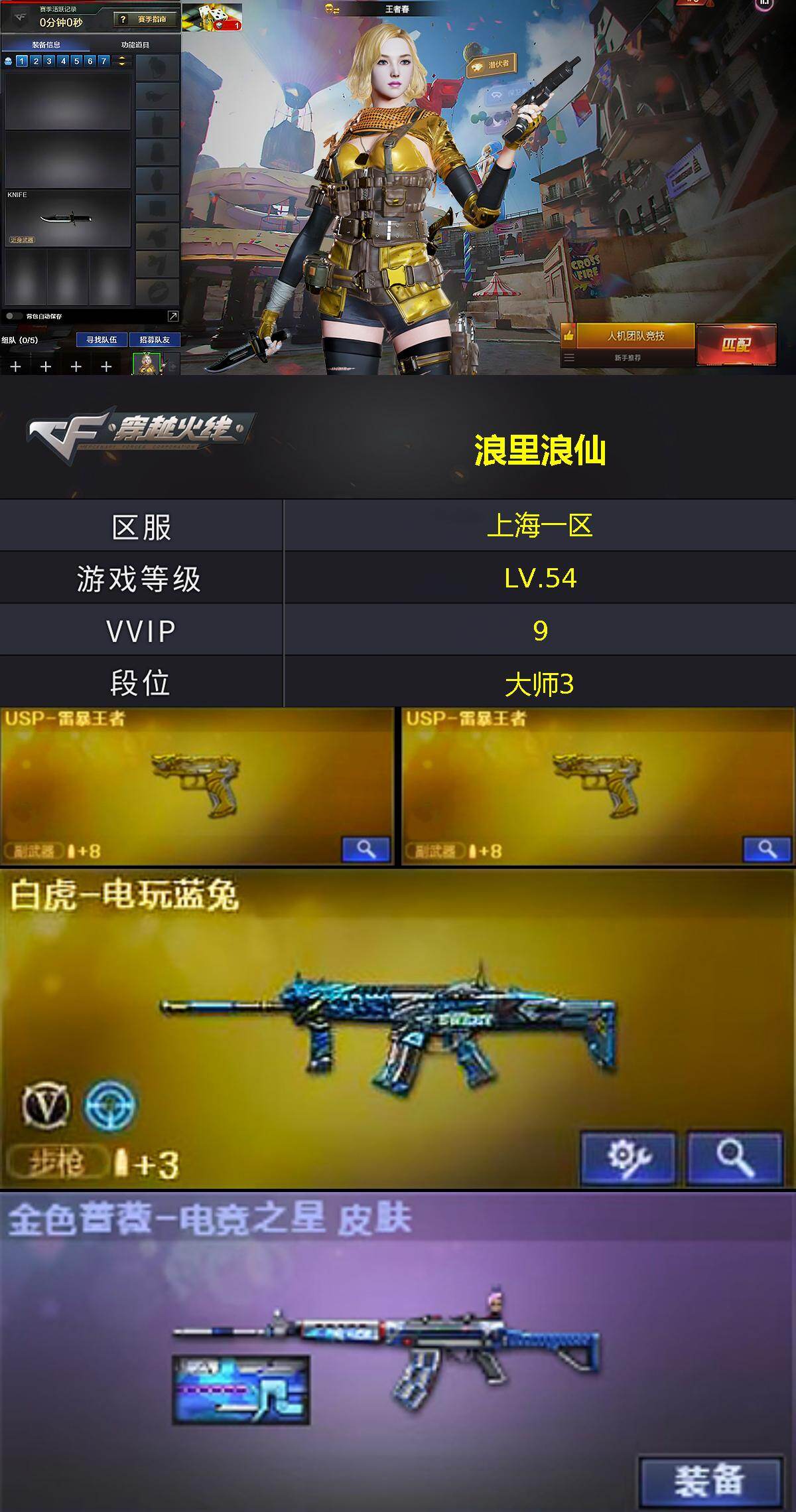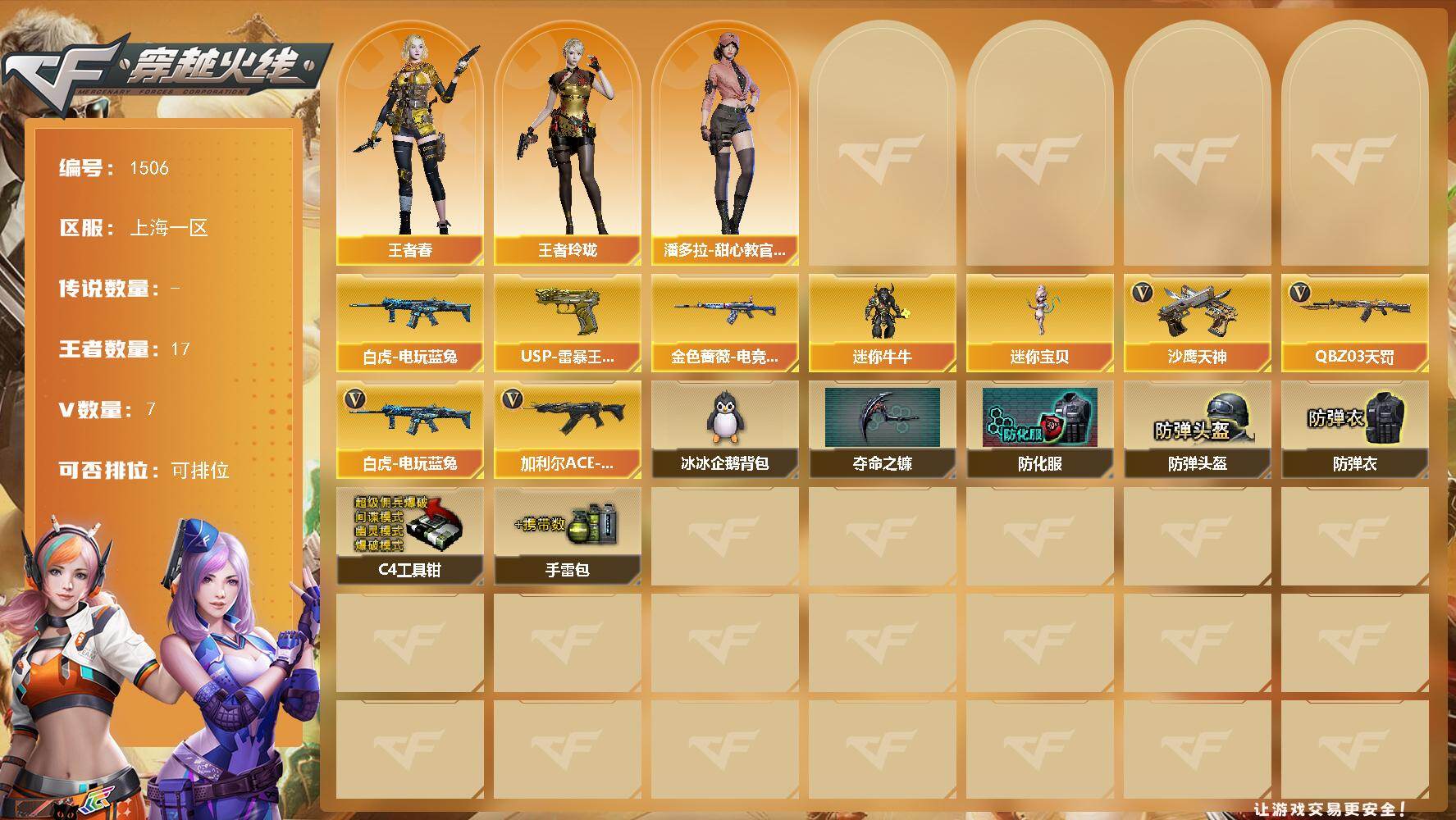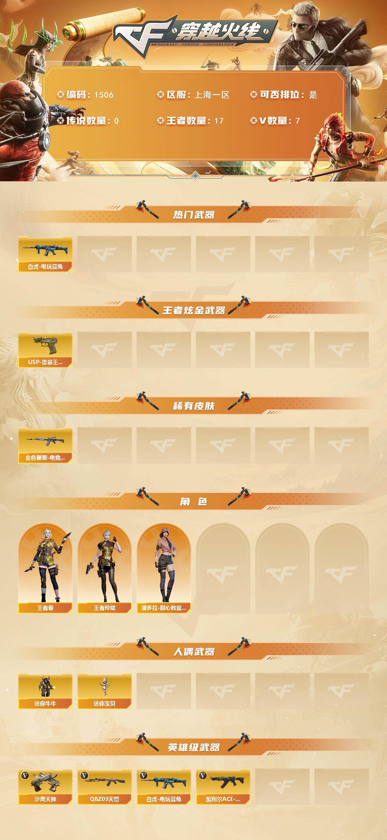 [15483610]上海一区-7V-17王者-0炫金 【热门武器】:白虎-电玩蓝兔 【王者炫金武器】:USP-雷暴王者*2 【皮肤】:金色蔷薇-电竞之星 皮肤 【角色】:王者春,王者玲珑,潘多拉-甜心教官 【人偶武器】:迷你宝贝,迷你牛牛 【英雄级武器】:QBZ03-天罚,白虎-电玩蓝兔,加利尔ACE-天袭,沙鹰-天神 【道具】:冰冰企鹅背包,夺命之镰,防化服,防弹头盔,防弹衣,C4工具钳,手雷包 【特殊枪械】:
