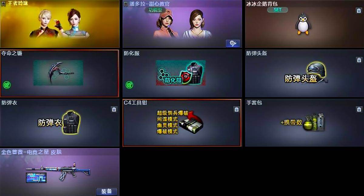 【道具】:冰冰企鹅背包,夺命之镰,防化服,防弹头盔,防弹衣,C4工具钳,手雷包