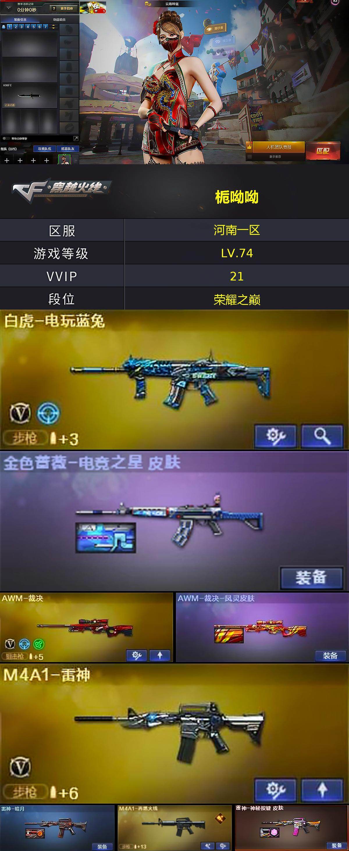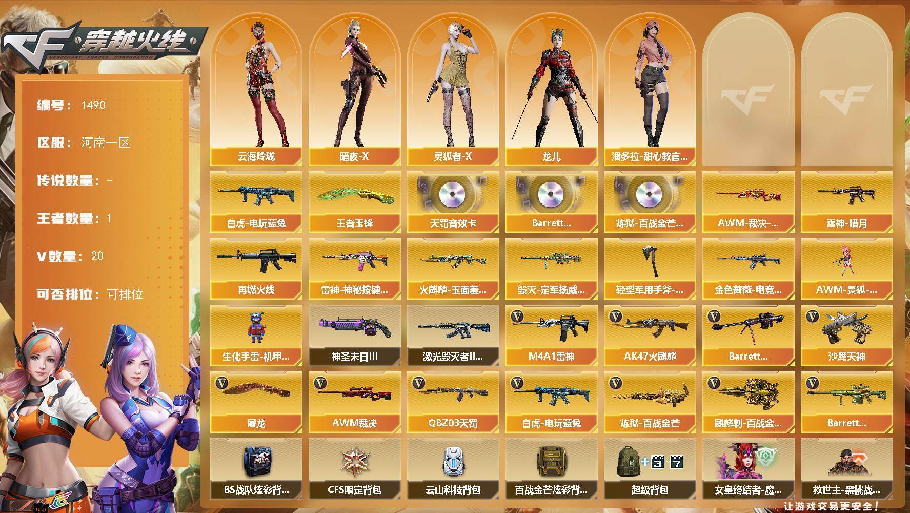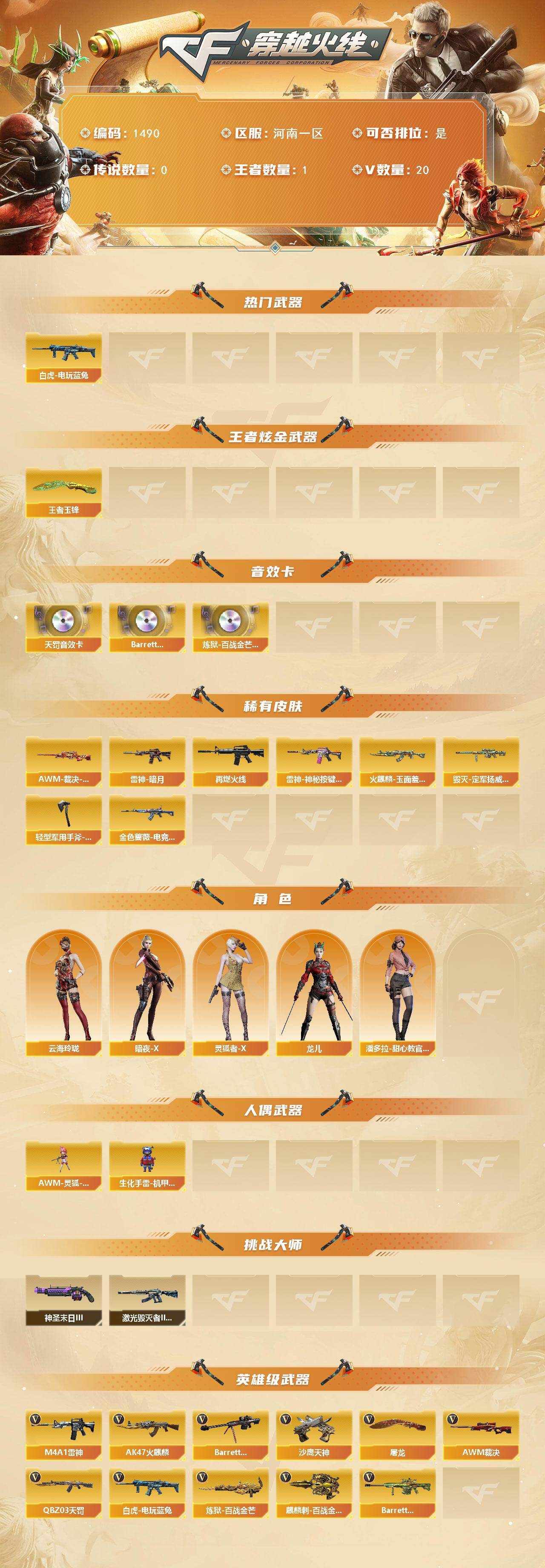 [15484033]河南一区-20V-1王者-0炫金 【热门武器】:白虎-电玩蓝兔 【王者炫金武器】:王者玉锋 【音效卡】:QBZ03-天罚音效卡,Barrett-碧霄极光音效卡,炼狱-百战金芒-庆典舞曲音效卡 【皮肤】:金色蔷薇-电竞之星 皮肤,AWM-裁决-凤灵皮肤,雷神-暗月,M4A1-再燃火线,雷神-神秘按键 皮肤,火麒麟-玉面羞花 皮肤,毁灭-定军扬威 皮肤,轻型军用手斧-再燃火线 【角色】:云海玲珑,暗夜-X,灵狐者-X,龙儿,潘多拉-甜心教官 【人偶武器】:AWM-灵狐-15周年嘉年华,生化手雷-机甲核心 【挑战大师】:激光毁灭者III-白马银枪,神圣爆裂者-末日III 【英雄级武器】:AK47-火麒麟,M4A1-雷神,QBZ03-天罚*2,白虎-电玩蓝兔,Barrett-毁灭,AWM-裁决,炼狱-百战金芒,沙鹰-天神*3,屠龙,麒麟刺-百战金芒,Barrett-碧霄极光 【道具】:BS战队炫彩背包,CFS限定背包,云山科技背包,百战金芒炫彩背包,超级背包,女皇终结者-魔龙之吻,救世主-黑桃战神,绿色巨人,灵魂忍者,迷雾幽灵,夺命之镰*2,防化服*3,流光-鎏金之域,流光-再燃火线,语音特效-盛典烟火,萌萌小葵表情,防弹头盔*3,防弹衣*3,C4工具钳*3,手雷包*3 【特殊枪械】: