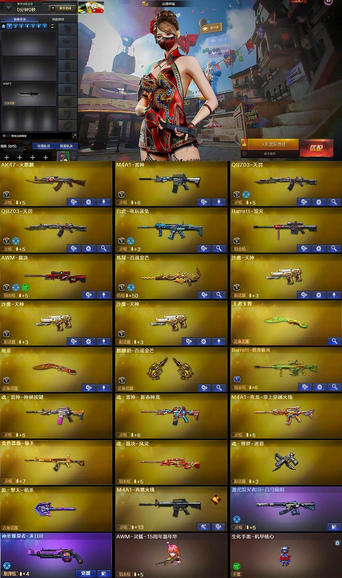 【英雄级武器】:AK47-火麒麟,M4A1-雷神,QBZ03-天罚*2,白虎-电玩蓝兔,Barrett-毁灭,AWM-裁决,炼狱-百战金芒,沙鹰-天神*3,屠龙,麒麟刺-百战金芒,Barrett-碧霄极光