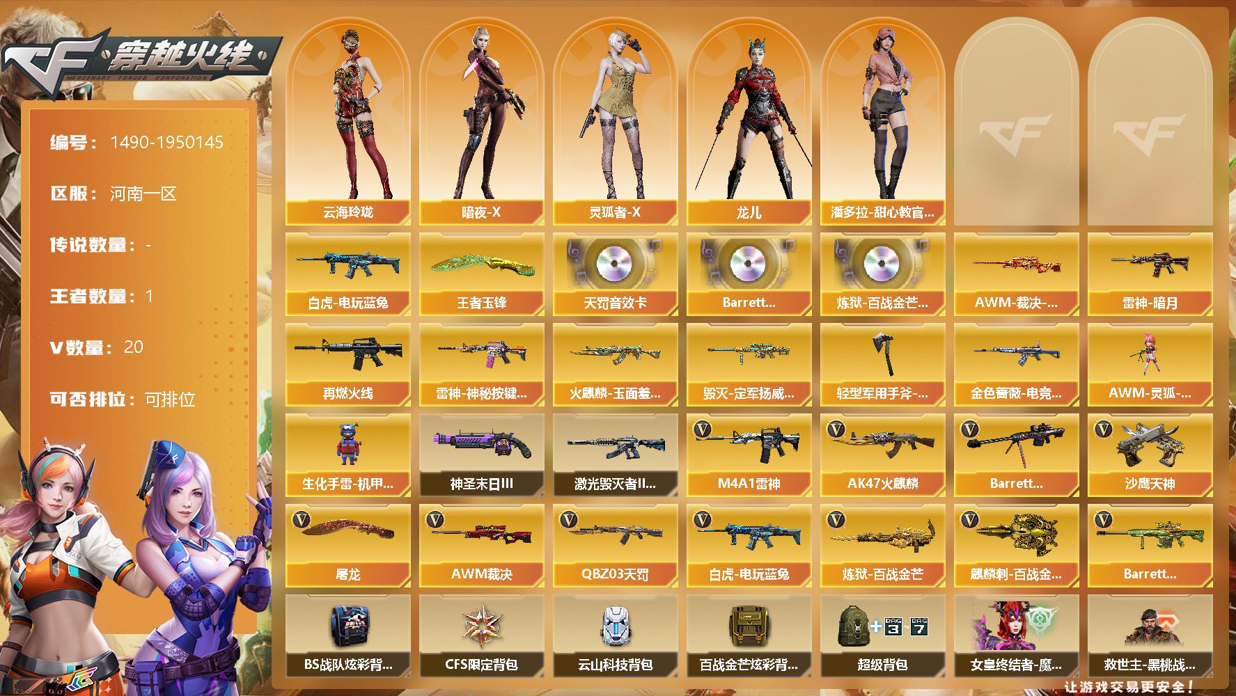 - [14611103]河南一区-45V-3王者-1炫金 【热门武器】:QBZ03-金色蔷薇,M200-幻神,Cat-刀锋,炼狱-迷你小钢,M4A1-黑骑士,斯泰尔-蝴蝶,USP-雷暴,金刚伞*2 【王者炫金武器】:炫金骑士 【音效卡】:M4A1-黑骑士音效卡 【皮肤】:幻神-宠儿-2021MVP,M200-幻神-N9-2022MVP,幻神-电流骇客 皮肤,雷神-暗月,雷神-荣耀之魄,雷神-宠儿-2019MVP,雷神-源计划2.0专属 皮肤,雷神-化蛇 皮肤,火麒麟-冠军之心,火麒麟-平天大圣,火麒麟-心动糖果,毁灭耀金皮肤,毁灭-星空,毁灭-秦师 皮肤,黑骑士-暗月,黑骑士-破浪10年皮肤,屠龙-荣耀之锋 【角色】:魅影,司雨,王者-葵-貂蝉,奇洋探员,乔伊教练,修道士,云海玲珑,暗夜-X,初恋灵狐,电竞少女,芳心审判者,飞虎队-X,风暴女,虎妞,嘉年华灵狐,娟娟,零-水下丽影,灵狐-花神,灵狐者-X,龙儿-小淘气,麻雀,曼陀罗-X,曼陀罗-礼服,萌儿,女主播,潘多拉-X,青霞仙子,斯沃特-X,兔囡囡,维纳斯,夜玫瑰-宠粉,樱-战斗天使,游珑儿 【人偶武器】:M4A1-雷神-精英刀锋,炼狱-迷你小钢,斯泰尔-蝴蝶,AWM-灵狐-15周年嘉年华*2,COP-旗袍,Cat-刀锋,迷你深渊冰龙*2,迷你裂空之翼*5,迷你波特博士*16,迷你曼提柯尔,夺魂*3,迷你牛牛*3,迷你火种*16,迷你生化手雷,生化手雷-机甲核心,深渊终结者手雷*2,迷你巨石泰坦-魔花研究所 【暴走生化】:黑龙吞噬者,双面神,超级对讲机 【挑战大师】:神圣爆裂者III*4,冰龙粉碎者-白马银枪,激光毁灭者III-白马银枪*2,VEPR-12-金魔,激光毁灭者III,机甲撕裂者III*2,试炼破坏者III,阐释者III*2,VEPR-12-紫魔*2 【英雄级武器】:M4A1-雷神*2,M4A1-黑骑士,无影-神兵利器,黑武士-锦绣游龙,超新星-热带奇洋,QBZ03-金色蔷薇,烈火-动感闪耀,白虎之魄-觉醒版,Barrett-毁灭,M200-幻神,王者凰鸣-觉醒版,烈龙-云海游龙,USP-雷暴,天神-动感闪耀,幻灵之锋,屠龙-动感闪耀,擎天-云海游龙,龙啸-热带奇洋,斩神刀-雷暴,高爆手雷-雷暴*4,高爆手雷-幻灵,高爆手雷-竞技荣光*2,手雷-动感闪耀,手雷-云海游龙,手雷-热带奇洋,闪光弹-雷暴*4,闪光弹-幻灵,闪