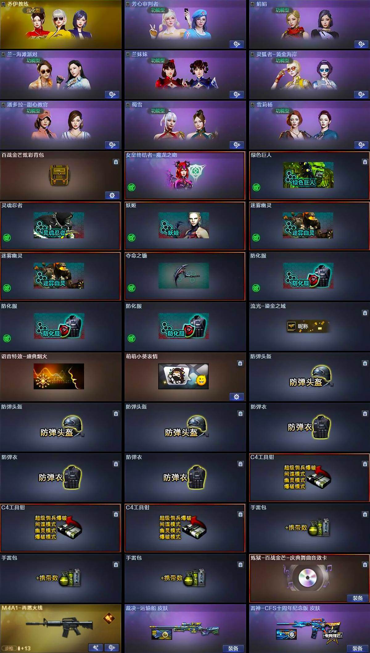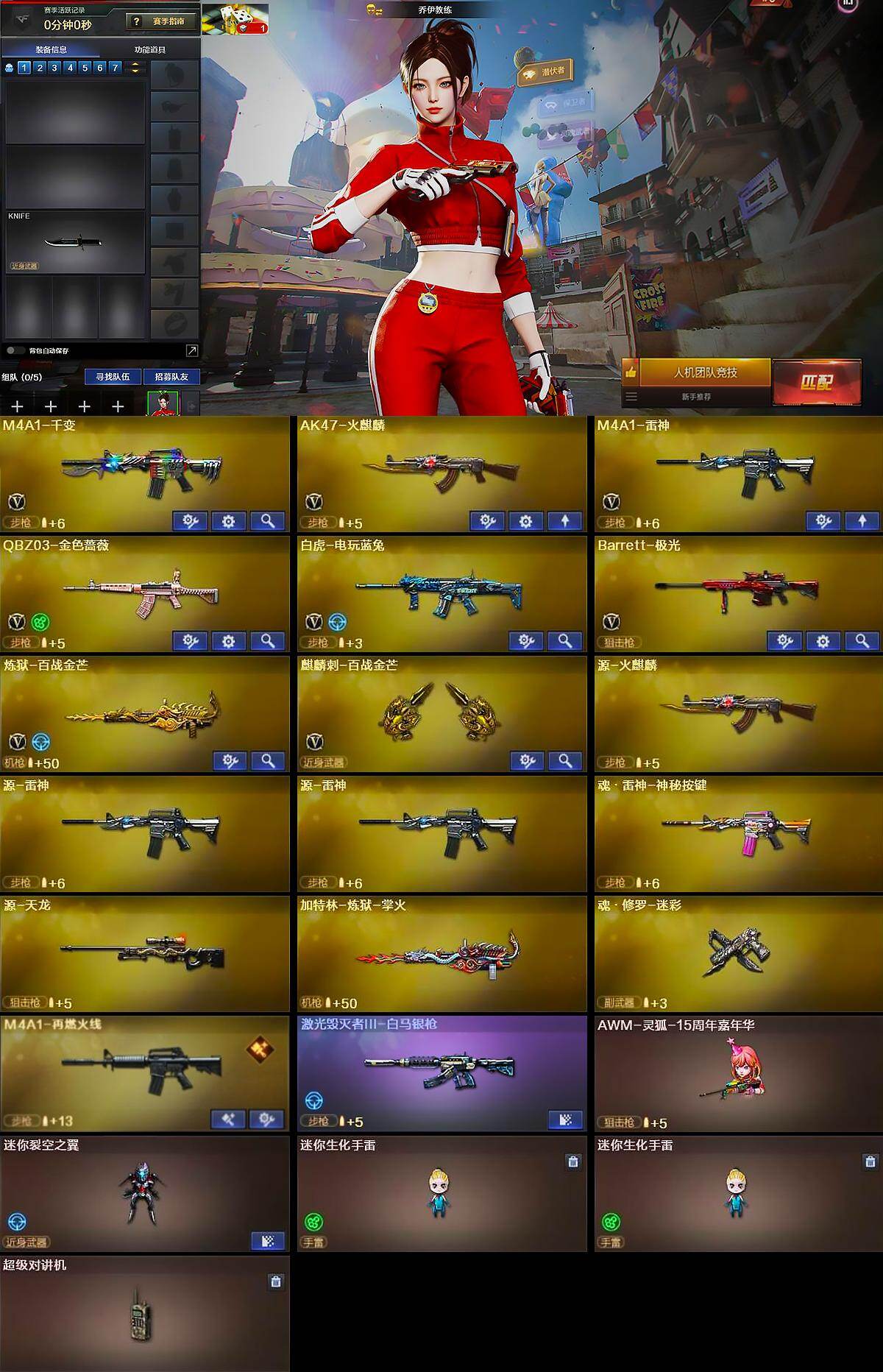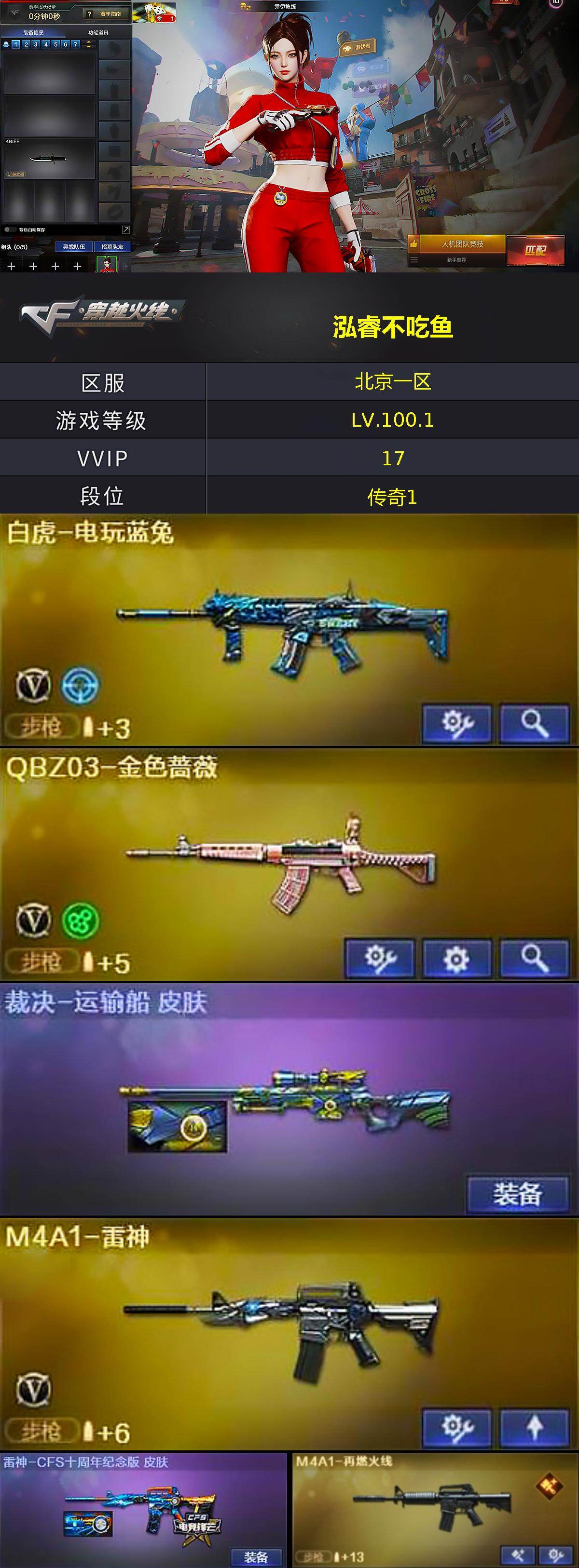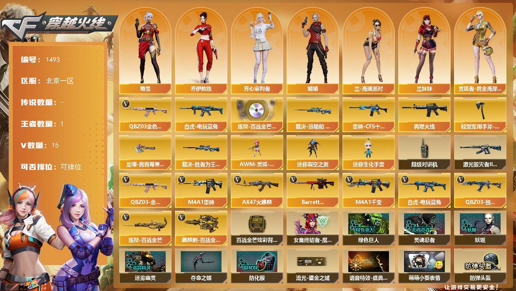 [15484229]北京一区-15V-1王者-0炫金 【热门武器】:QBZ03-金色蔷薇,白虎-电玩蓝兔 【音效卡】:炼狱-百战金芒-庆典舞曲音效卡 【皮肤】:裁决-运输船 皮肤,裁决-胜者为王 皮肤,雷神-CFS十周年纪念版 皮肤,M4A1-再燃火线,轻型军用手斧-再燃火线,龙啸-青青莓果 皮肤 【角色】:乔伊教练,芳心审判者,娟娟,兰-海滩派对,兰妹妹,灵狐者-黄金海岸,潘多拉-甜心教官,蜀雪,雪莉杨 【人偶