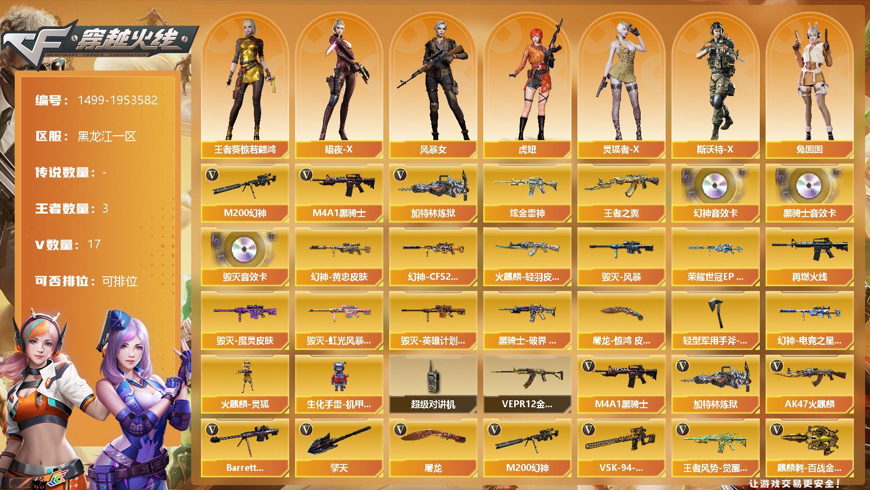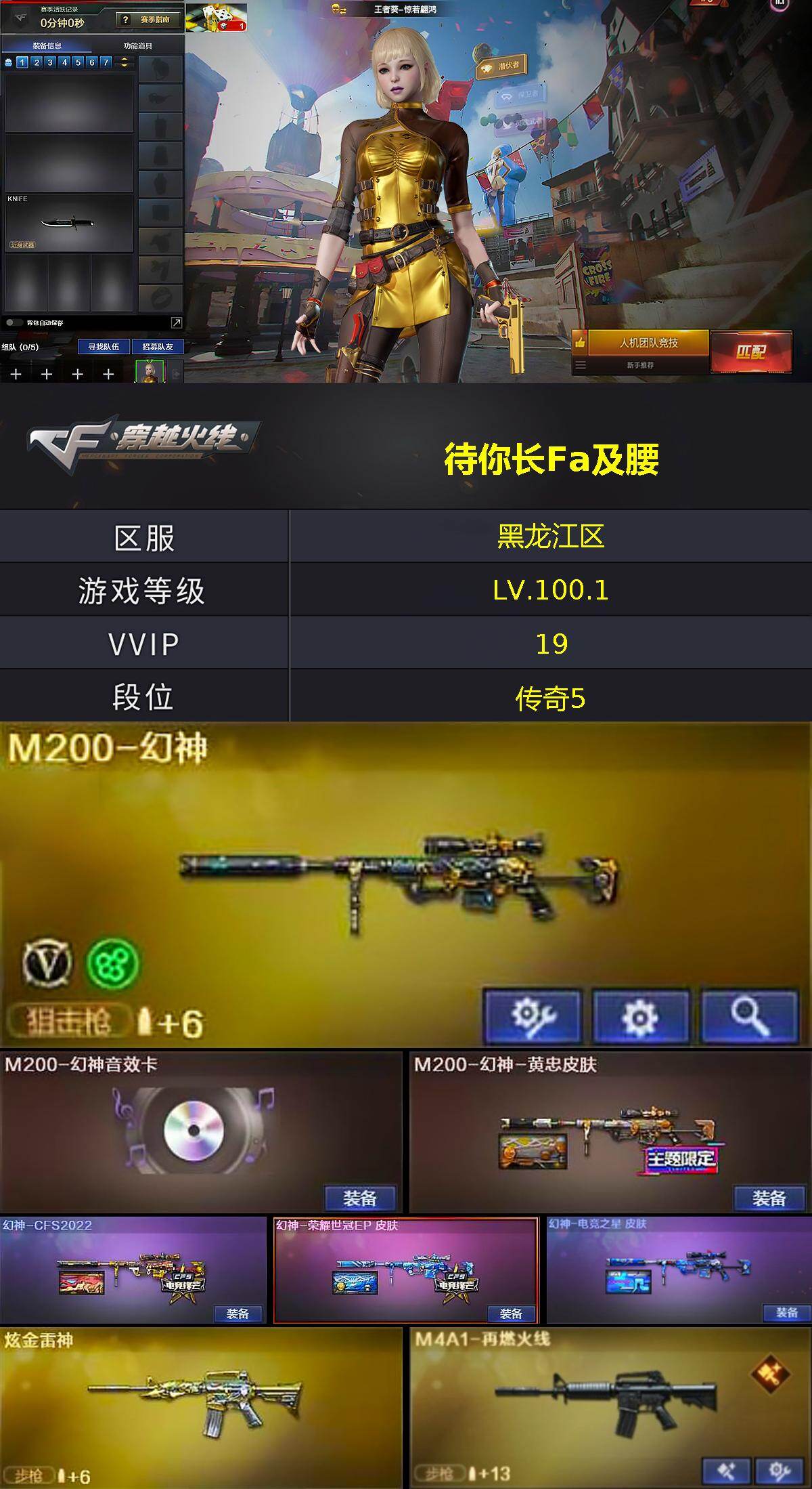 [15484436]黑龙江区-17V-3王者-1炫金 【热门武器】:M200-幻神,M4A1-黑骑士,加特林-炼狱 【王者炫金武器】:王者之翼,炫金雷神 【音效卡】:M200-幻神音效卡,M4A1-黑骑士音效卡,Barrett-毁灭音效卡 【皮肤】:M200-幻神-黄忠皮肤,幻神-CFS2022,幻神-荣耀世冠EP 皮肤,幻神-电竞之星 皮肤,M4A1-再燃火线,火麒麟-轻羽皮肤,毁灭-风暴,毁灭-魔灵皮肤,毁灭