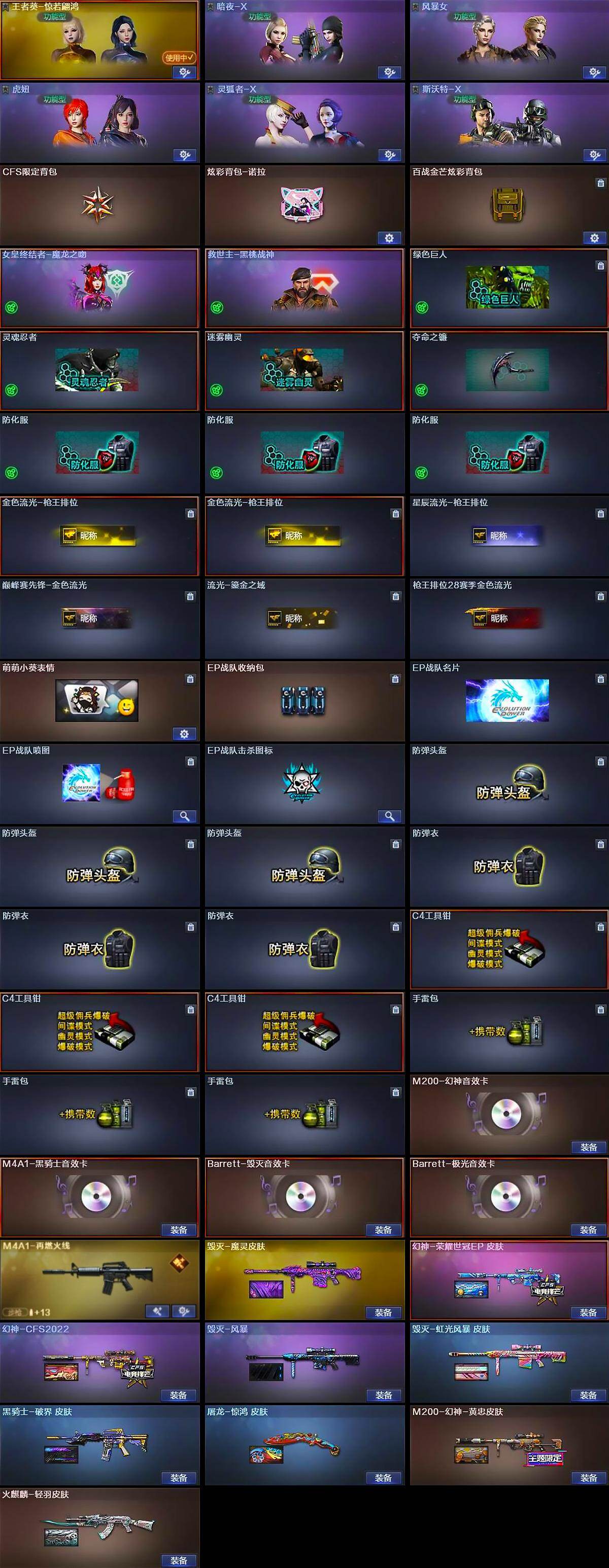 【皮肤】:M200-幻神-黄忠皮肤,幻神-CFS2022,幻神-荣耀世冠EP 皮肤,幻神-电竞之星 皮肤,M4A1-再燃火线,火麒麟-轻羽皮肤,毁灭-风暴,毁灭-魔灵皮肤,毁灭