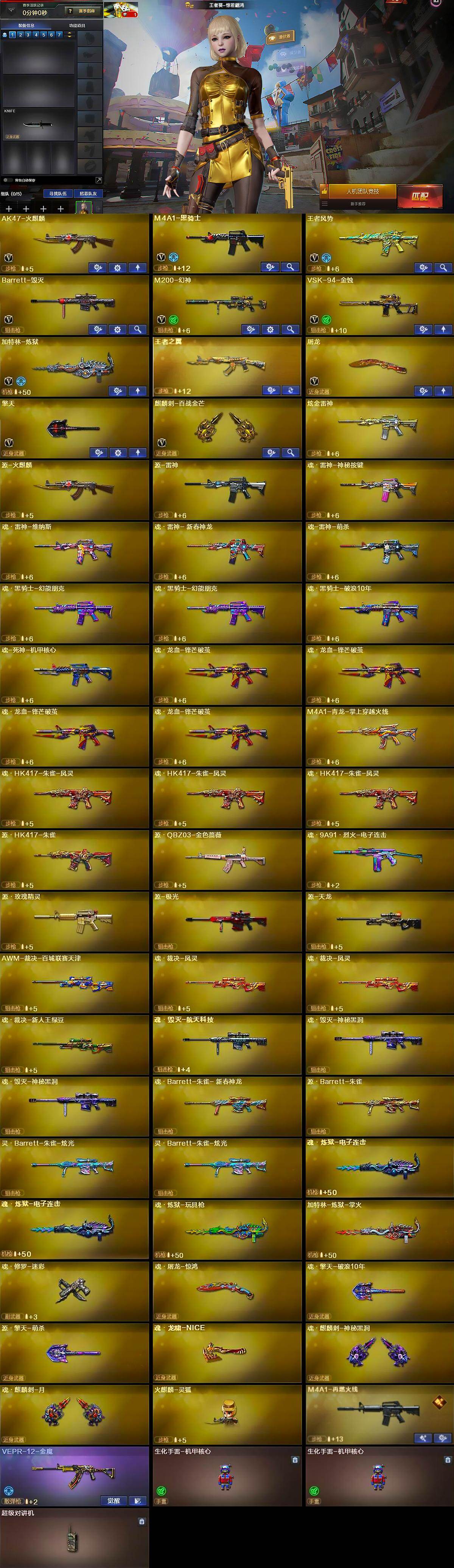 - [12951327]安徽一区-110V-29王者-5炫金 【传说武器】:传说光耀,传说暗裔,传说梦魇 【热门武器】:传说光耀,传说暗裔,传说梦魇,QBZ03-金色蔷薇*2,Scar Light-白虎,M4A1-青龙,M200-竞技荣光*3,M4A1-黑骑士*2,汤姆逊-烈龙*4,RPK-盘龙*4,加特林-炼狱,裁决-雪莉杨,USP-雷暴,COP-堕天神*2,COP 357-幻灵,沙鹰-修罗*7 【王者炫金武器】:炫金火麒麟,炫金无影,炫金天龙,炫金毁灭,炫金雷神,王者雷怒 【音效卡】:AK47-火麒麟音效卡,Barrett-毁灭音效卡,Scar Light-白虎音效卡 【稀有皮肤】:幻神-周瑜皮肤,Scar Light-白虎-暗星,雷神-荣耀之魄,雷神-宠儿-2019MVP,AK47-火麒麟-传奇EVEN,毁灭-黑大圣皮肤,AWM-天龙-传奇70KG,AWM-天龙-传奇白鲨,屠龙-荣耀世冠AG*2 【角色】:王者玲珑,零-水下丽影,灵狐者-职业经理,审判者,幽,电竞教官-云悠悠 【人偶武器】:裁决-雪莉杨,M37-葵,迷你生化手雷,深渊终结者手雷 【暴走生化】:超级对讲机 【挑战大师】:阐释者III*2,VEPR-12-金魔*2,冰龙粉碎者-白马银枪 【英雄级武器】:M200-竞技荣光*3,柯尔特-竞技荣光*7,擎天-竞技荣光*4,高爆手雷-竞技荣光*4,烟雾弹-竞技荣光*5,闪光弹-竞技荣光*3,COP 357-幻灵,幻灵之锋,M4A1-夜魔,破空枪刃-夜魔,马来剑-夜魔,COP-堕天神*2,USP-雷暴,M4A1-武圣,Glock18-武圣,QBZ03-金色蔷薇*2,Scar Light-白虎,M4A1-青龙,M4A1-雷神,M4A1-玫瑰精灵,M4A1-黑骑士*2,M4A1-死神,RPK-盘龙*4,加特林-炼狱,汤姆逊-烈龙*4,AK47-无影,AK47-火麒麟,AK12-天启,AN94-超新星*3,Barrett-毁灭,Barrett-极光,AWM-裁决,M4A1-赤狱骑士,沙鹰-天神*2,沙鹰-修罗*7,龙啸,屠龙*5 【特殊枪械】:1白虎,2黑骑士,4烈龙,4盘龙,1炼狱