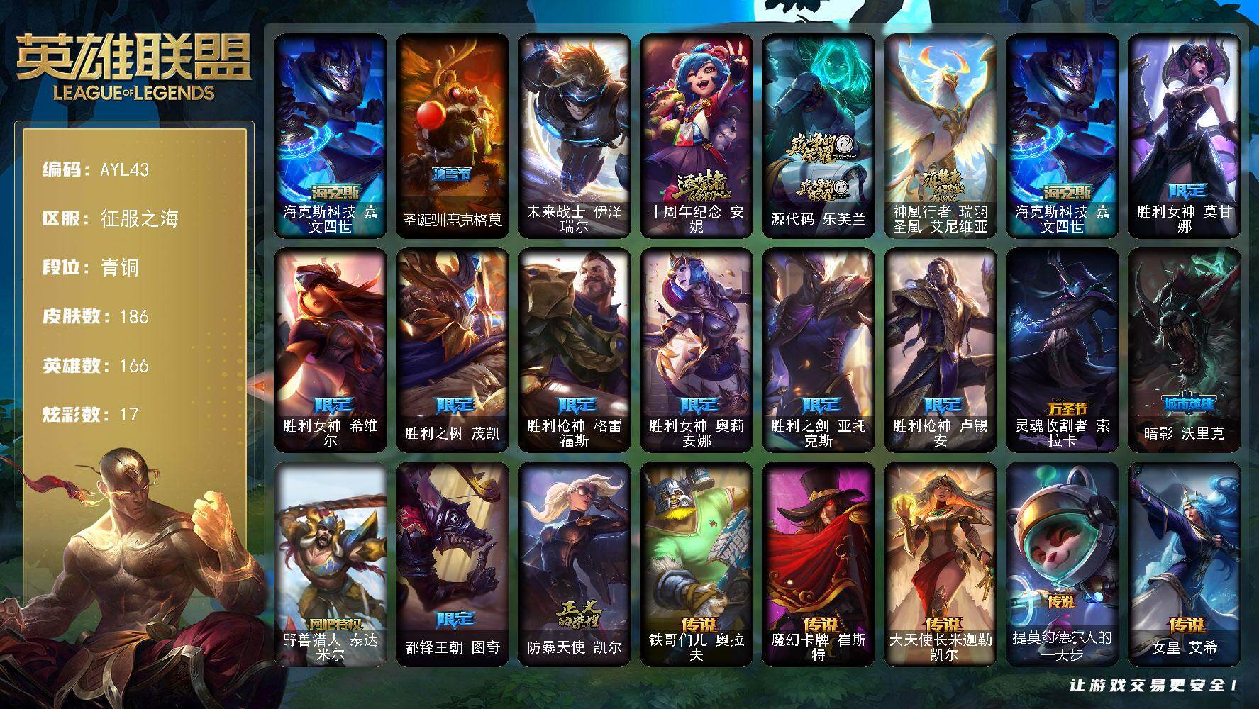 [15420746]可二次【店主推荐捡漏号!可直接换绑】青铜段位-166英雄-186皮肤-17炫彩-1终极-4神话-13限定-22传说-53史诗