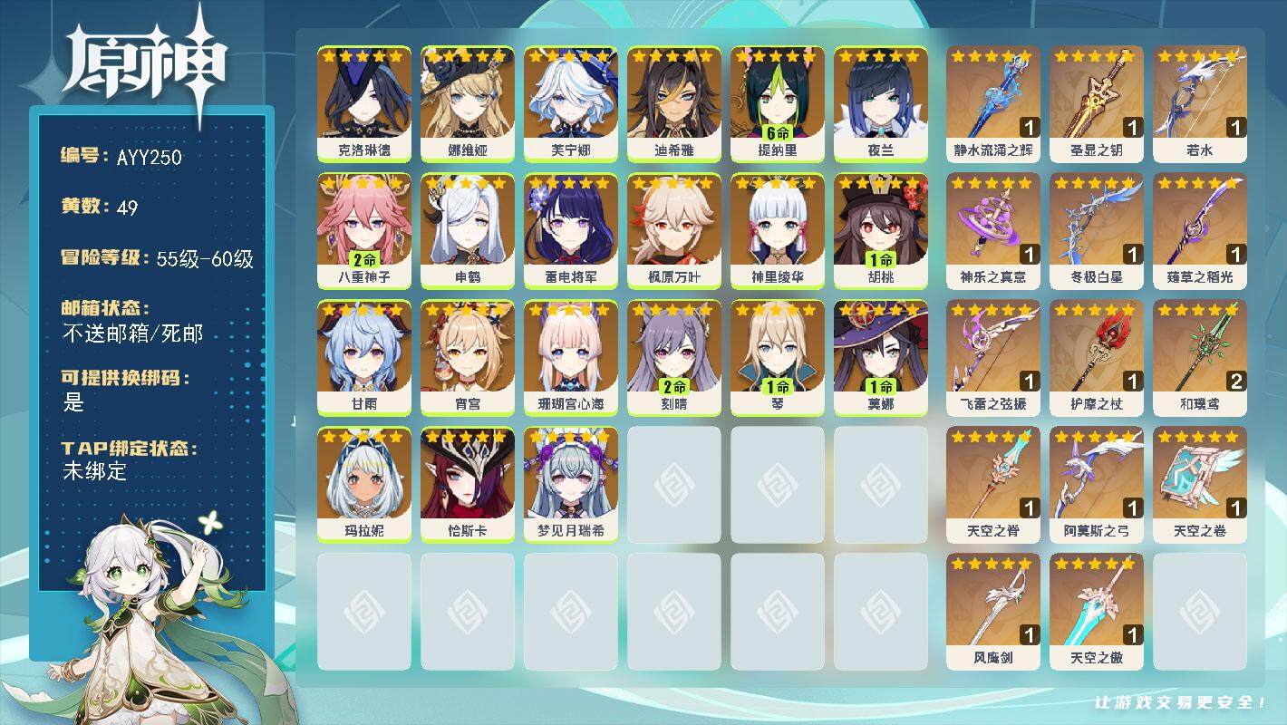 [15486803]60级/49黄/女主/21个五星角色/14个五星武器 0命克洛琳德,0命娜维娅,0命芙宁娜,0命迪希雅,满命提纳里,0命夜兰,2命八重神子,0命申鹤,0命雷电将军,0命枫原万叶,0命神里绫华,1命胡桃,0命甘雨,0命宵宫,0命珊瑚宫心海,2命刻晴,1命琴,1命莫娜,0命玛拉妮,0命恰斯卡,0命梦见月瑞希,精1静水流涌之辉,精1圣显之钥,精1若水,精1神乐之真意,精1冬极白星,精1薙草之稻光,精1飞雷之弦振,精1护摩之杖,精2和璞鸢,精1天空之脊,精1阿莫斯之弓,精1天空之卷,精1风鹰剑,精1天空之傲