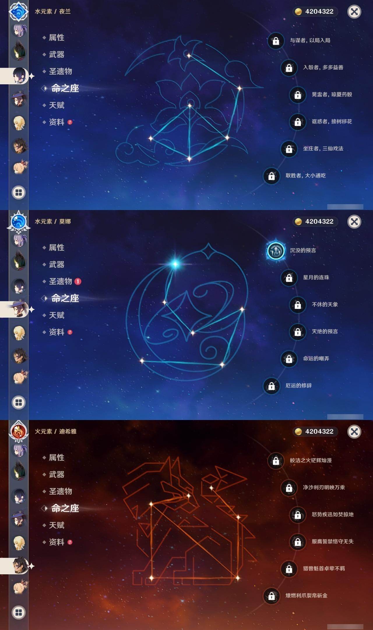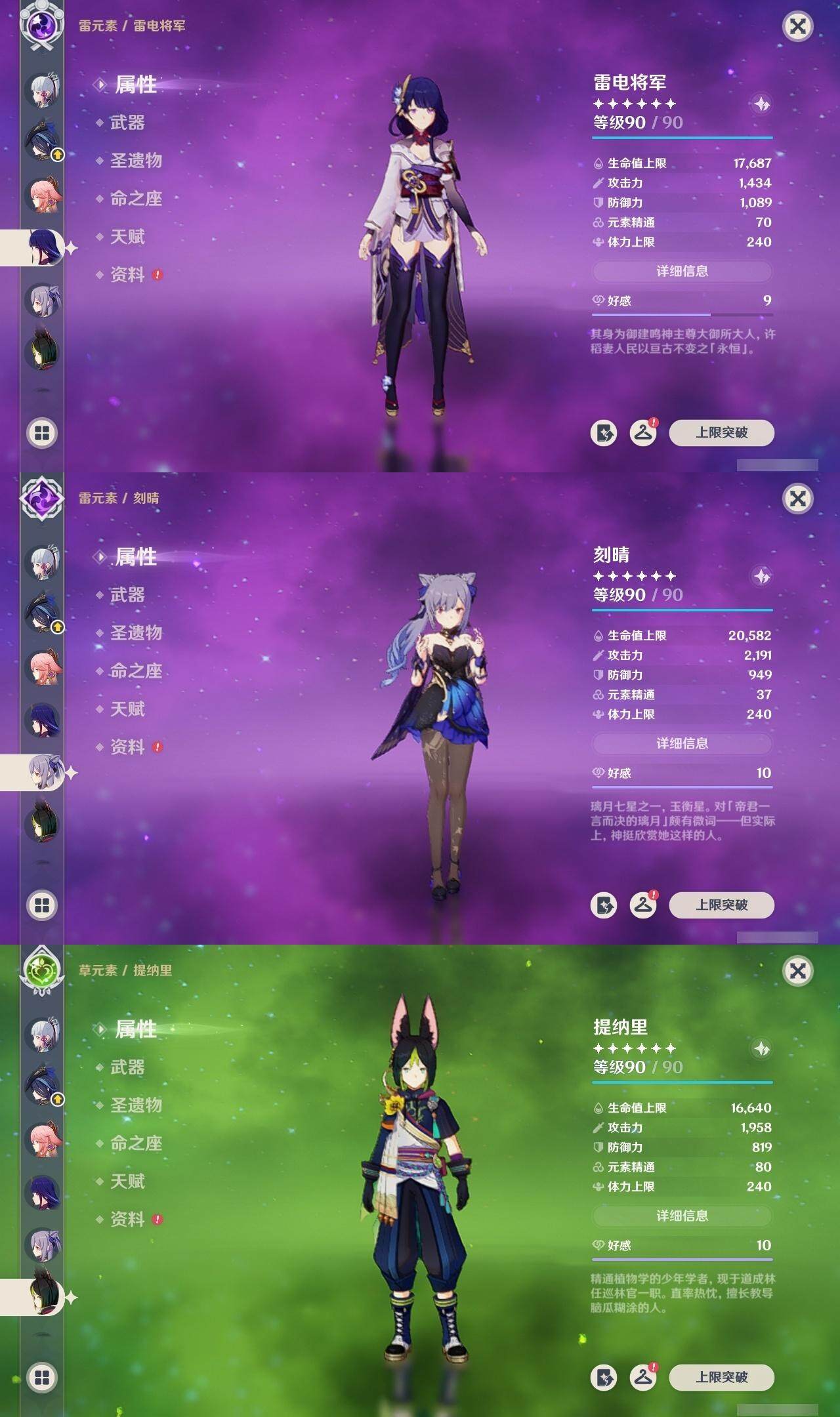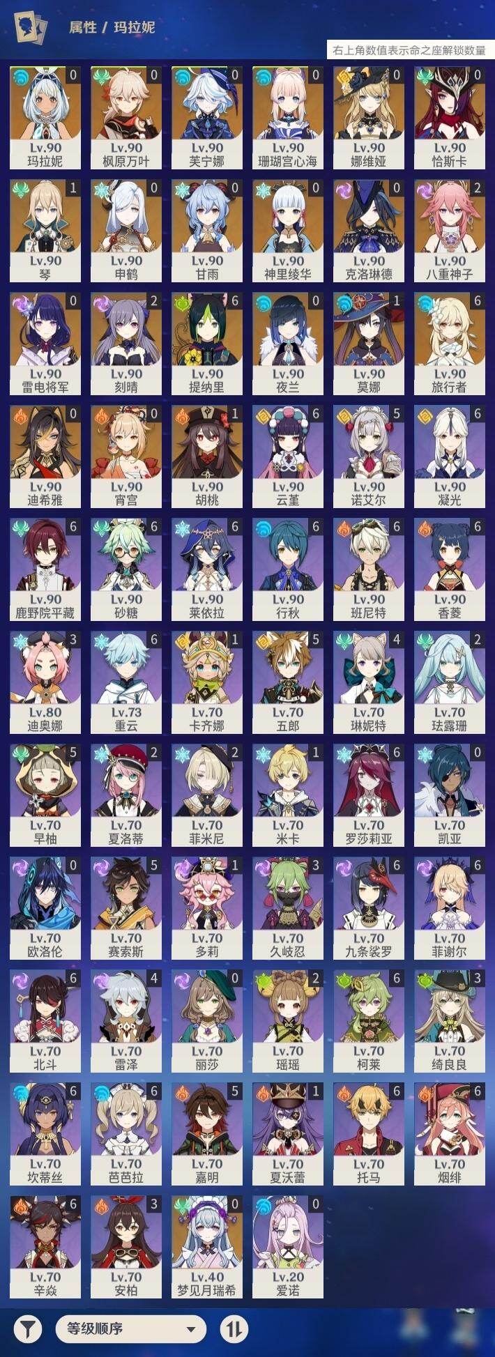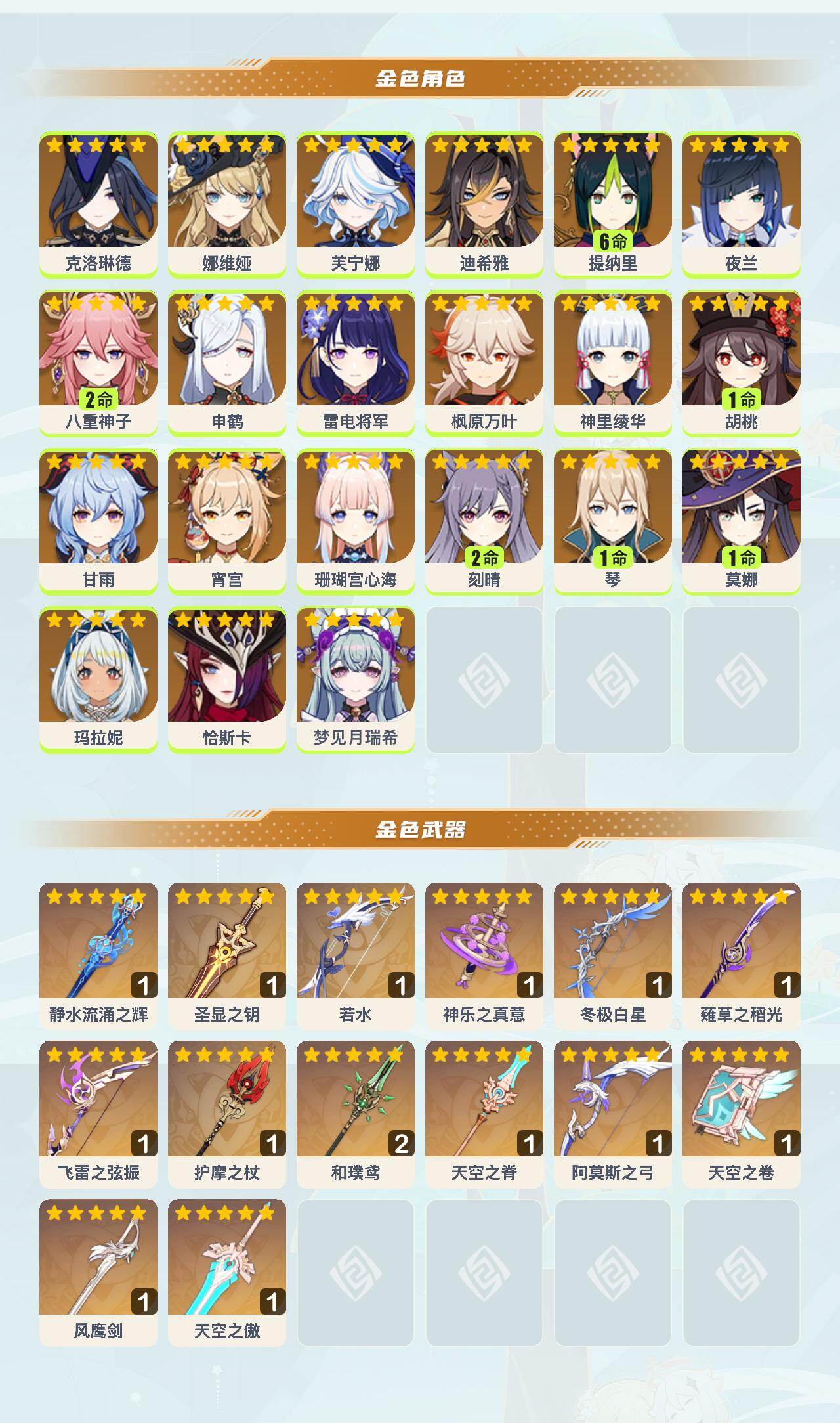 0命克洛琳德,0命娜维娅,0命芙宁娜,0命迪希雅,满命提纳里,0命夜兰,2命八重神子,0命申鹤,0命雷电将军,0命枫原万叶,0命神里绫华,1命胡桃,0命甘雨,0命宵宫,0命珊瑚宫心海,2命刻晴,1命琴,1命莫娜,0命玛拉妮,0命恰斯卡,0命梦见月瑞希,精1静水流涌之辉,精1圣显之钥,精1若水,精1神乐之真意,精1冬极白星,精1薙草之稻光,精1飞雷之弦振,精1护摩之杖,精2和璞鸢,精1天空之脊,精1阿莫斯之弓,精1天空之卷,精1风鹰剑,精1天空之傲