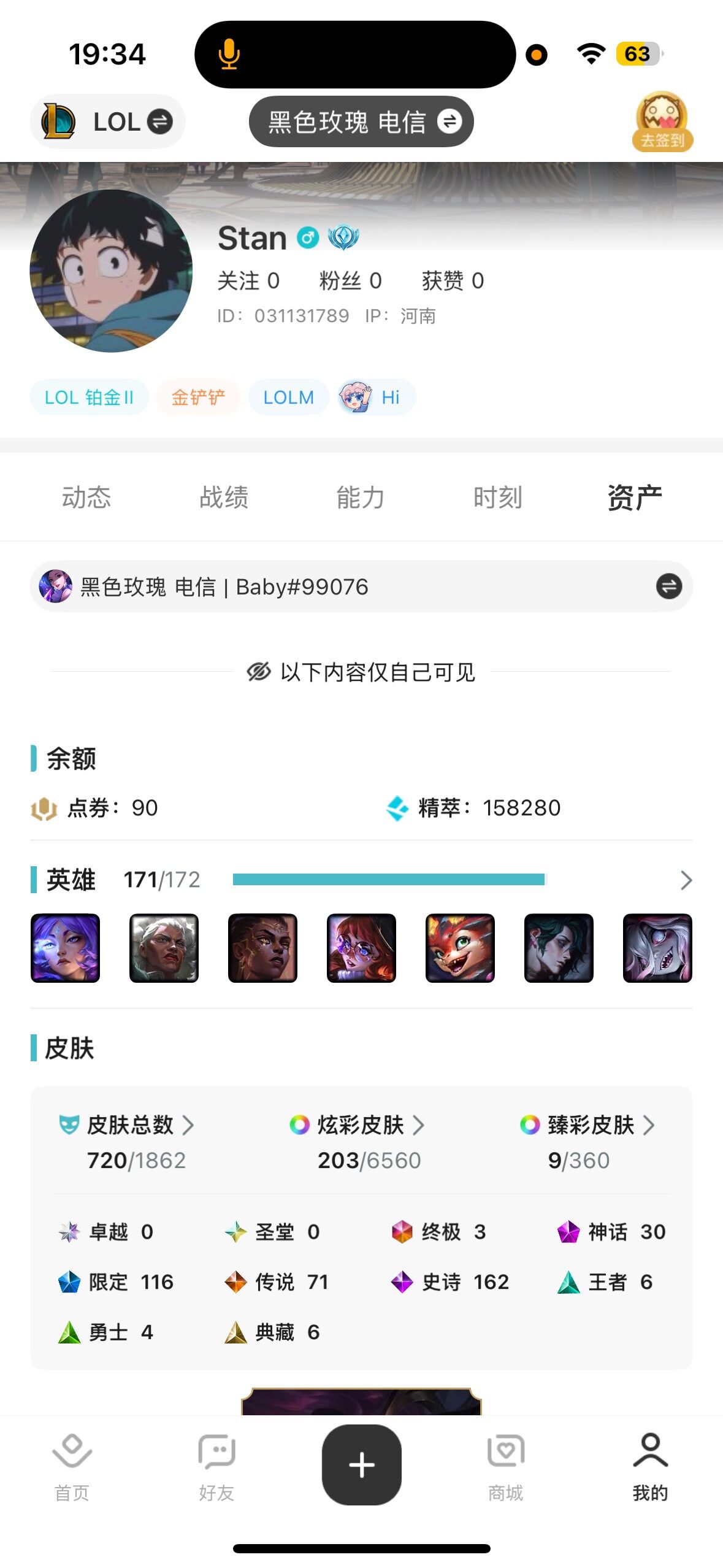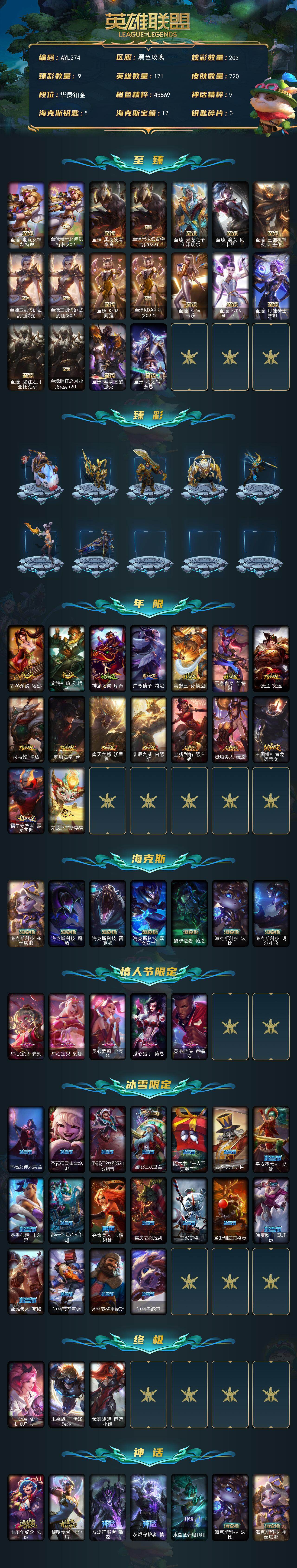 [15487733]【特价出售/店主推荐】铂金段位-171英雄-720皮肤-203炫彩-5终极-30神话-116限定-71传说-162史诗
