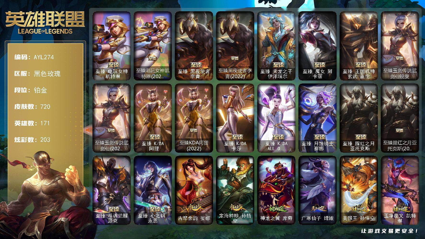 [15487733]【特价出售/店主推荐】铂金段位-171英雄-720皮肤-203炫彩-5终极-30神话-116限定-71传说-162史诗 【至臻皮肤】:至臻电玩女神凯特琳,至臻电玩女神凯特琳(2022),至臻黑夜使者李青,至臻黑夜使者李青(2022),至臻天龙之子伊泽瑞尔,至臻魔女阿卡丽,至臻王国机神玄武盖伦,至臻玉剑传说武剑仙锐雯,至臻玉剑传说武剑仙(2022),至臻KDA阿狸,至臻KDA阿狸(2022),至臻KDA卡莎,至臻KDAALLOUT卡莎,至臻月蚀骑士赛娜,至臻腥红之月亚托克斯,至臻腥红之月亚托克斯(2022),至臻斗魂觉醒派克,至臻心之钢永恩 【臻彩皮肤】:无畏骑士瑟庄妮赤子初心,吕布奉先炫金战神,张辽文远炫金将军,南天之怒沃里克炫金天神,冠军之刃锐雯2016凯旋圣装,冠军之矛卡莉丝塔凯旋圣装,雾雨之刃锐雯,西部天使赛娜神选天使长,幻灵战斗蝠薇恩梦幻强袭 【年限皮肤】:古琴余韵娑娜,定海神珍孙悟空,神龙之翼库奇,广寒仙子嫦娥,美猴王孙悟空,玉净夜叉凯特琳,张辽文远,司马懿仲达,虎痴之拳蔚,南天之怒沃里克,北辰之威内瑟斯,金猪烈焰瑟庄妮,烈焰美人薇恩,王国机神青龙德莱文,福牛守护者嘉文四世,天龙之子斯莫德 【海克斯皮肤】:海克斯科技崔丝塔娜,海克斯科技魔腾,海克斯科技雷克顿,海克斯科技嘉文四世,摄魂使者薇恩,海克斯科技波比,海克斯科技玛尔扎哈 【情人节限定】:甜心宝贝安妮,甜心宝贝娑娜,觅心萝莉金克丝,觅心猎手薇恩,觅心游侠卢锡安 【冰雪限定】:幸福女神乐芙兰,圣诞精灵崔丝塔娜,圣诞狂欢努努和威朗普,圣诞狂欢基兰,阿木木“主人不要我了”,胡桃夹子萨科,平安夜女神娑娜,冬季仙境卡尔玛,邪恶圣诞老人维迦,夺命美人卡特琳娜,喜庆之树茂凯,雪默丁格,圣诞驯鹿克格莫,魄罗骑士瑟庄妮,圣诞老人布隆,冰雪节辛吉德,冰雪节格雷福斯,冰雪兽纳尔 【终极皮肤】:KDAALLOUT萨勒芬妮独立音乐人,未来战士伊泽瑞尔,武装战姬厄运小姐 【神话皮肤】:十周年纪念安妮,黎明使者卡尔玛,灰烬征服者潘森,灰烬守护者慎,水晶圣骑塔莉娅,海克斯科技波比,海克斯科技崔丝塔娜,海克斯科技嘉文四世,海克斯科技雷克顿,海克斯科技玛尔扎哈,海克斯科技魔腾,摄魂使者薇恩,至臻天龙之子伊泽瑞尔,至臻电玩女神凯特琳,至臻电玩女神凯特琳2022,至臻斗魂觉醒派克,至臻黑夜使者李青,至臻黑夜使者李青2022,至臻KDA阿狸