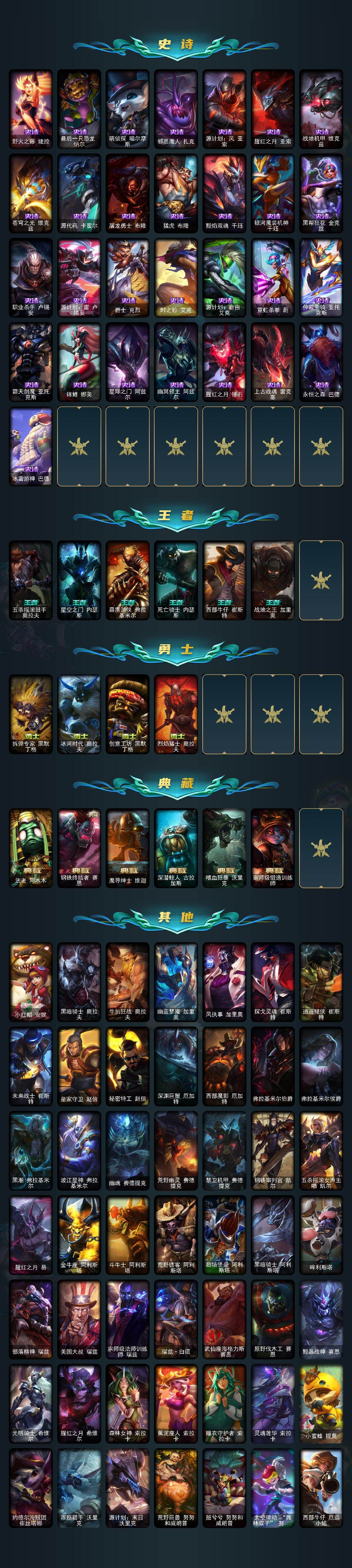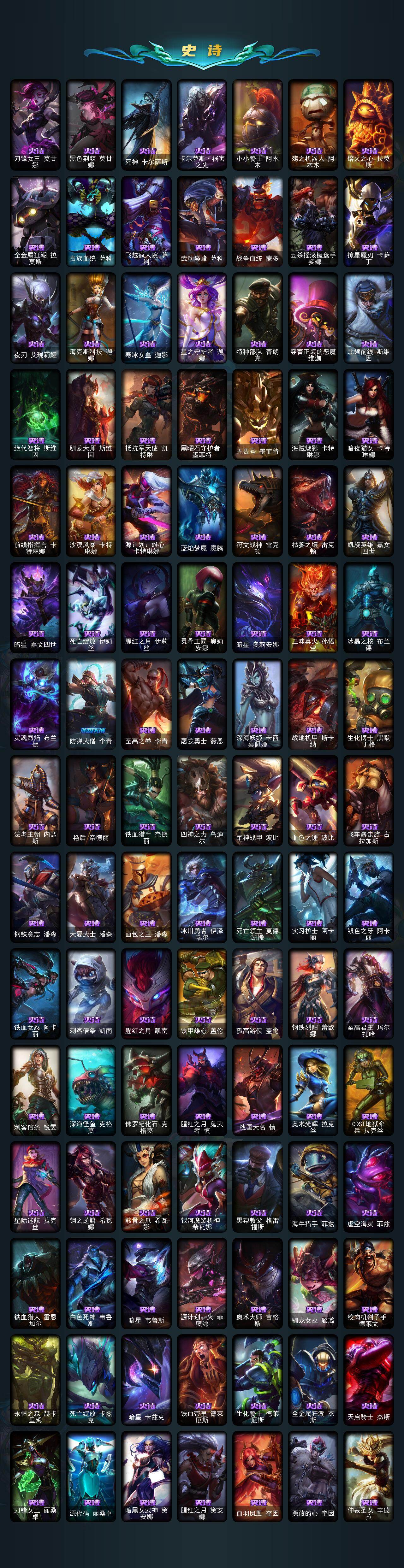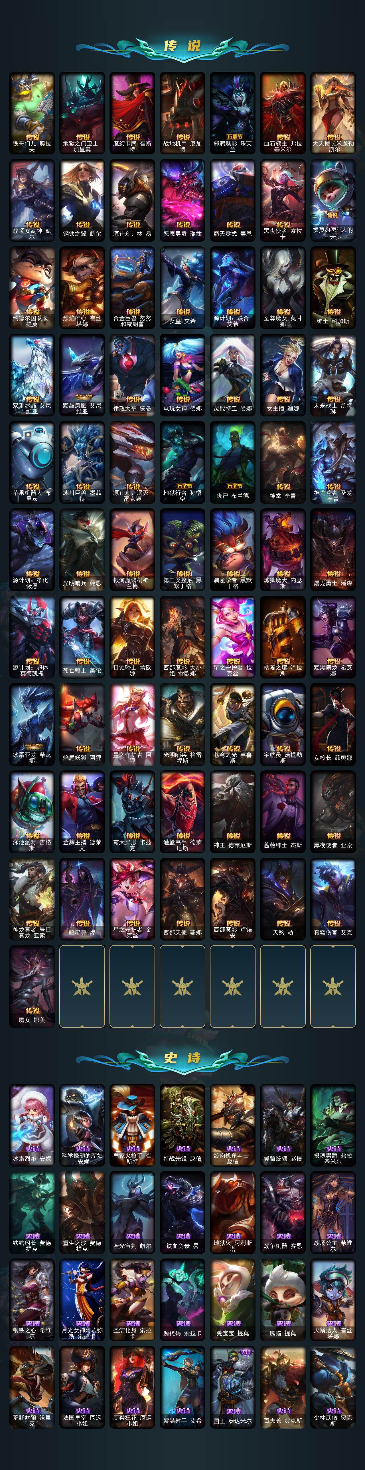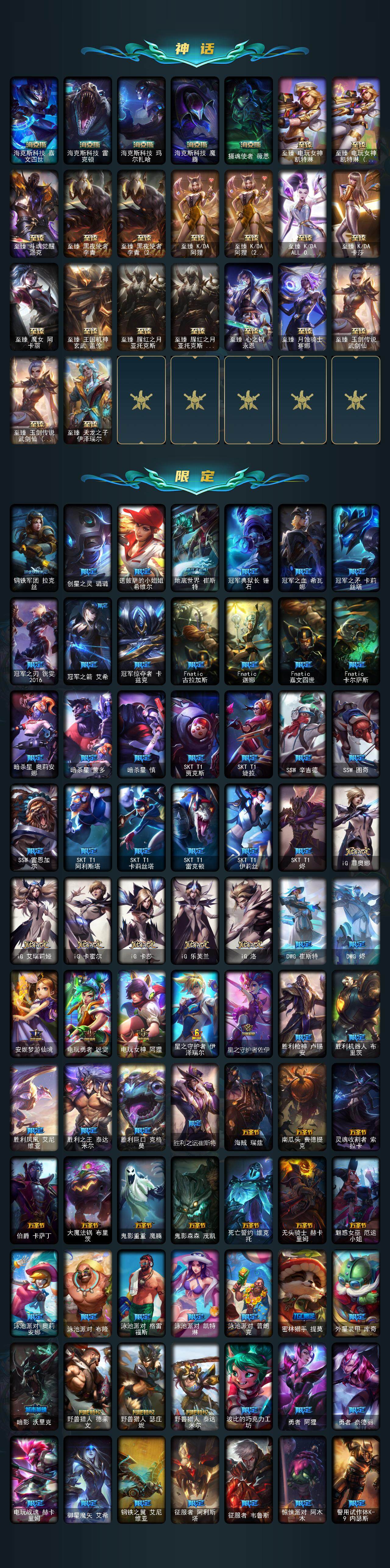 【年限皮肤】:古琴余韵娑娜,定海神珍孙悟空,神龙之翼库奇,广寒仙子嫦娥,美猴王孙悟空,玉净夜叉凯特琳,张辽文远,司马懿仲达,虎痴之拳蔚,南天之怒沃里克,北辰之威内瑟斯,金猪烈焰瑟庄妮,烈焰美人薇恩,王国机神青龙德莱文,福牛守护者嘉文四世,天龙之子斯莫德