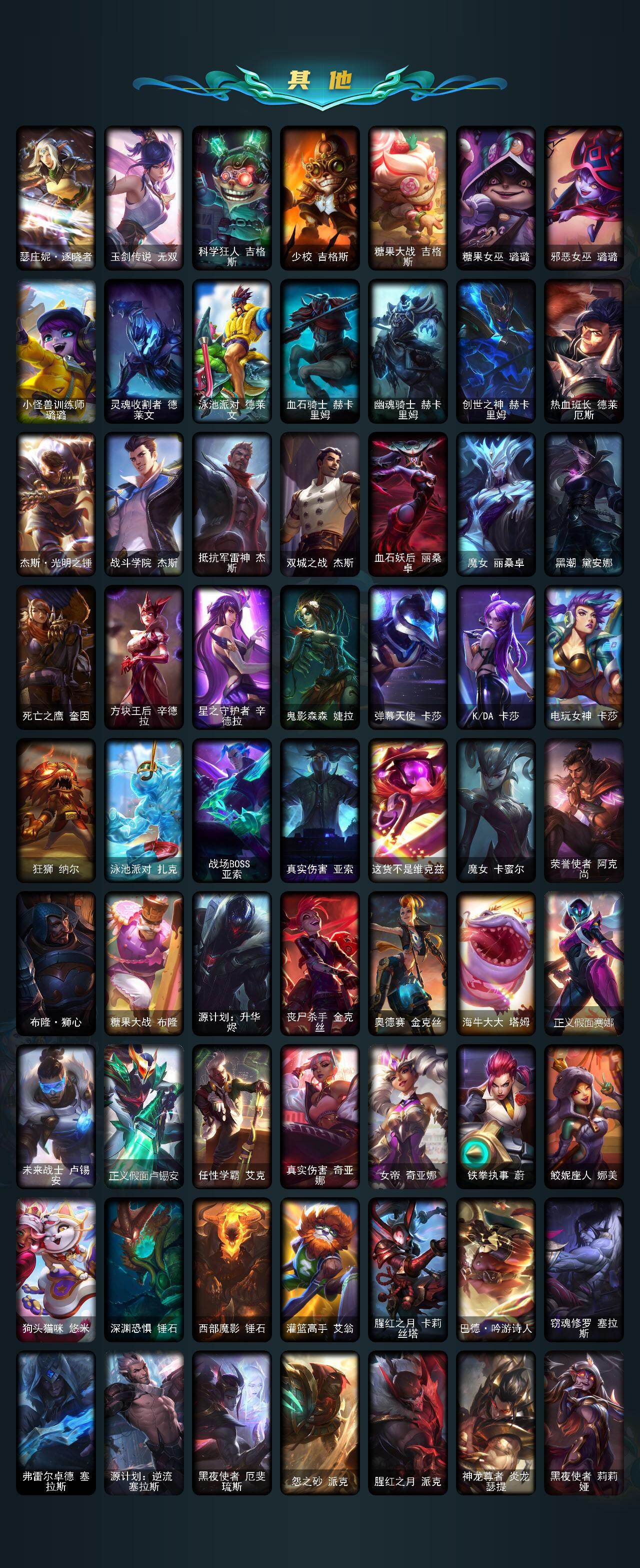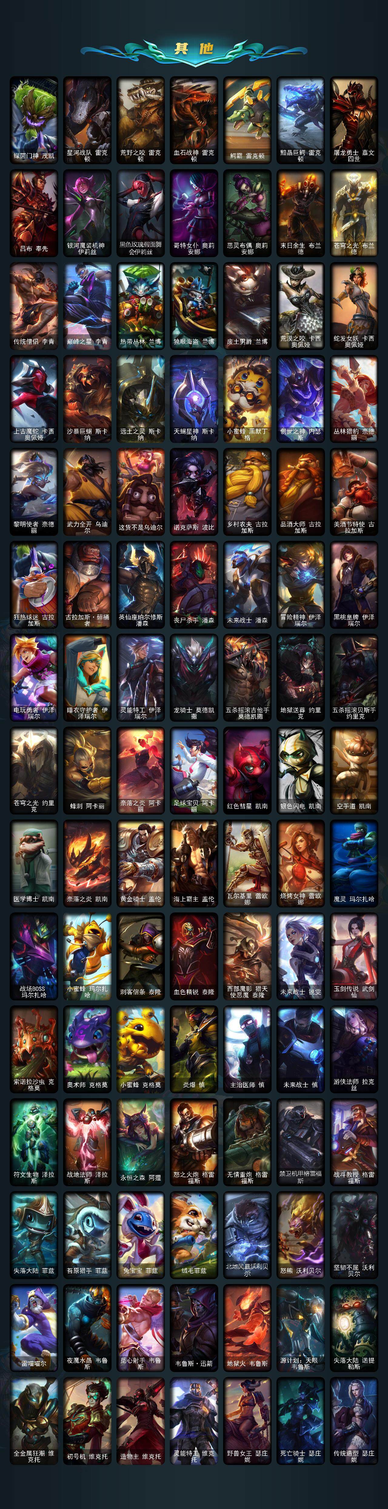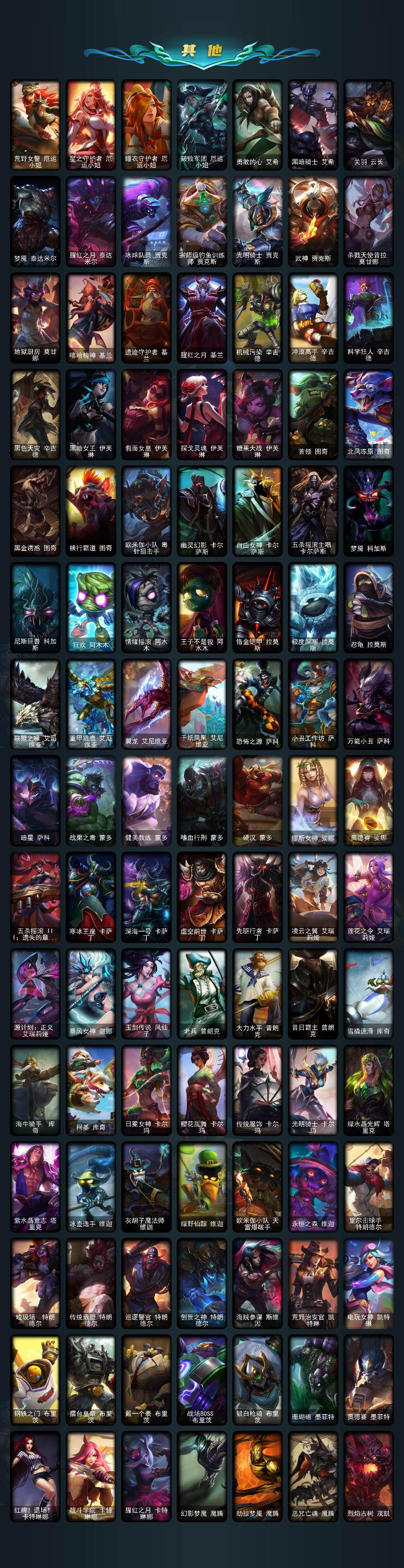 【冰雪限定】:幸福女神乐芙兰,圣诞精灵崔丝塔娜,圣诞狂欢努努和威朗普,圣诞狂欢基兰,阿木木“主人不要我了”,胡桃夹子萨科,平安夜女神娑娜,冬季仙境卡尔玛,邪恶圣诞老人维迦,夺命美人卡特琳娜,喜庆之树茂凯,雪默丁格,圣诞驯鹿克格莫,魄罗骑士瑟庄妮,圣诞老人布隆,冰雪节辛吉德,冰雪节格雷福斯,冰雪兽纳尔