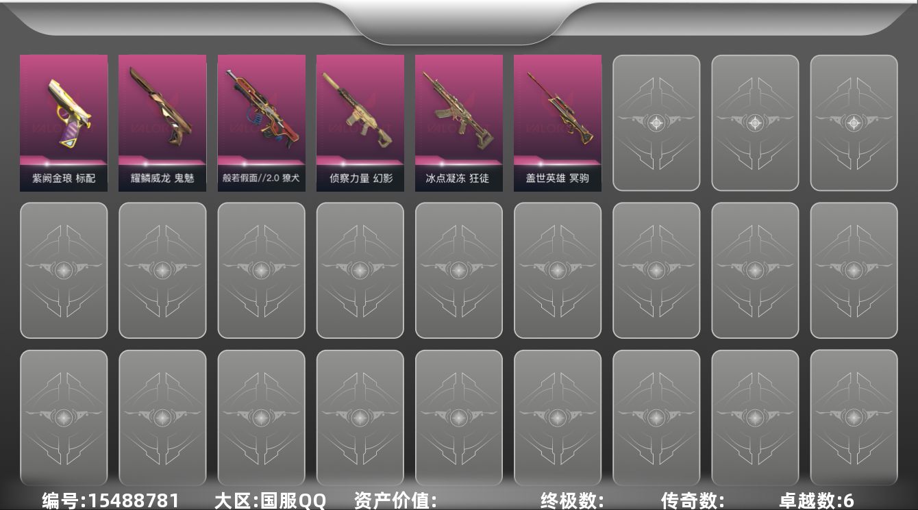 [15488781]【英雄】:幻棱,炼狱,捷风,幽影,不死鸟,贤者,猎枭,芮娜,奇乐,盖可 【狂徒】:狂徒-冰点凝冻 【幻影】:幻影-侦察力量 【獠犬】:獠犬-般若假面//2.0 【冥驹】:冥驹-盖世英雄 【标配】:标配-紫阙金琅 【鬼魅】:鬼魅-耀鳞威龙 【卡面】:Clutch 卡面,无畏契约GO!第一卷:芮娜 卡面,无畏契约GO!第一卷:零 卡面,无垠星环 卡面,《双城之战》金克丝 卡面,无畏契约GO!第一卷:贤者 卡面,钢锁vs盖可 卡面,代号红色 卡面,新兵报到 卡面,V契约 卡面,无畏契约 卡面 【喷漆】:买装还是存钱 喷漆,暴走萝莉 喷漆,松叶 喷漆,胜利属于无畏契约 喷漆,GLHF 喷漆,无畏契约 喷漆 【挂饰】:无畏契约GO!第一卷 芮娜 挂饰,无畏契约GO!第一卷 零 挂饰,鱼骨头 挂饰,薰衣草之心 挂饰,天外飞客 挂饰,《双城之战》魄罗 挂饰,无畏契约 纪念币 挂饰