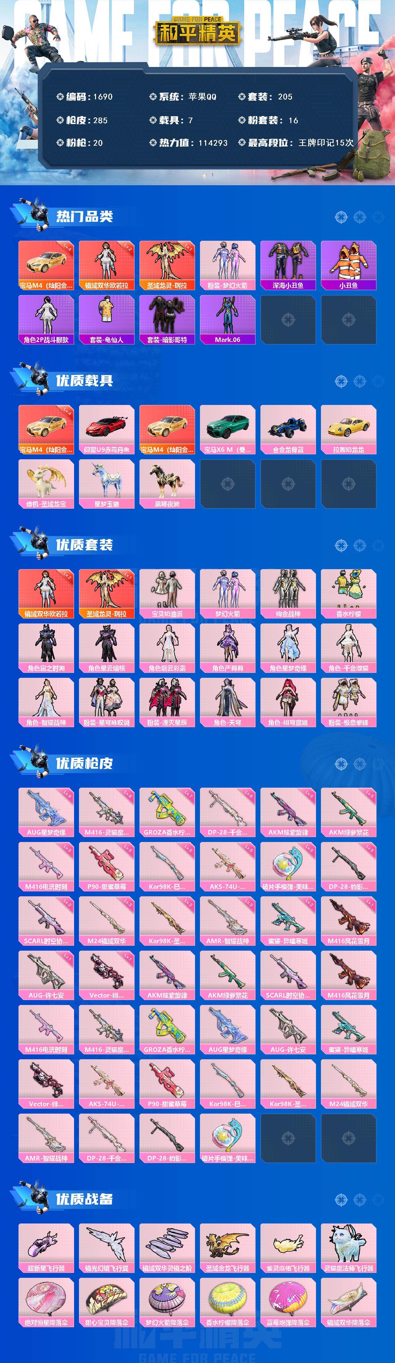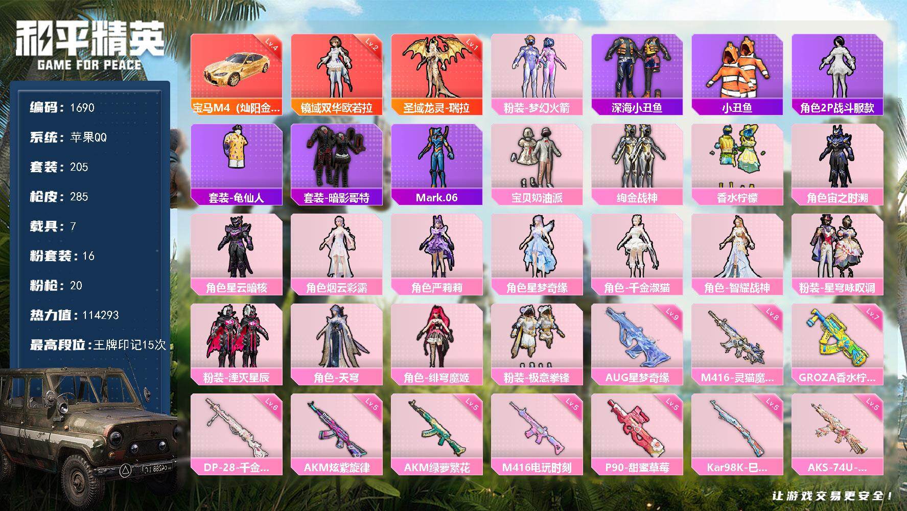 [15491335]【1690】苹果 手Q-2神装-16粉装-20特效枪-7载具-8粉色飞行器-114293热力值-15王牌印记-205套装-285枪皮
