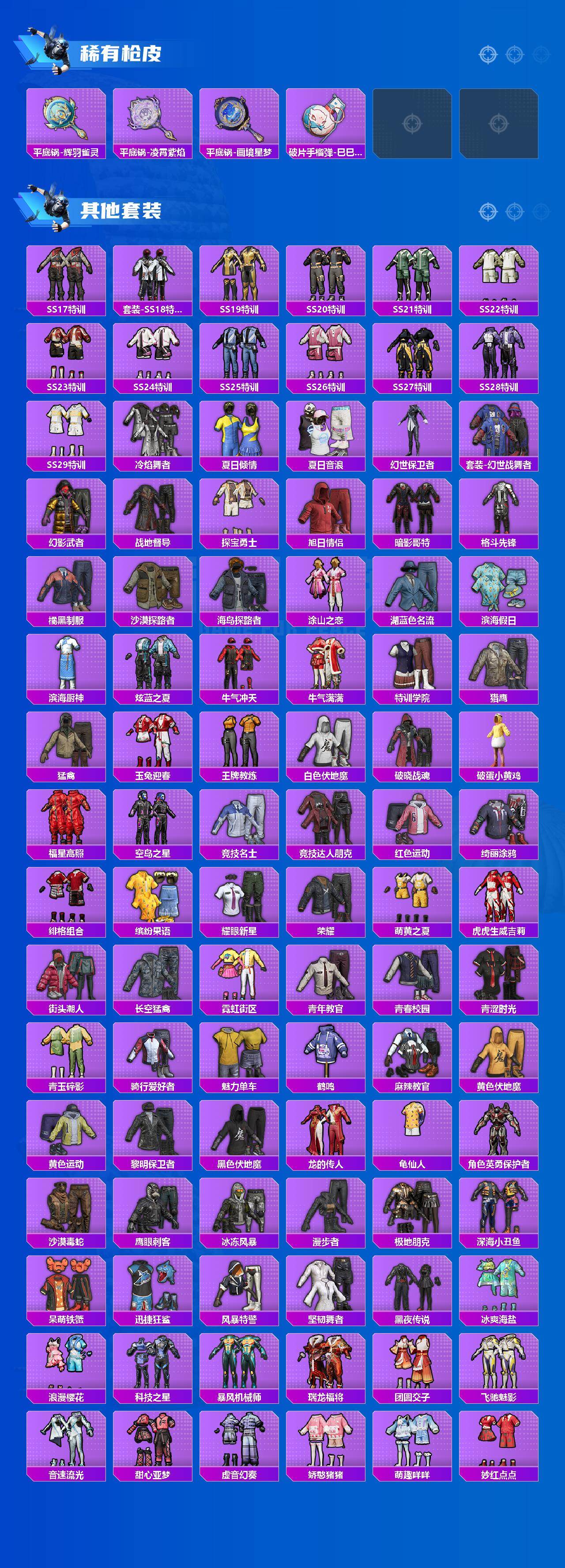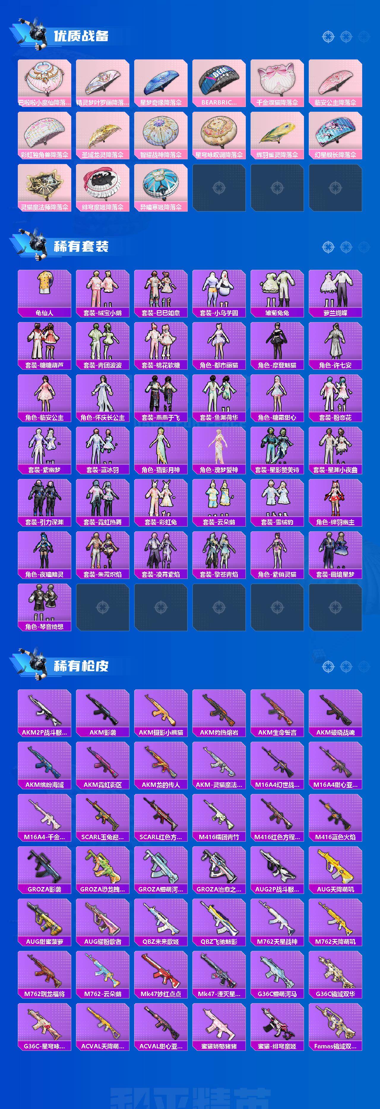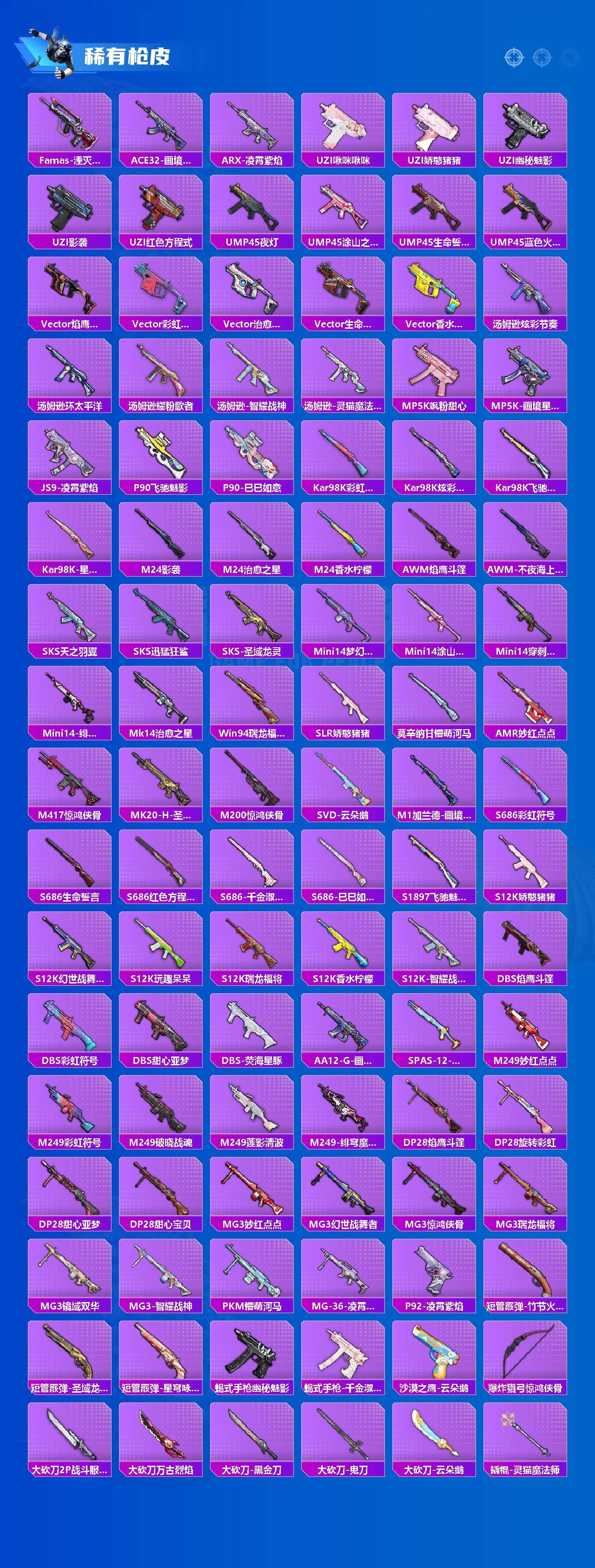AKM-炫紫旋律,AKM-绿萝繁花,SCAR-L-时空协奏,M416-风花雪月,M416-电玩时刻,GROZA-香水柠檬,AUG-星梦奇缘,AUG-许七安,P90-甜蜜草莓,Kar98K-巳巳如意,Kar98K-圣域龙灵,M24-镜域双华,DP-28-千金淑猫