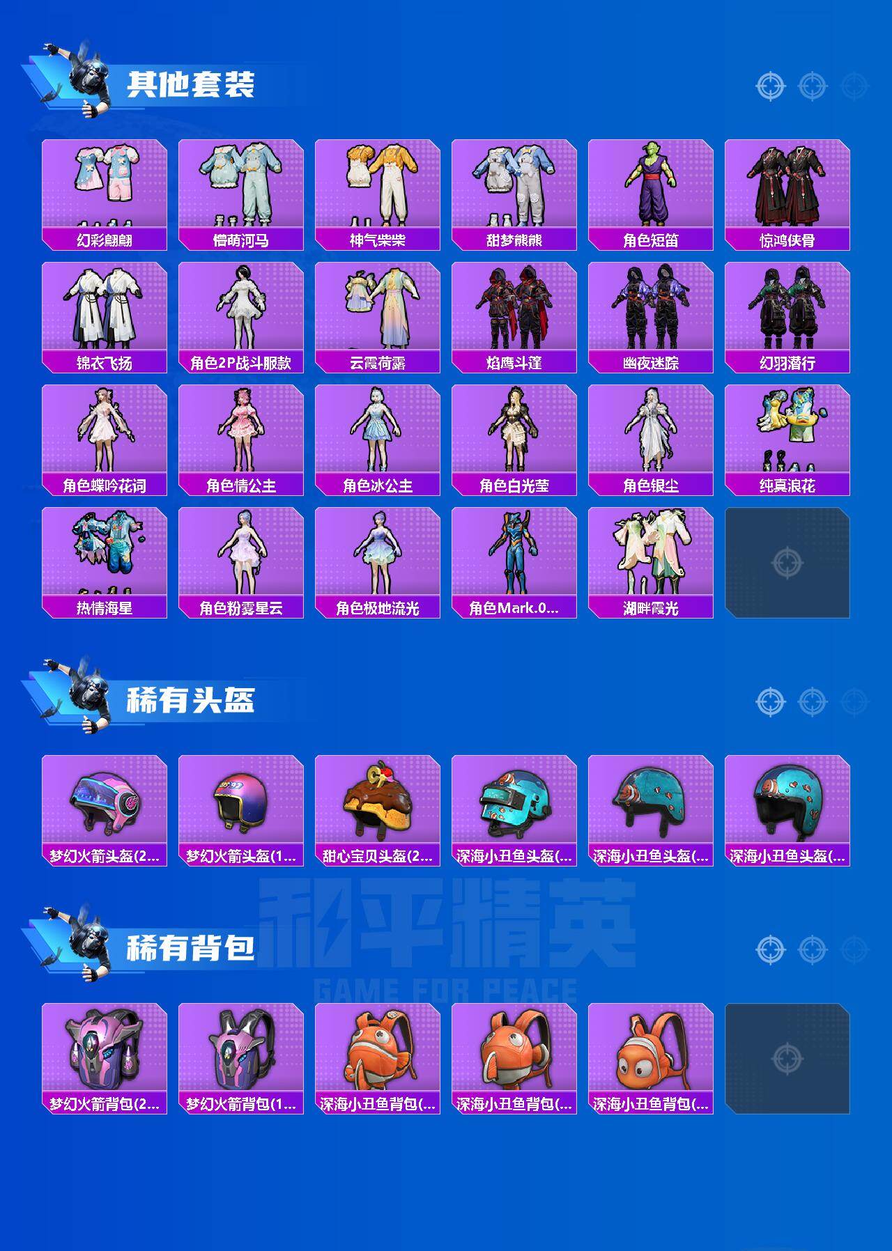 - PX_2095772-时装数: 291 枪械数: 91 战备数: 54 热门装扮: 甜心巧克力,宝贝奶油派,天使彩虹糖,梦魇先生,迅捷狂鲨,星之彼岸,狂花道·不知火舞 稀有枪皮: 六级M416-超新星,六级AUG-星之彼岸,一级Kar98K-巳巳如意