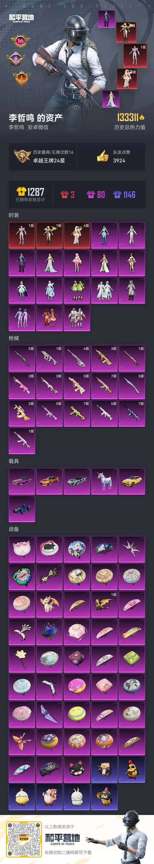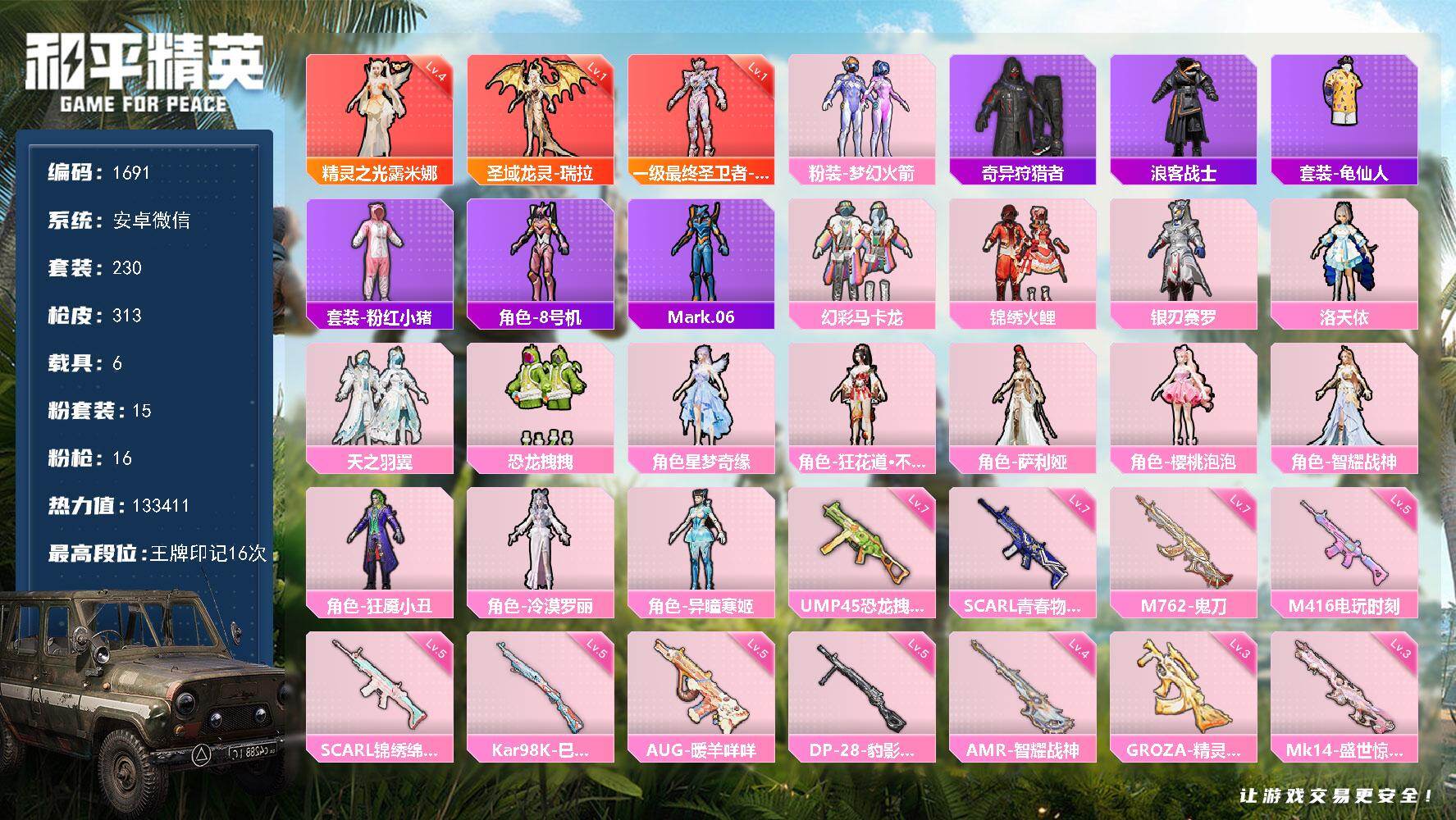 [15491480]【1691】安卓 微信-3神装-15粉装-16特效枪-6载具-8粉色飞行器-133411热力值-16王牌印记-230套装-313枪皮