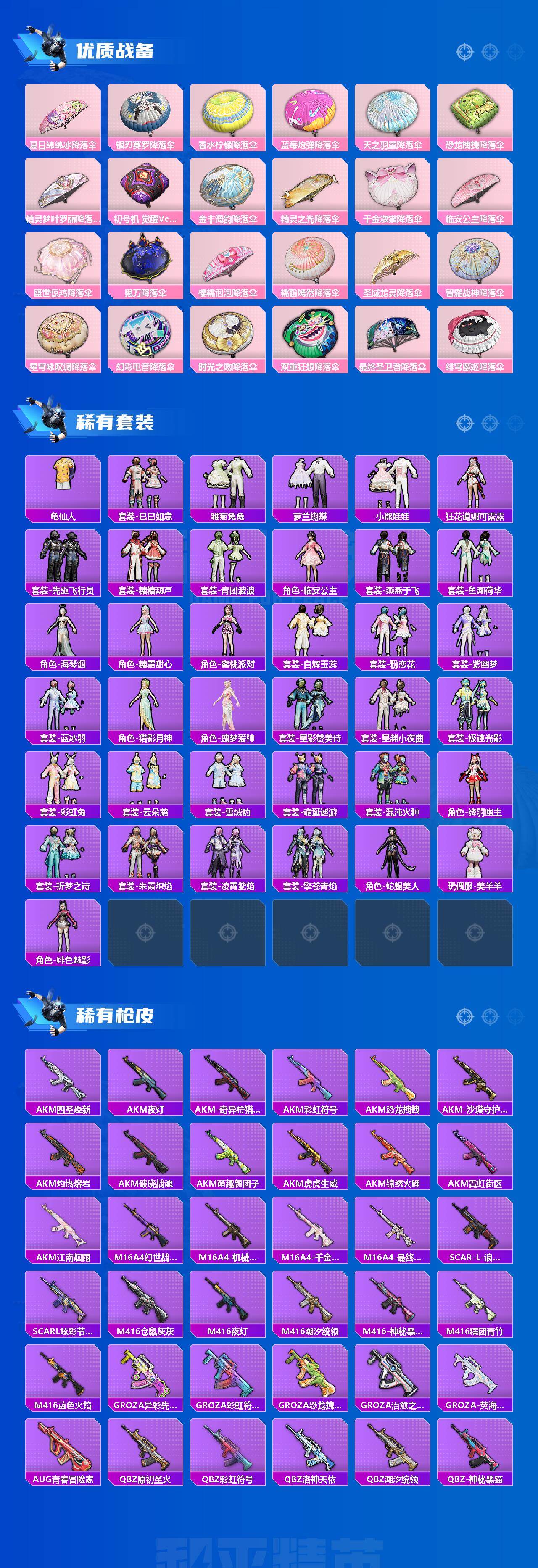 SCAR-L-青春物语,SCAR-L-锦绣绵绵,M416-电玩时刻,GROZA-精灵之光,AUG-暖羊咩咩,M762-甜蜜誓约,M762-鬼刀,UMP45-恐龙拽拽,Kar98K-巳巳如意,Kar98K-圣域龙灵,Mk14-盛世惊鸿,Mk14-樱桃泡泡