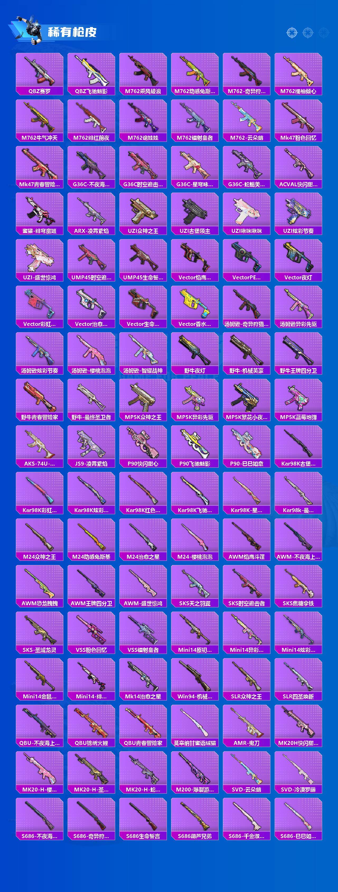 【粉色枪皮】:SCAR-L-青春物语,SCAR-L-锦绣绵绵,M416-电玩时刻,GROZA-精灵之光,AUG-暖羊咩咩,AUG-圣斗士星矢,M762-甜蜜誓约,M762-鬼刀,UMP45-恐龙拽拽,Vector-最终圣卫者,Kar98K-巳巳如意,Kar98K-圣域龙灵,Mk14-盛世惊鸿,Mk14-樱桃泡泡,AMR-智耀战神,DP-28-豹影疾电