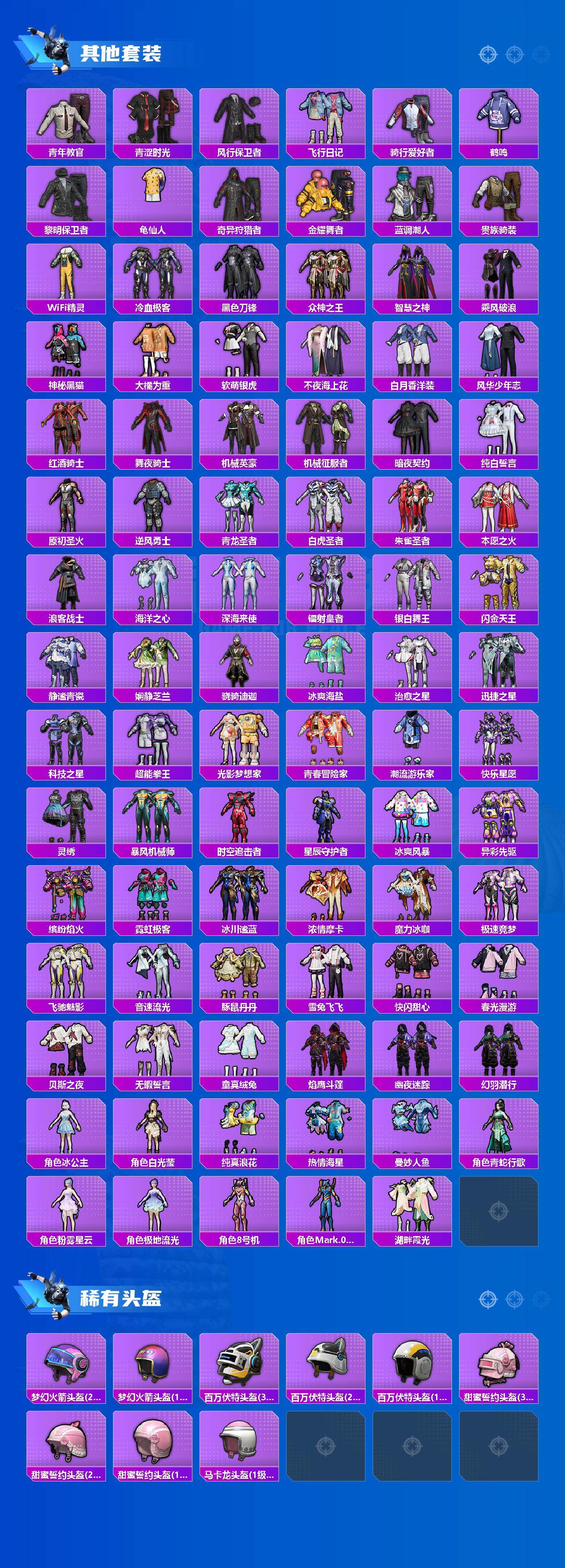 【粉色套装】:粉装-梦幻火箭,粉装-幻彩马卡龙,粉装-锦绣火鲤,粉装-银刃赛罗,角色-洛天依,粉装-天之羽翼,粉装-恐龙拽拽,角色-星梦奇缘,角色-狂花道·不知火舞,角色-萨利娅,角色-樱桃泡泡,角色-智耀战神,角色-狂魇小丑,角色-冷漠罗丽,角色-异瞳寒姬