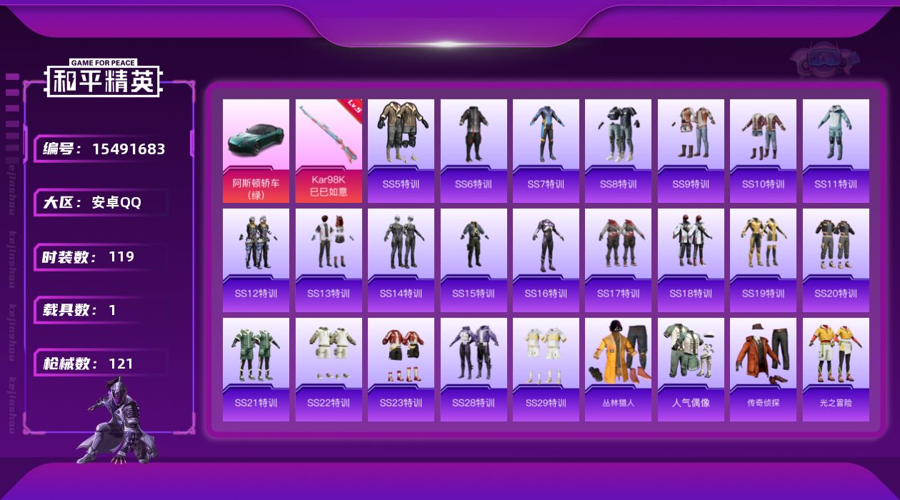 [15491683]【1692】安卓 手Q-0粉装-1特效枪-1载具-0粉色飞行器-37553热力值-1王牌印记-119套装-121枪皮