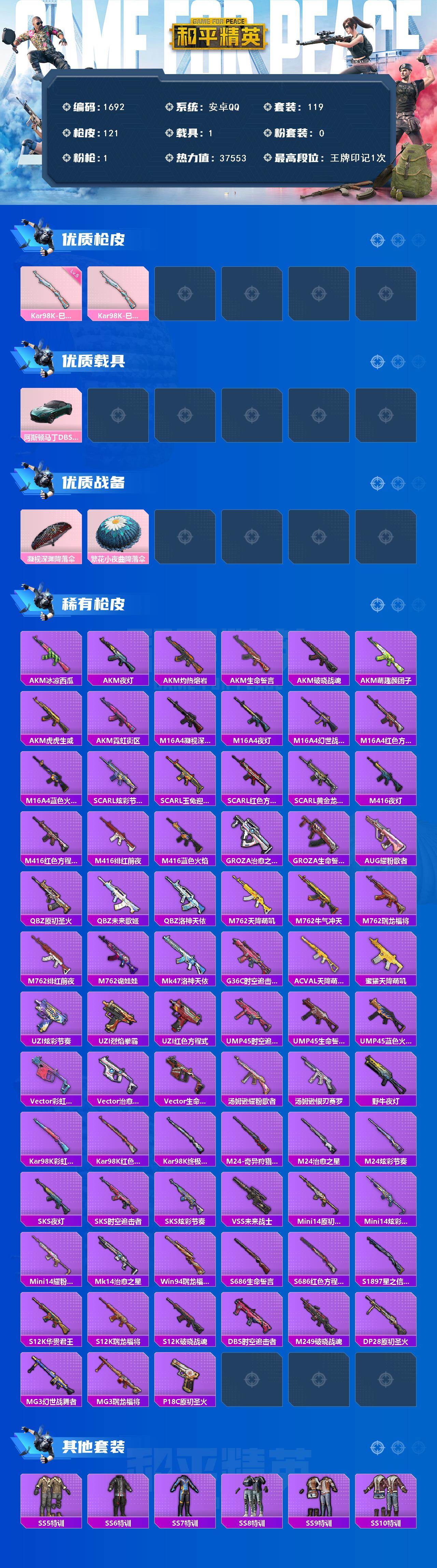 [15491683]【1692】安卓 手Q-0粉装-1特效枪-1载具-0粉色飞行器-37553热力值-1王牌印记-119套装-121枪皮 【粉色枪皮等级】:Kar98K-巳巳如意(五级) 【粉色载具】:阿斯顿马丁DBS(绿) 【粉色枪皮】:Kar98K-巳巳如意 【粉色降落伞】:凝视深渊降落伞,繁花小夜曲降落伞 【稀有枪皮】:AKM-冰凉西瓜,AKM-夜灯,AKM-灼热熔岩,AKM-生命誓言,AKM-破晓战魂,AKM-萌趣颜团子,AKM-虎虎生威,AKM-霓虹街区,M16A4-凝视深渊,M16A4-夜灯,M16A4-幻世战舞者,M16A4-红色方程式,M16A4-蓝色火焰,SCAR-L-炫彩节奏,SCAR-L-玉兔迎春,SCAR-L-红色方程式,SCAR-L-黄金龙骨,M416-夜灯,M416-红色方程式,M416-绯红前夜,M416-蓝色火焰,GROZA-治愈之星,GROZA-生命誓言,AUG-耀粉歌者,QBZ-原初圣火,QBZ-未来歌姬,QBZ-洛神天依,M762-天降萌叽,M762-牛气冲天,M762-瑞龙福将,M762-绯红前夜,M762-诡娃娃,Mk47-洛神天依,G36C-时空追击者,AC-VAL-天降萌叽,蜜獾-天降萌叽,UZI-炫彩节奏,UZI-烈焰拳霸,UZI-红色方程式,UMP45-时空追击者,UMP45-生命誓言,UMP45-蓝色火焰,Vector-彩虹符号,Vector-治愈之星,Vector-生命誓言,汤姆逊-耀粉歌者,汤姆逊-银刃赛罗,野牛-夜灯,Kar98K-彩虹符号,Kar98K-红色方程式,Kar98K-终极赛罗,M24-治愈之星,M24-炫彩节奏,M24-奇异狩猎者,SKS-夜灯,SKS-时空追击者,SKS-炫彩节奏,VSS-未来战士,Mini14-原初圣火,Mini14-炫彩节奏,Mini14-耀粉歌者,Mk14-治愈之星,Win94-瑞龙福将,S686-生命誓言,S686-红色方程式,S1897-星之信仰,S12K-瑞龙福将,S12K-破晓战魂,S12K-华贵君王,DBS-时空追击者,M249-破晓战魂,DP-28-原初圣火,MG3-幻世战舞者,MG3-瑞龙福将,P18C-原初圣火 【其他套装】:套装-SS5特训,套装-SS6特训,套装-SS7特训,套装-SS8特训,套装-SS9特训,套装-SS10特训,套装-SS11特训,套装-SS12特训,