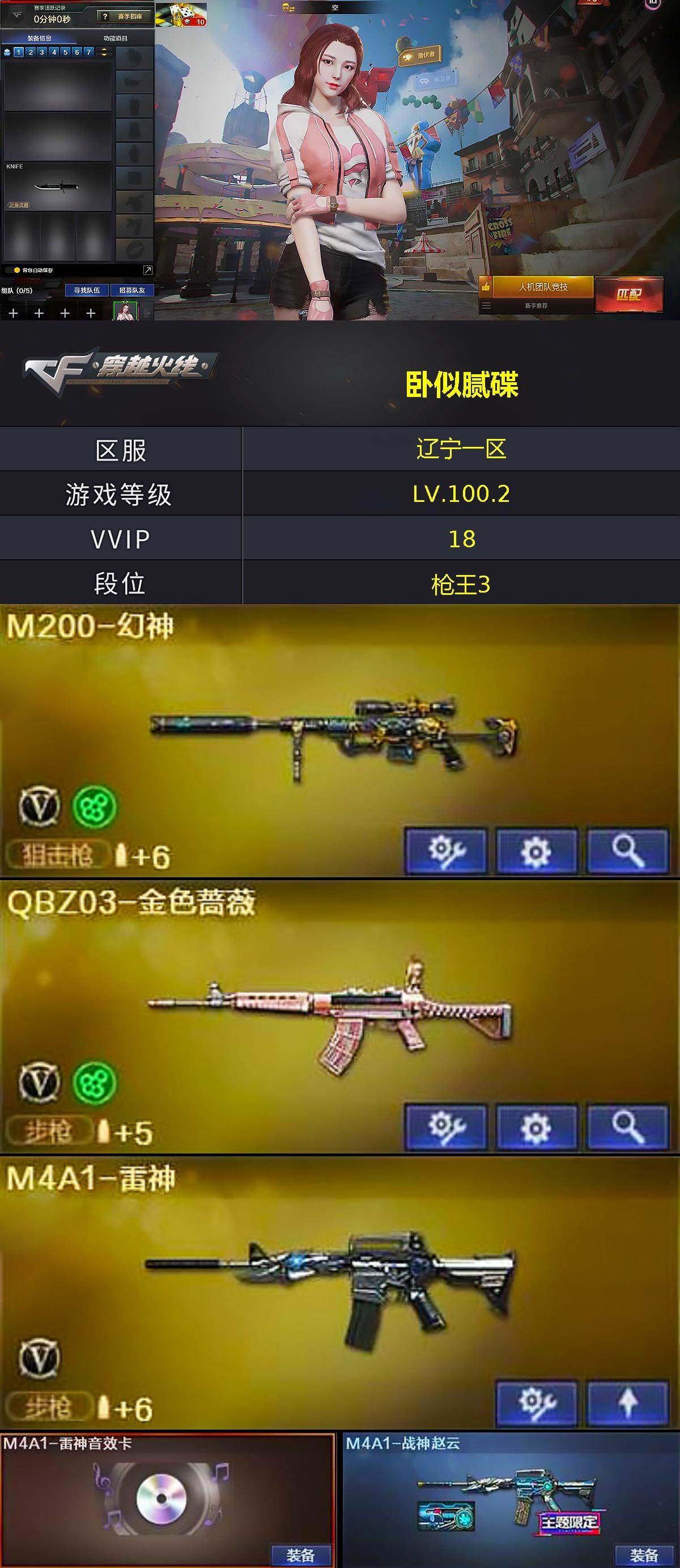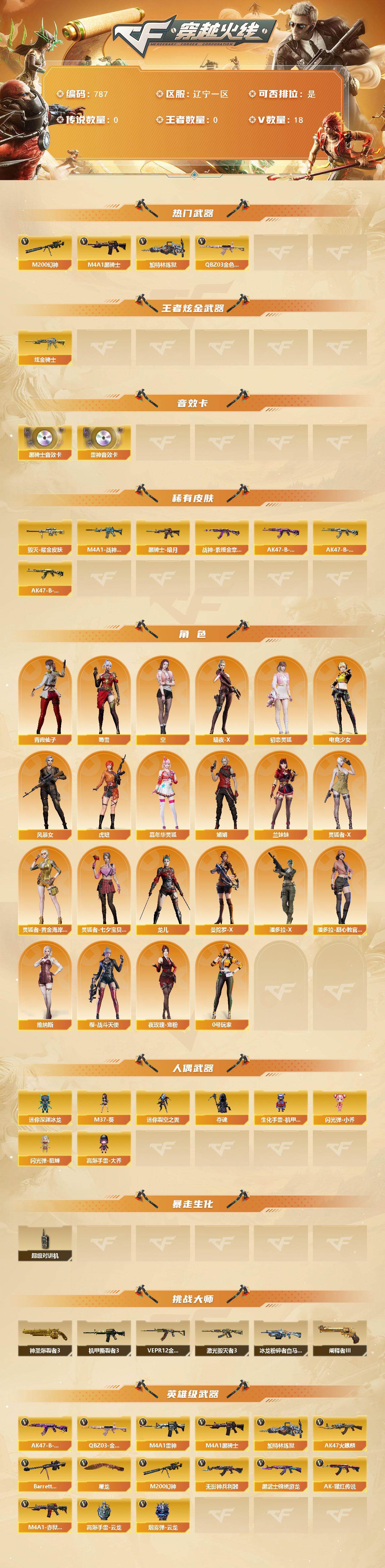 [15492398]辽宁一区-18V-0王者-1炫金 【热门武器】:QBZ03-金色蔷薇,M200-幻神,M4A1-黑骑士,加特林-炼狱 【王者炫金武器】:炫金骑士 【音效卡】:M4A1-雷神音效卡,M4A1-黑骑士音效卡 【皮肤】:M4A1-战神赵云,毁灭耀金皮肤,黑骑士-暗月,战神-紫绶金章皮肤,AK47-B-常胜将军-曹操*2,AK47-B-常胜将军-刘备,AK47-B-常胜将军-孙权 【角色】:空,暗夜-X,初恋灵狐,电竞少女,风暴女,虎妞,嘉年华灵狐,娟娟,兰妹妹,0号玩家,灵狐者-X,灵狐者-黄金海岸,灵狐者-七夕宝贝,龙儿,曼陀罗-X,潘多拉-X,潘多拉-甜心教官,青霞仙子,蜀雪,维纳斯,夜玫瑰-宠粉,樱-战斗天使 【人偶武器】:M37-葵,迷你深渊冰龙,迷你裂空之翼,夺魂,生化手雷-机甲核心,闪光弹-小乔,闪光弹-貂蝉,高爆手雷-大乔 【暴走生化】:超级对讲机 【挑战大师】:神圣爆裂者III*2,冰龙粉碎者-白马银枪,VEPR-12-金魔,激光毁灭者III,机甲撕裂者III,阐释者III 【英雄级武器】:AK47-火麒麟,M4A1-雷神,M4A1-黑骑士,无影-神兵利器,黑武士-锦绣游龙,QBZ03-金色蔷薇,AK-47-猩红传说,AK47-B-常胜将军,Barrett-毁灭,M200-幻神,加特林-炼狱,屠龙,高爆手雷-云龙,烟雾弹-云龙,M4A1-赤狱骑士 【道具】:冰冰企鹅背包,老虎背包,超级背包,救世主-黑桃战神,生化弹匣,夺命之镰,防化服,金色流光-枪王排位*2,星辰流光-枪王排位,巅峰赛先锋-金色流光,枪王排位28赛季金色流光,枪王排位29赛季金色流光,防弹头盔,防弹衣,C4工具钳,手雷包 【特殊枪械】:1黑骑士,1炼狱