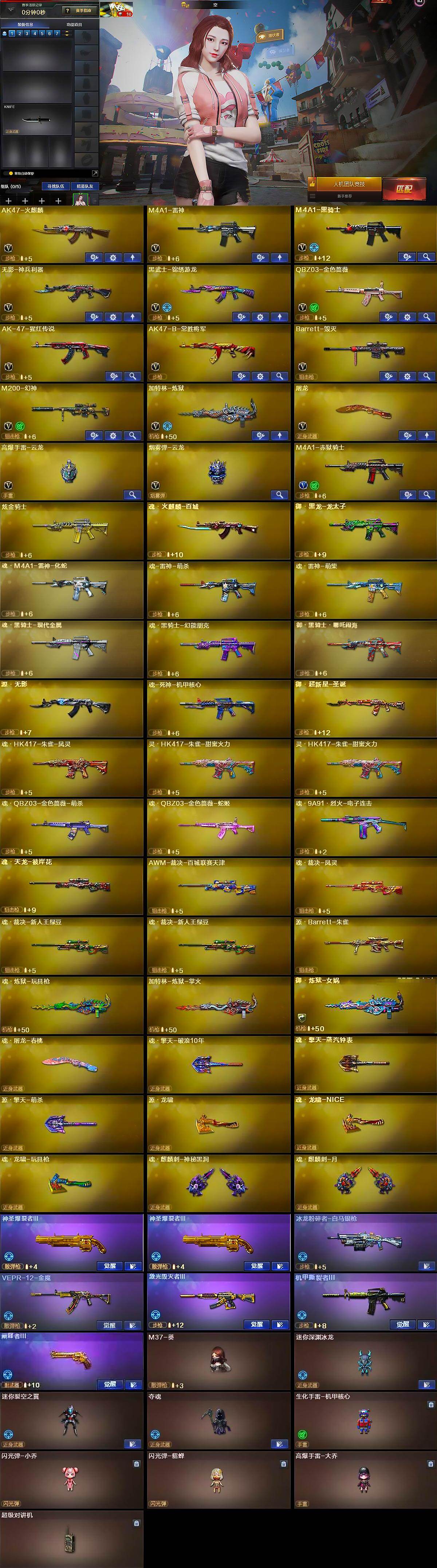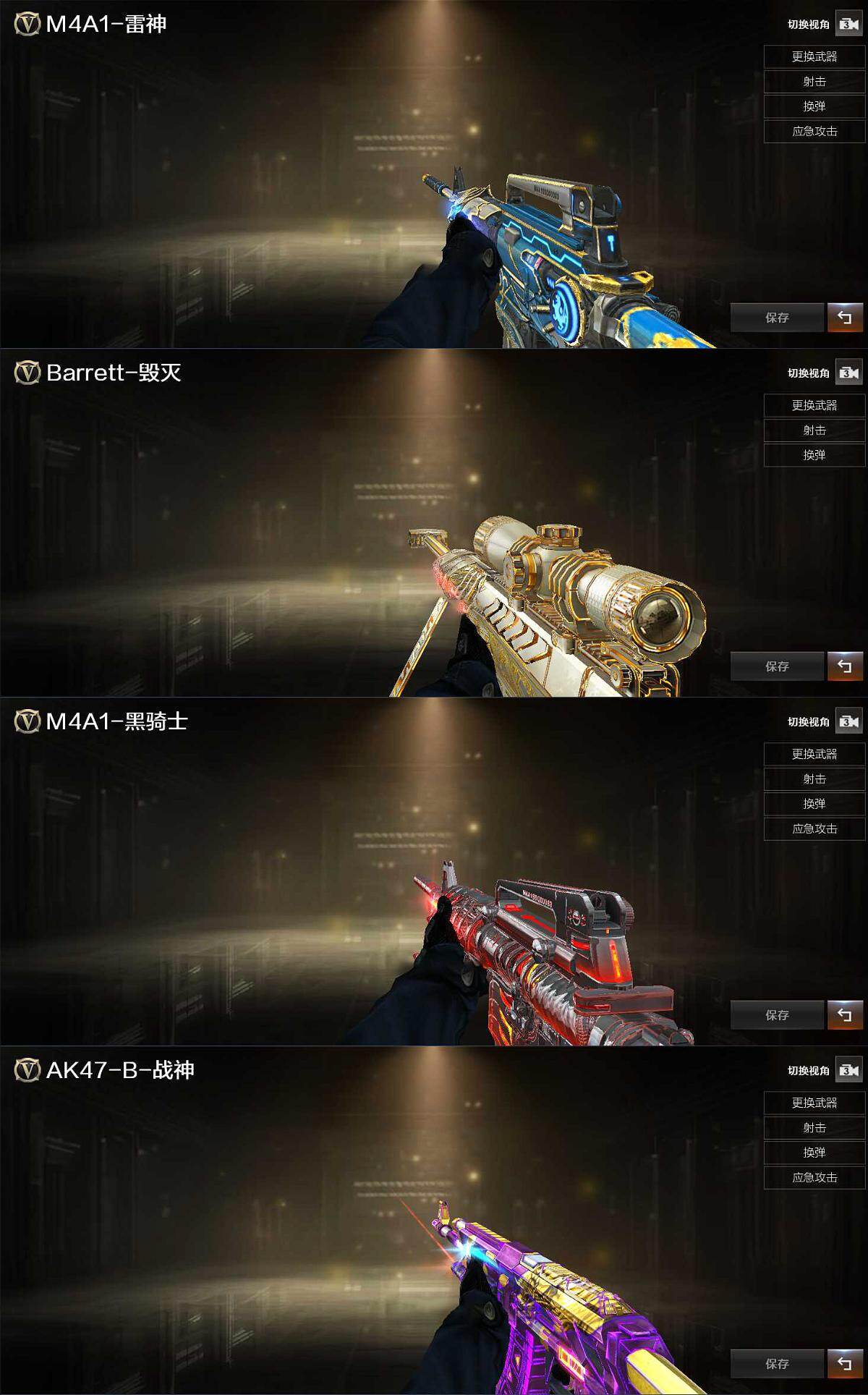 【英雄级武器】:AK47-火麒麟,M4A1-雷神,M4A1-黑骑士,无影-神兵利器,黑武士-锦绣游龙,QBZ03-金色蔷薇,AK-47-猩红传说,AK47-B-常胜将军,Barrett-毁灭,M200-幻神,加特林-炼狱,屠龙,高爆手雷-云龙,烟雾弹-云龙,M4A1-赤狱骑士