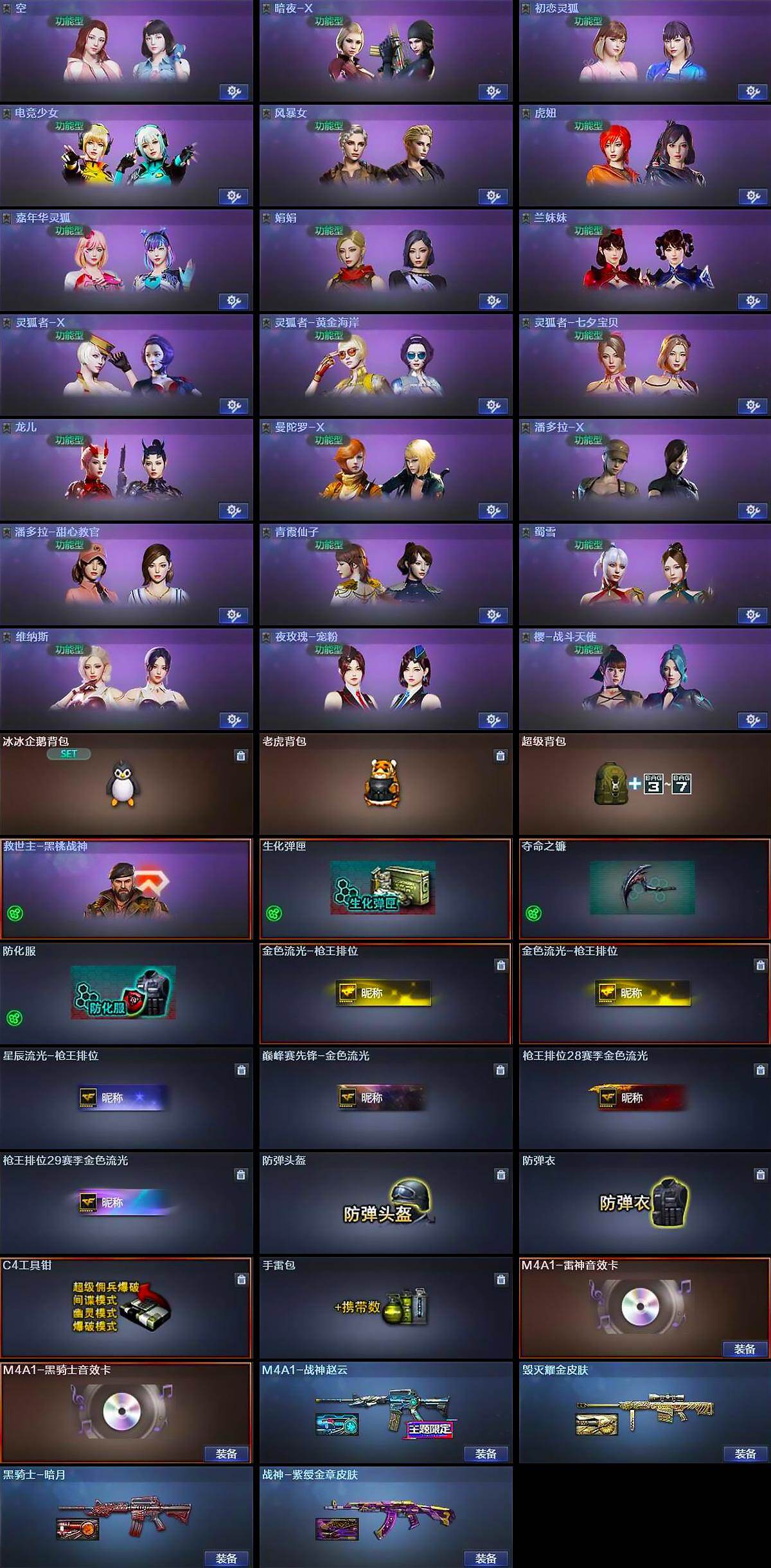 【道具】:冰冰企鹅背包,老虎背包,超级背包,救世主-黑桃战神,生化弹匣,夺命之镰,防化服,金色流光-枪王排位*2,星辰流光-枪王排位,巅峰赛先锋-金色流光,枪王排位28赛季金色流光,枪王排位29赛季金色流光,防弹头盔,防弹衣,C4工具钳,手雷包