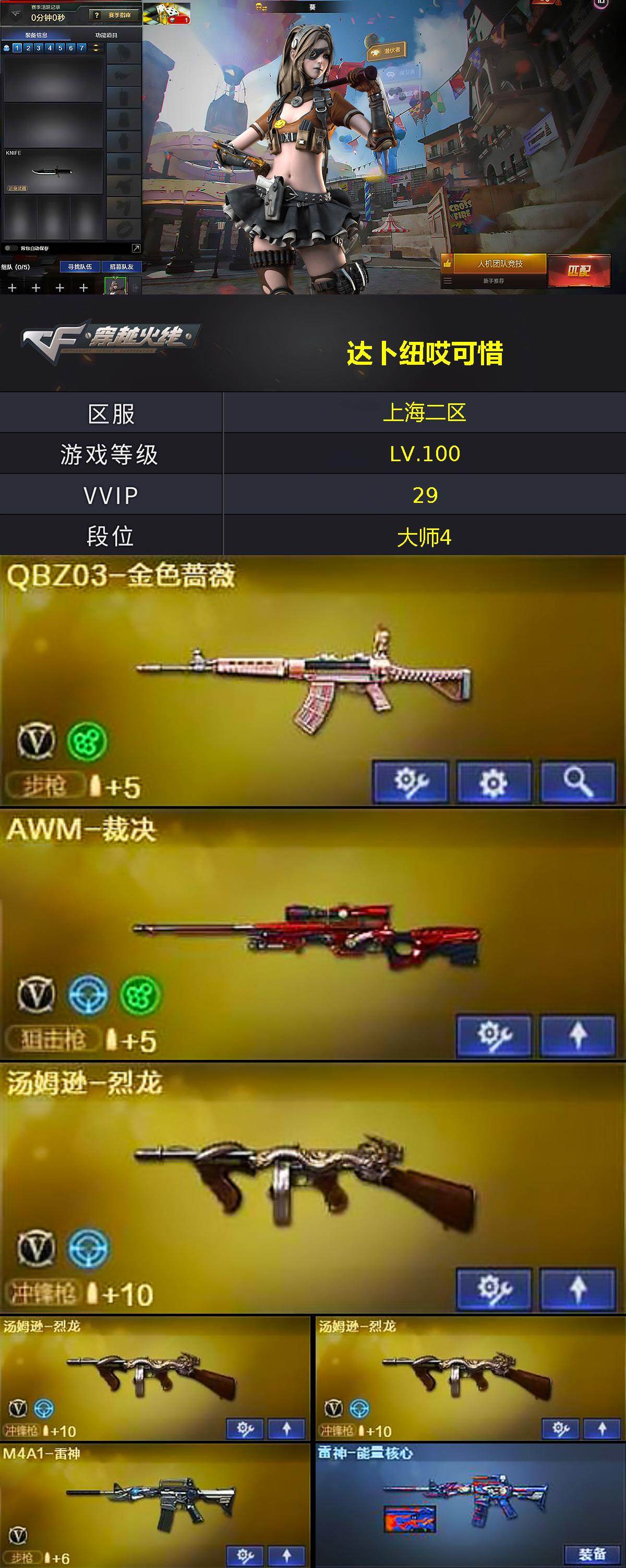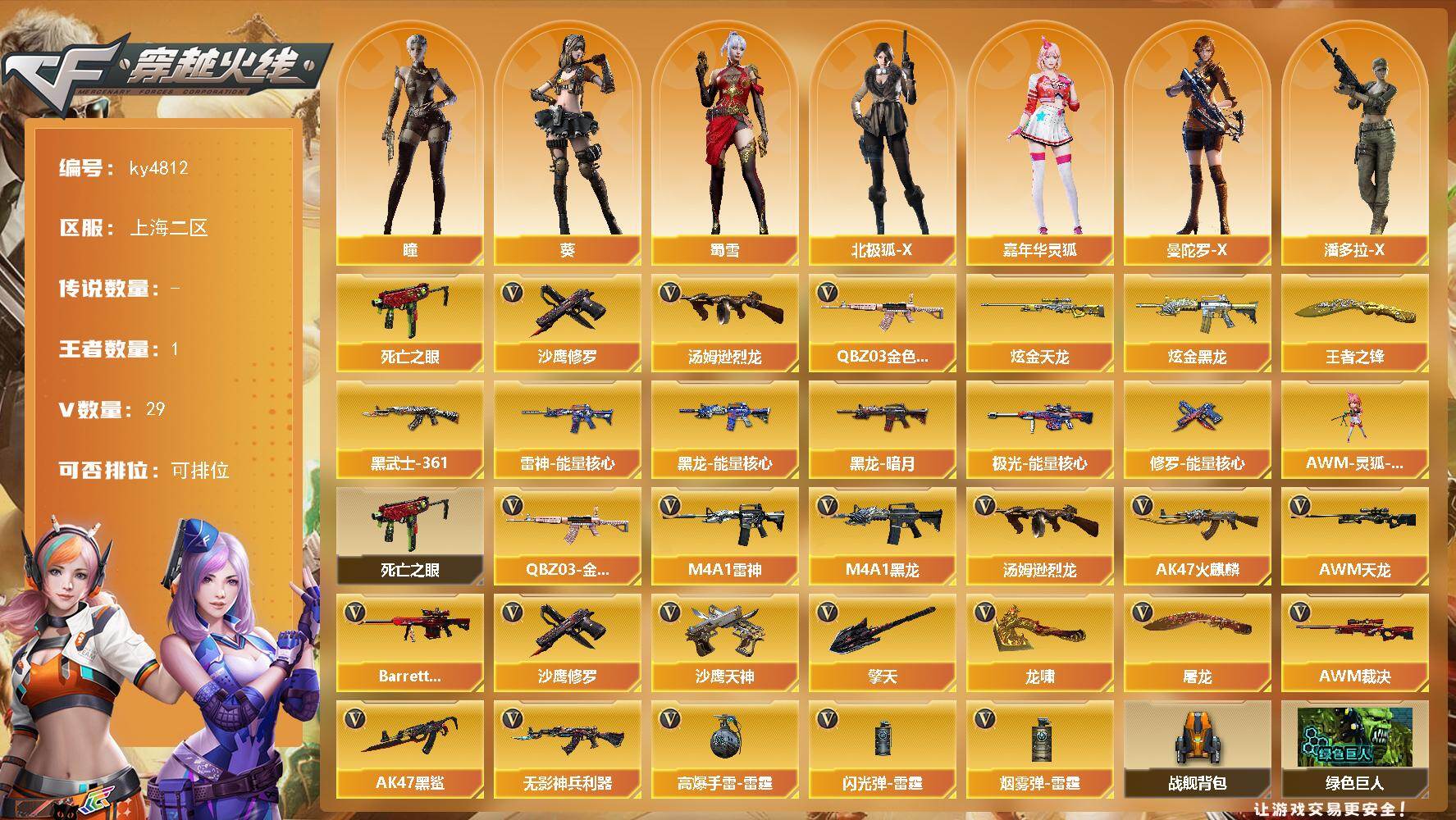 [15492978]上海二区-29V-1王者-2炫金 【热门武器】:QBZ03-金色蔷薇,死亡之眼,汤姆逊-烈龙*3,沙鹰-修罗*2 【王者炫金武器】:王者之锋,炫金黑龙,炫金天龙 【皮肤】:雷神-能量核心,黑龙-能量核心*2,黑龙-暗月,AK47-黑武士-361,极光-能量核心*2,修罗-能量核心 【角色】:葵,瞳,北极狐-X,嘉年华灵狐,曼陀罗-X,潘多拉-X,潘多拉-甜心教官,蜀雪 【人偶武器】:AWM-灵狐-15周年嘉年华 【暴走生化】:死亡之眼 【英雄级武器】:AK47-火麒麟,M4A1-黑龙*2,M4A1-雷神,AK47-黑鲨,无影-神兵利器,QBZ03-金色蔷薇,AWM-天龙*2,Barrett-极光*3,AWM-裁决,汤姆逊-烈龙*3,沙鹰-修罗*2,沙鹰-天神,屠龙*2,龙啸,擎天,高爆手雷-雷霆,闪光弹-雷霆,烟雾弹-雷霆 【道具】:战舰背包,绿色巨人,灵魂忍者,迷雾幽灵,夺命之镰,防化服*2,金色流光-枪王排位,枪王排位28赛季金色流光,防弹头盔*7,防弹衣*7,C4工具钳*6,手雷包*6 【特殊枪械】:3烈龙