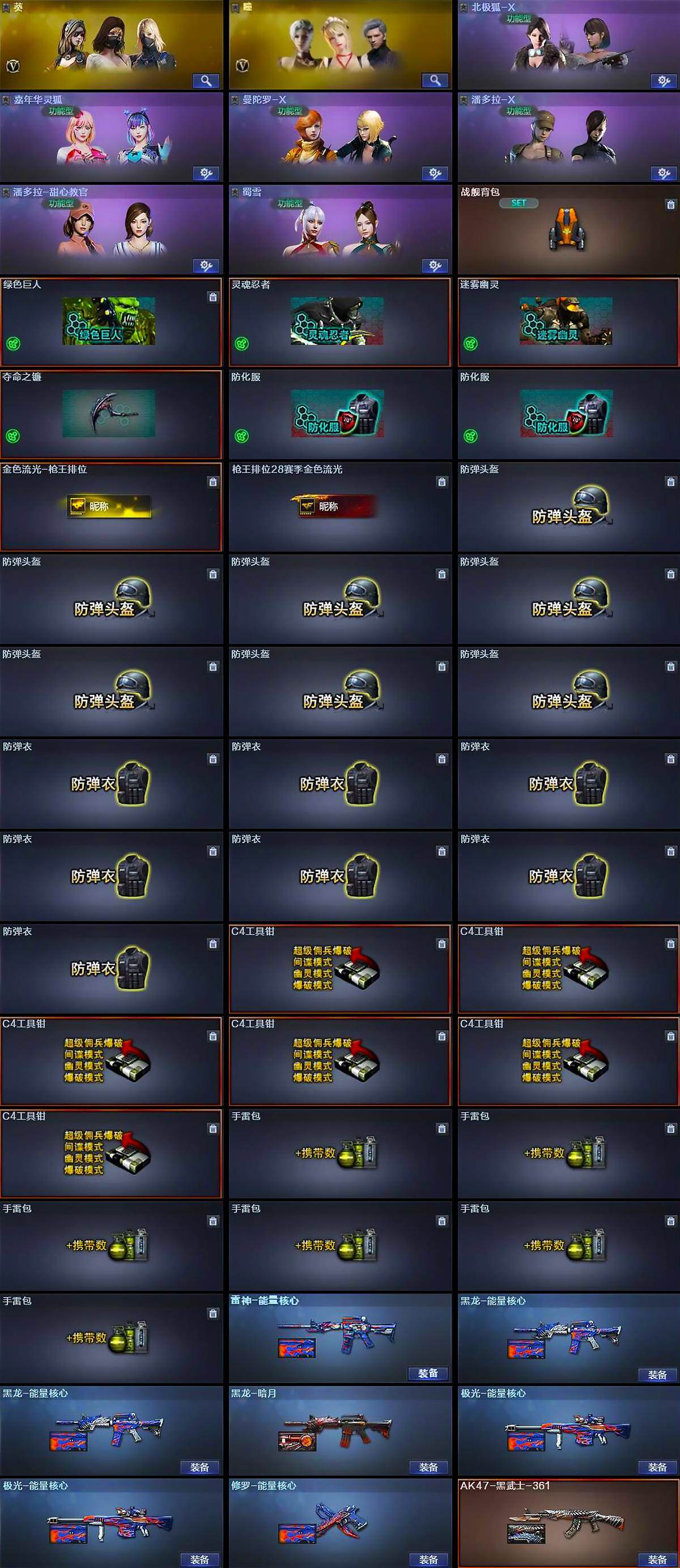 【道具】:战舰背包,绿色巨人,灵魂忍者,迷雾幽灵,夺命之镰,防化服*2,金色流光-枪王排位,枪王排位28赛季金色流光,防弹头盔*7,防弹衣*7,C4工具钳*6,手雷包*6