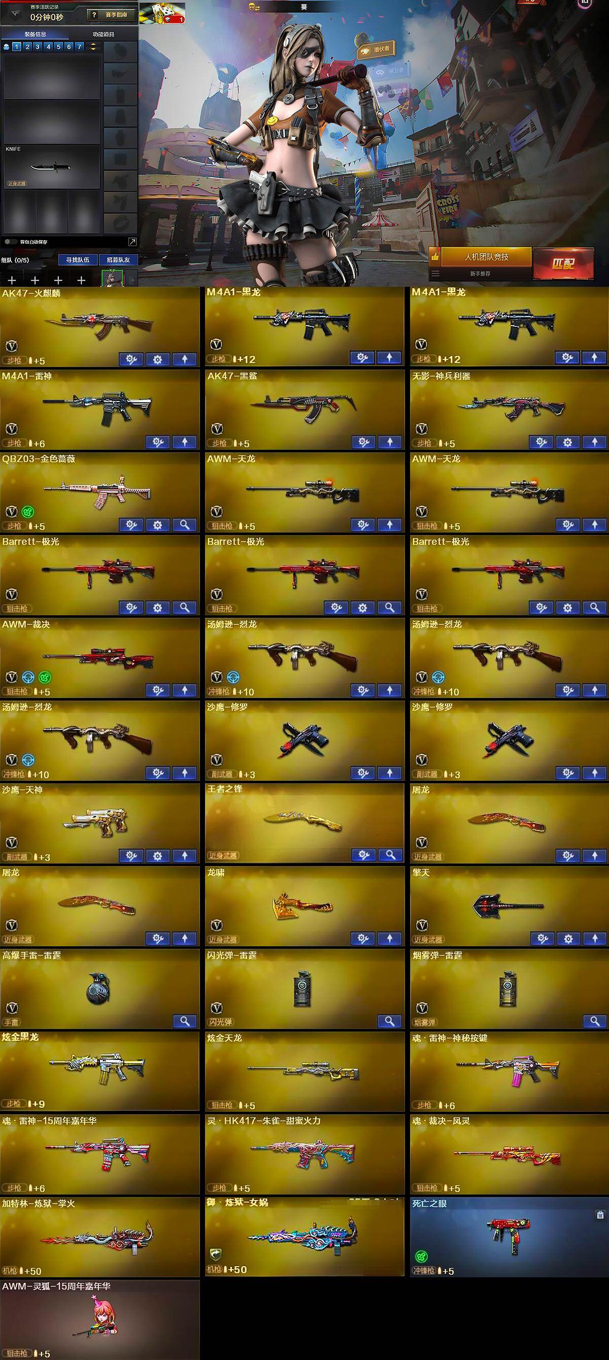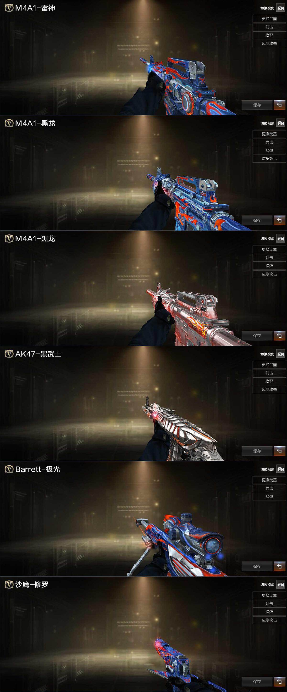 【英雄级武器】:AK47-火麒麟,M4A1-黑龙*2,M4A1-雷神,AK47-黑鲨,无影-神兵利器,QBZ03-金色蔷薇,AWM-天龙*2,Barrett-极光*3,AWM-裁决,汤姆逊-烈龙*3,沙鹰-修罗*2,沙鹰-天神,屠龙*2,龙啸,擎天,高爆手雷-雷霆,闪光弹-雷霆,烟雾弹-雷霆