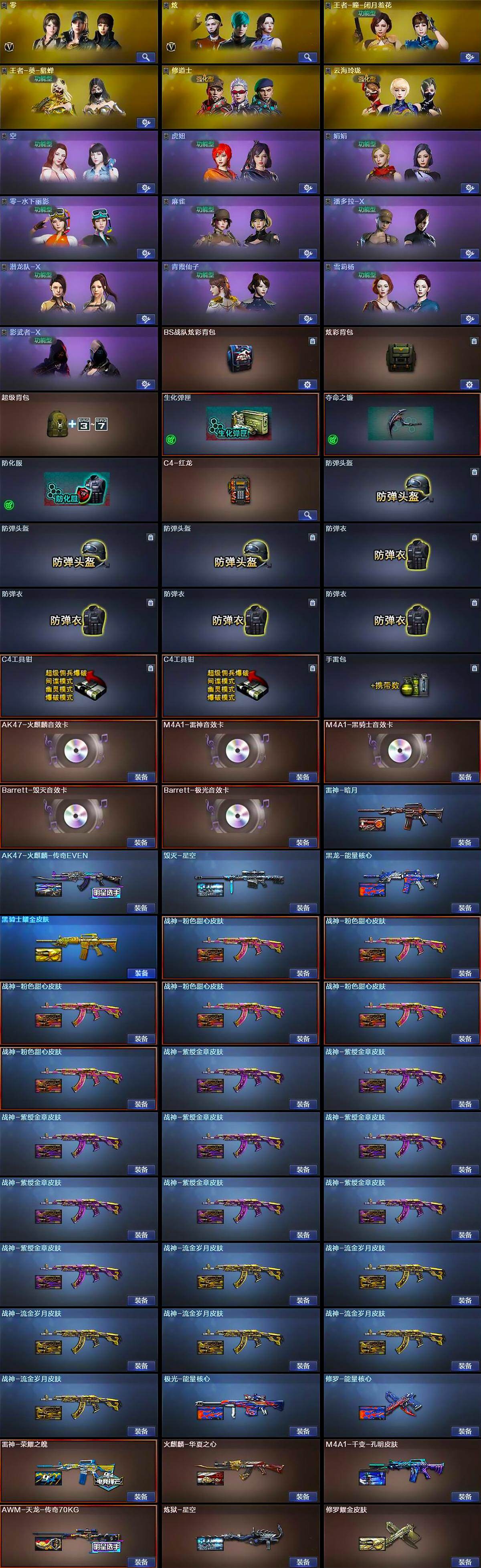 【皮肤】:雷神-暗月,雷神-荣耀之魄,火麒麟-华夏之心,AK47-火麒麟-传奇EVEN,毁灭-星空,M4A1-千变-孔明皮肤,黑龙-能量核心,黑骑士耀金皮肤,战神-粉色甜心皮肤*6,战神-紫绶金章皮肤*9,战神-流金岁月皮肤*6,AWM-天龙-传奇70KG,极光-能量核心,炼狱-星空,修罗-能量核心,修罗耀金皮肤