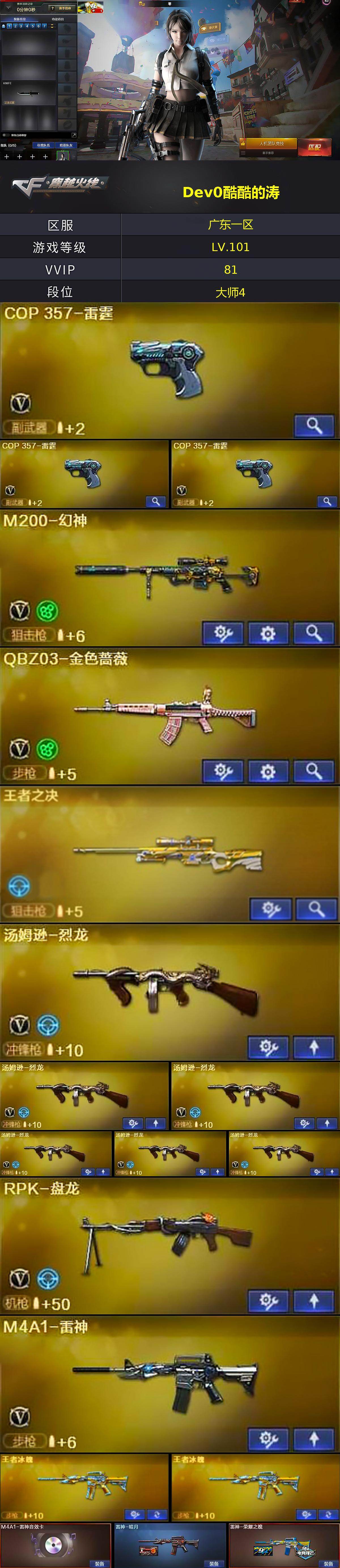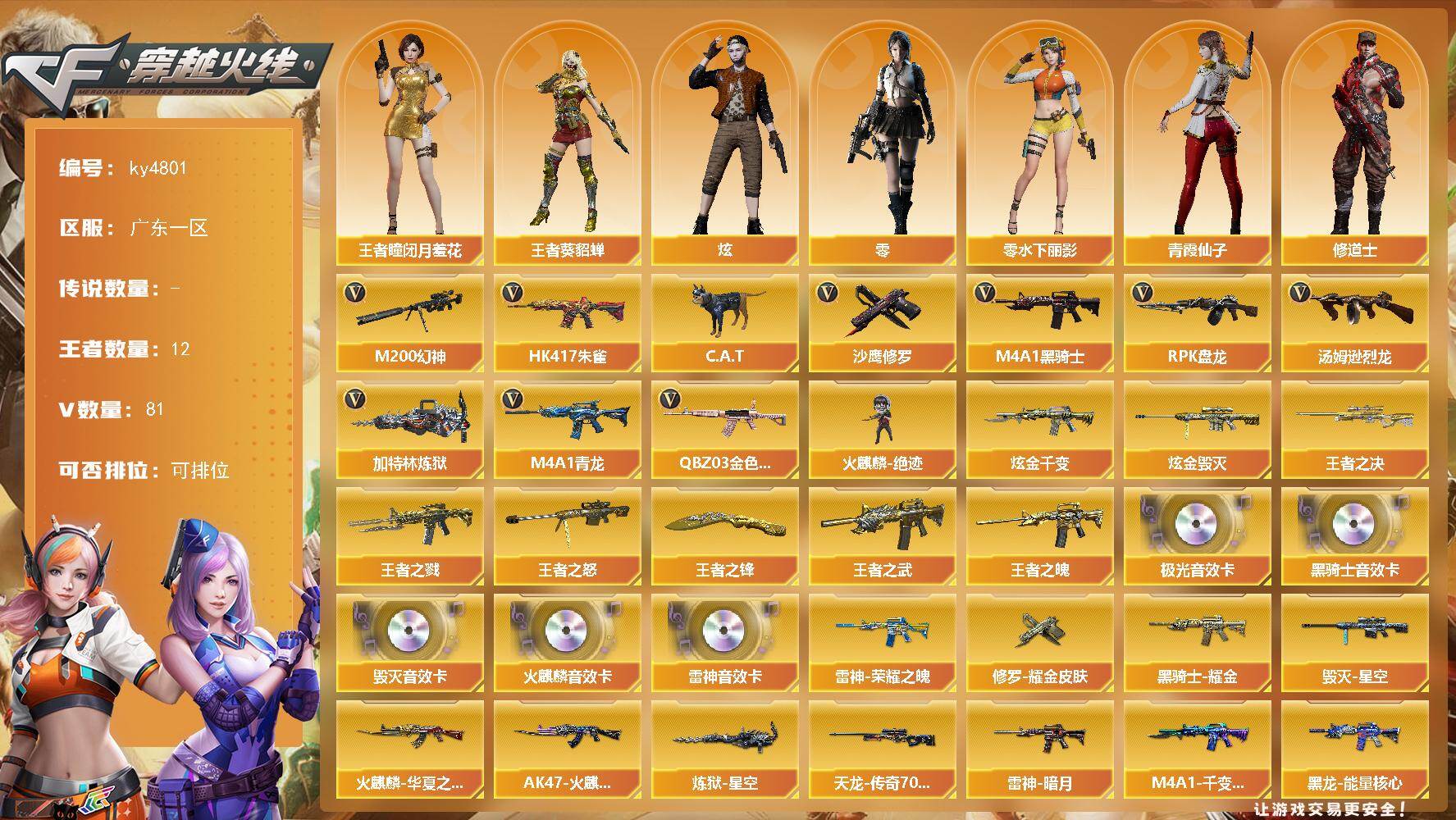 [15493195]广东一区-81V-12王者-3炫金 【热门武器】:QBZ03-金色蔷薇,HK417-朱雀,M4A1-青龙,M200-幻神,C.A.T,M4A1-黑骑士,汤姆逊-烈龙*6,RPK-盘龙,加特林-炼狱,火麒麟-绝迹,沙鹰-修罗 【王者炫金武器】:王者之戮,王者之武,王者之魄*2,王者之决,王者之怒*4,王者之锋,炫金千变*2,炫金毁灭 【音效卡】:AK47-火麒麟音效卡,M4A1-雷神音效卡,M4A1-黑骑士音效卡,Barrett-毁灭音效卡,Barrett-极光音效卡 【皮肤】:雷神-暗月,雷神-荣耀之魄,火麒麟-华夏之心,AK47-火麒麟-传奇EVEN,毁灭-星空,M4A1-千变-孔明皮肤,黑龙-能量核心,黑骑士耀金皮肤,战神-粉色甜心皮肤*6,战神-紫绶金章皮肤*9,战神-流金岁月皮肤*6,AWM-天龙-传奇70KG,极光-能量核心,炼狱-星空,修罗-能量核心,修罗耀金皮肤 【角色】:零,炫,王者-瞳-闭月羞花,王者-葵-貂蝉,修道士,云海玲珑,空,虎妞,娟娟,零-水下丽影,麻雀,潘多拉-X,潜龙队-X,青霞仙子,雪莉杨,影武者-X 【人偶武器】:火麒麟-绝迹,M4A1-雷神-精英刀锋,巴雷特-零-水下丽影,M37-葵,C.A.T,迷你牛魔王,深渊终结者手雷,闪光弹-小乔 【英雄级武器】:AK47-火麒麟,M4A1-黑龙,M4A1-雷神,M4A1-黑骑士,AK47-无影,AK47-黑武士,AN94-超新星,M4A1-龙血,M4A1-雷霆,M4A1-青龙,HK417-朱雀,QBZ03-金色蔷薇,M4A1-猎神*3,王者之幻-觉醒版,AK-47-猩红传说*4,AK47-B-战神,AWM-天龙,Barrett-毁灭*2,Barrett-极光,M200-幻神,RPK-盘龙,加特林-炼狱,汤姆逊-烈龙*6,AA-12-雷霆,沙鹰-修罗,沙鹰-天神*2,COP-雷霆*3,屠龙*2,龙啸*5,麒麟刺-堕天神,擎天,麒麟刺,擎天-CF网剧冠军,高爆手雷-雷霆*7,高爆手雷-堕天神,闪光弹-雷霆*7,闪光弹-堕天神,烟雾弹-雷霆*7,烟雾弹-堕天神 【道具】:BS战队炫彩背包,炫彩背包,超级背包,生化弹匣,夺命之镰,防化服,C4-红龙,防弹头盔*3,防弹衣*4,C4工具钳*2,手雷包 【特殊枪械】:1黑骑士,6烈龙,1盘龙,1炼狱