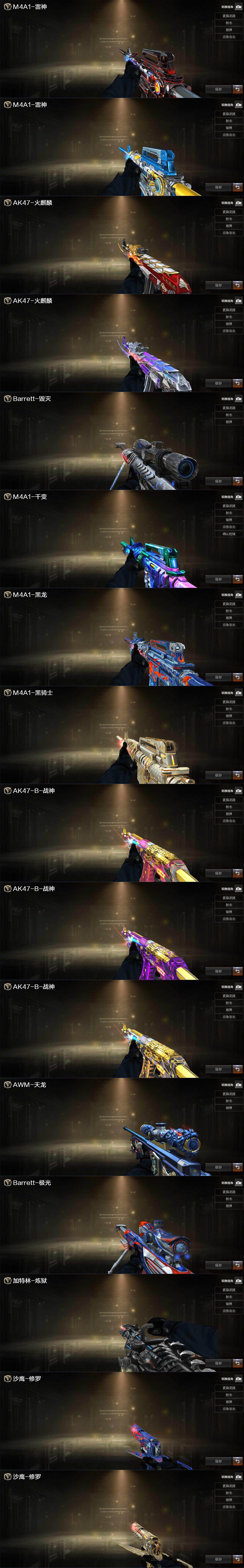 【英雄级武器】:AK47-火麒麟,M4A1-黑龙,M4A1-雷神,M4A1-黑骑士,AK47-无影,AK47-黑武士,AN94-超新星,M4A1-龙血,M4A1-雷霆,M4A1-青龙,HK417-朱雀,QBZ03-金色蔷薇,M4A1-猎神*3,王者之幻-觉醒版,AK-47-猩红传说*4,AK47-B-战神,AWM-天龙,Barrett-毁灭*2,Barrett-极光,M200-幻神,RPK-盘龙,加特林-炼狱,汤姆逊-烈龙*6,AA-12-雷霆,沙鹰-修罗,沙鹰-天神*2,COP-雷霆*3,屠龙*2,龙啸*5,麒麟刺-堕天神,擎天,麒麟刺,擎天-CF网剧冠军,高爆手雷-雷霆*7,高爆手雷-堕天神,闪光弹-雷霆*7,闪光弹-堕天神,烟雾弹-雷霆*7,烟雾弹-堕天神
