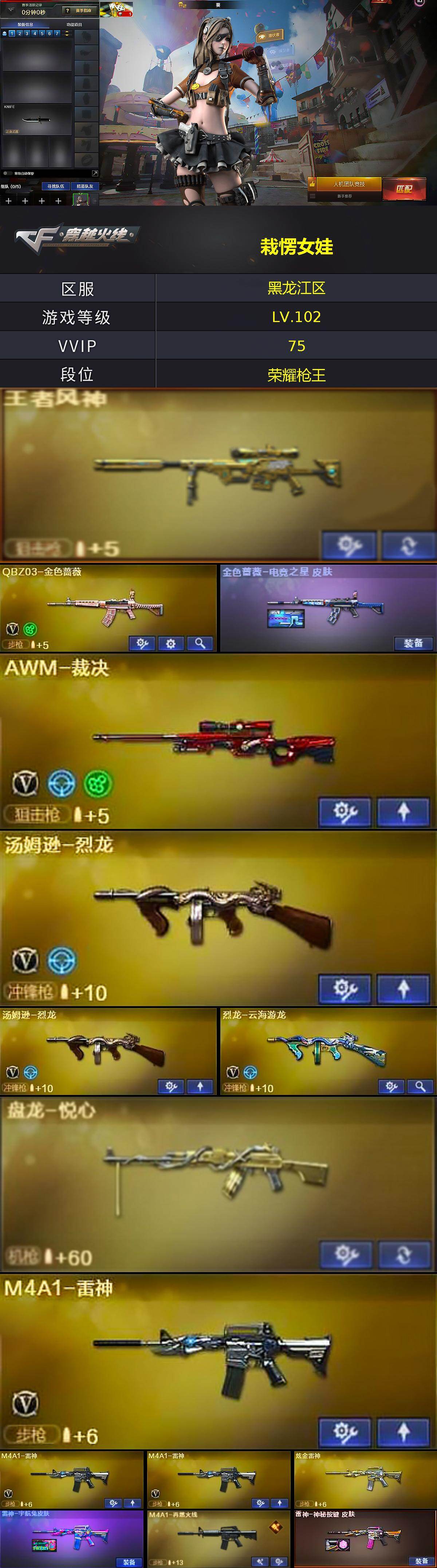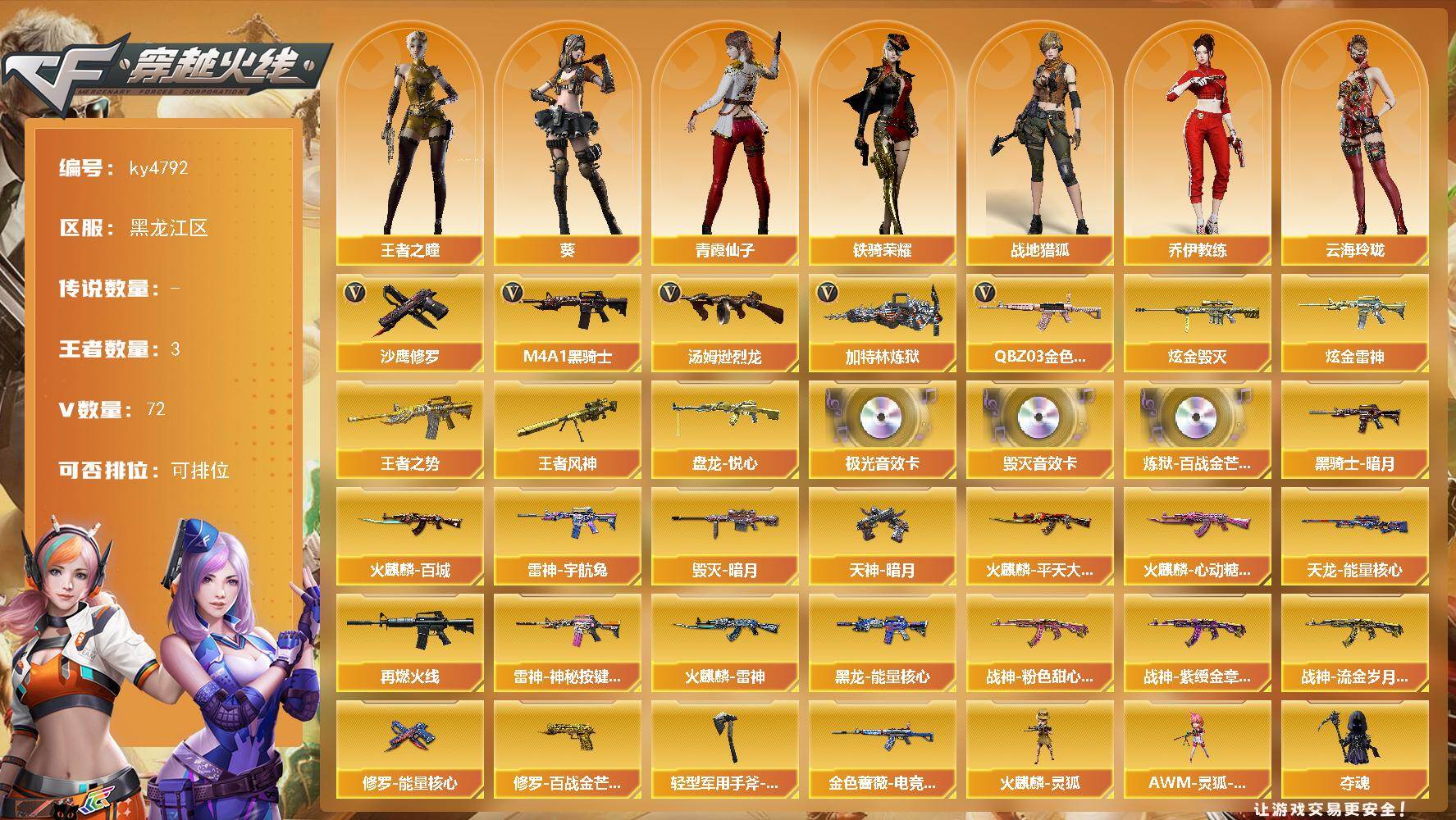 [15493557]黑龙江区-72V-3王者-2炫金 【热门武器】:QBZ03-金色蔷薇,M4A1-黑骑士,汤姆逊-烈龙*2,加特林-炼狱*2,沙鹰-修罗*5 【王者炫金武器】:王者之势,王者风神,盘龙-悦心,炫金雷神,炫金毁灭 【音效卡】:Barrett-毁灭音效卡,Barrett-极光音效卡,炼狱-百战金芒-庆典舞曲音效卡 【皮肤】:金色蔷薇-电竞之星 皮肤,雷神-宇航兔皮肤,M4A1-再燃火线,雷神-神秘按键 皮肤,火麒麟-雷神,火麒麟-平天大圣,火麒麟-百城,火麒麟-心动糖果,毁灭-暗月,黑龙-能量核心,黑骑士-暗月*2,战神-粉色甜心皮肤*4,战神-紫绶金章皮肤*2,战神-流金岁月皮肤,天龙-能量核心,修罗-能量核心*2,修罗-百战金芒 皮肤,天神-暗月,轻型军用手斧-再燃火线 【角色】:葵,战地猎狐,王者之瞳,奇洋探员,乔伊教练,云海玲珑,暗夜-X,北极狐-X,初恋灵狐,电竞少女,芳心审判者,飞虎队-X,嘉年华灵狐,娟娟,灵狐者-X,灵狐者-黄金海岸,灵狐者-七夕宝贝,麻雀,曼陀罗-X,潘多拉-X,潘多拉-甜心教官,潜龙队-X,青霞仙子,斯沃特-X,铁骑荣耀,新娜塔莎,影武者-X,游珑儿 【人偶武器】:火麒麟-灵狐,AWM-灵狐-15周年嘉年华,夺魂,生化手雷-机甲核心,闪光弹-小乔 【暴走生化】:超级对讲机 【挑战大师】:激光毁灭者III-白马银枪 【英雄级武器】:M4A1-千变,AK47-火麒麟,M4A1-黑龙*2,M4A1-雷神*3,M4A1-黑骑士,AK47-无影,M4A1-死神,AK47-黑武士,AK12-天启,AN94-超新星,M4A1-武圣,AK47-黑鲨,M4A1-龙血,无影-神兵利器,黑武士-锦绣游龙,超新星-热带奇洋,M4A1-玫瑰精灵,QBZ03-金色蔷薇,M4A1-猎神,烈火-动感闪耀,AK-47-猩红传说*6,AK47-B-战神,黑骑士-海王,AWM-天龙,Barrett-毁灭,Barrett-极光,AWM-裁决,加特林-炼狱*2,炼狱-百战金芒,汤姆逊-烈龙*2,烈龙-云海游龙,AA-12-雷霆,沙鹰-修罗*5,沙鹰-天神,Glock18-武圣,天神-动感闪耀,屠龙*3,龙啸*2,擎天,麒麟刺,屠龙-动感闪耀,擎天-云海游龙,龙啸-热带奇洋,麒麟刺-百战金芒,手雷-动感闪耀,手雷-云海游龙,手雷-热带奇洋,M4A1-赤狱骑士,AWM-昌龙,Ba