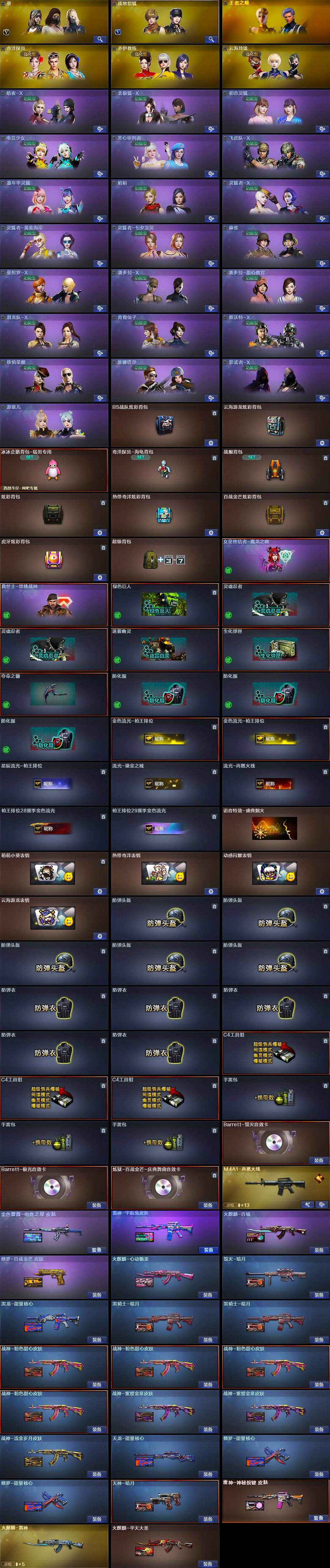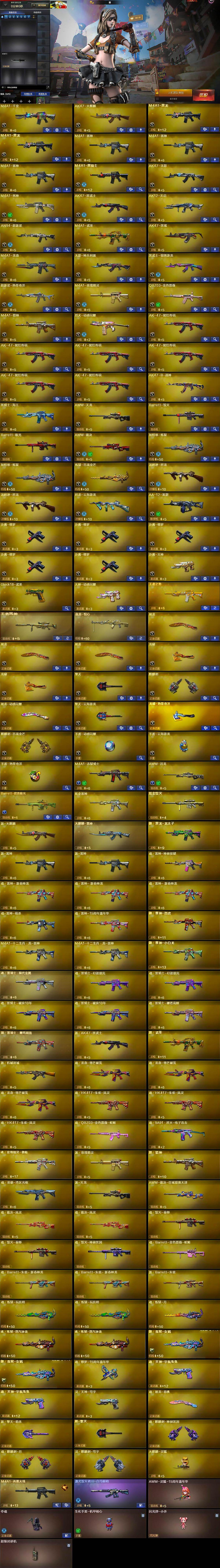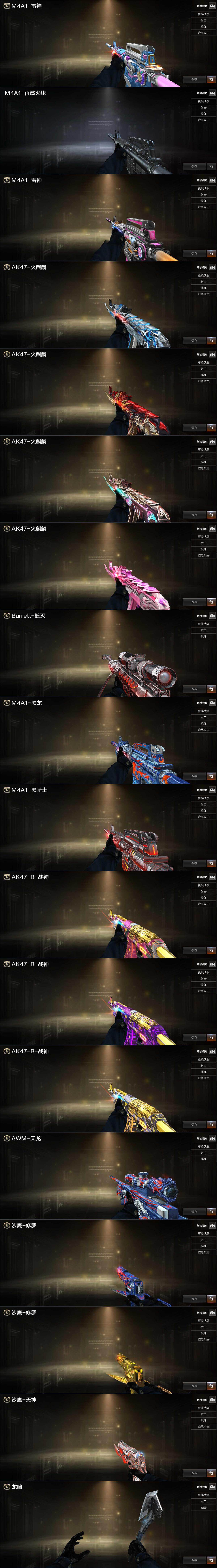 【英雄级武器】:M4A1-千变,AK47-火麒麟,M4A1-黑龙*2,M4A1-雷神*3,M4A1-黑骑士,AK47-无影,M4A1-死神,AK47-黑武士,AK12-天启,AN94-超新星,M4A1-武圣,AK47-黑鲨,M4A1-龙血,无影-神兵利器,黑武士-锦绣游龙,超新星-热带奇洋,M4A1-玫瑰精灵,QBZ03-金色蔷薇,M4A1-猎神,烈火-动感闪耀,AK-47-猩红传说*6,AK47-B-战神,黑骑士-海王,AWM-天龙,Barrett-毁灭,Barrett-极光,AWM-裁决,加特林-炼狱*2,炼狱-百战金芒,汤姆逊-烈龙*2,烈龙-云海游龙,AA-12-雷霆,沙鹰-修罗*5,沙鹰-天神,Glock18-武圣,天神-动感闪耀,屠龙*3,龙啸*2,擎天,麒麟刺,屠龙-动感闪耀,擎天-云海游龙,龙啸-热带奇洋,麒麟刺-百战金芒,手雷-动感闪耀,手雷-云海游龙,手雷-热带奇洋,M4A1-赤狱骑士,AWM-昌龙,Ba