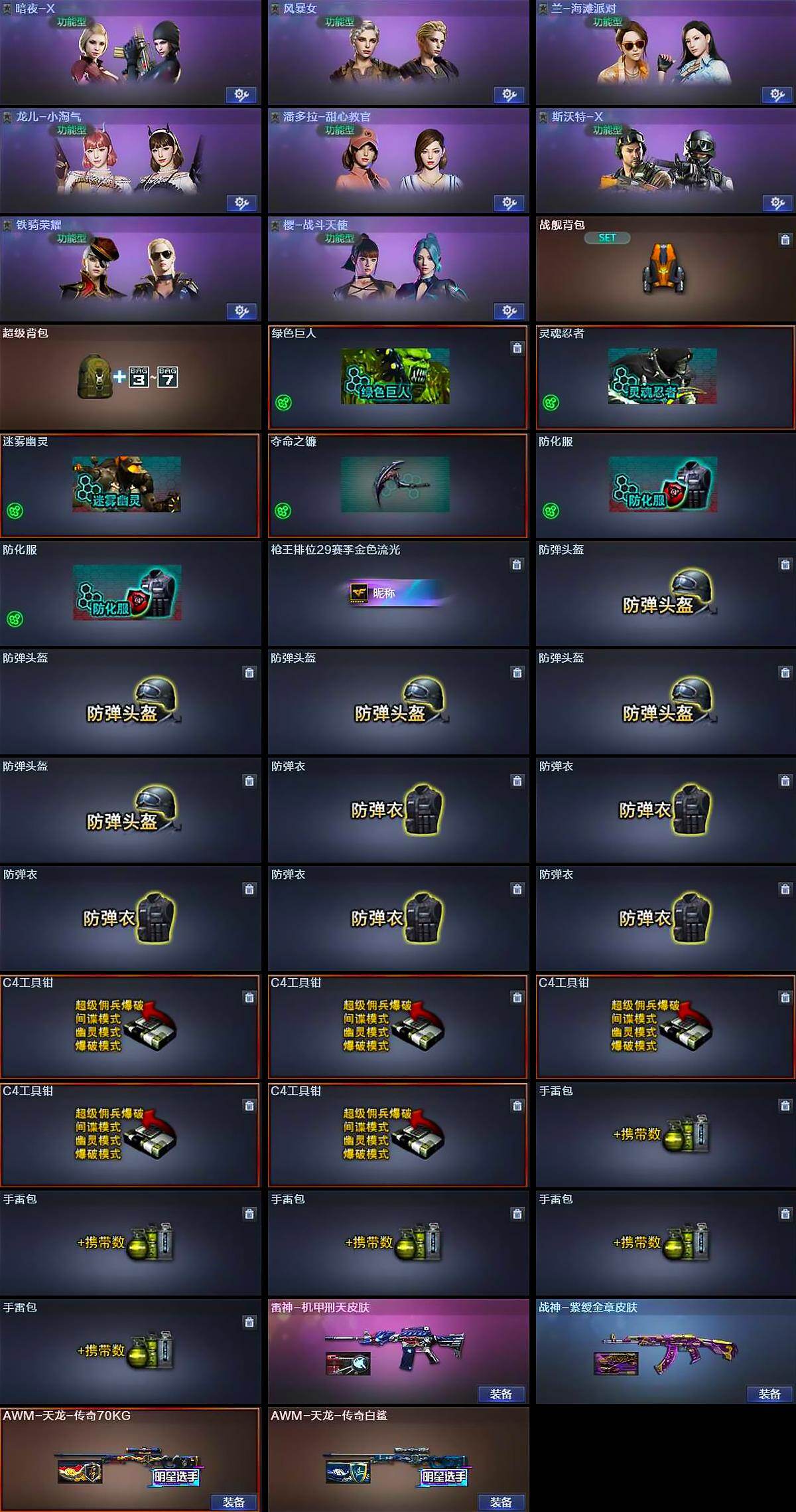 【道具】:战舰背包,超级背包,绿色巨人,灵魂忍者,迷雾幽灵,夺命之镰,防化服*2,枪王排位29赛季金色流光,防弹头盔*5,防弹衣*5,C4工具钳*5,手雷包*5