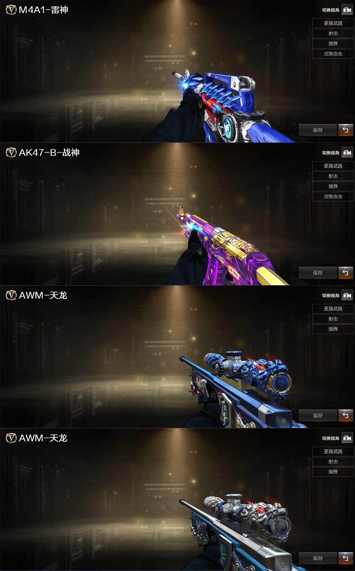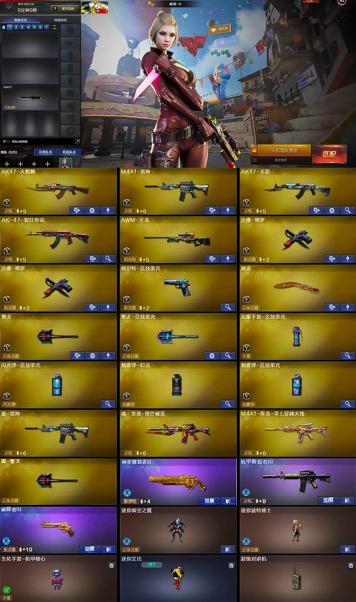 【英雄级武器】:AK47-火麒麟,M4A1-雷神,AK47-无影,AK-47-猩红传说,AWM-天龙,沙鹰-修罗*2,柯尔特-竞技荣光,屠龙,擎天,擎天-竞技荣光,高爆手雷-竞技荣光,闪光弹-竞技荣光,烟雾弹-幻灵,烟雾弹-竞技荣光