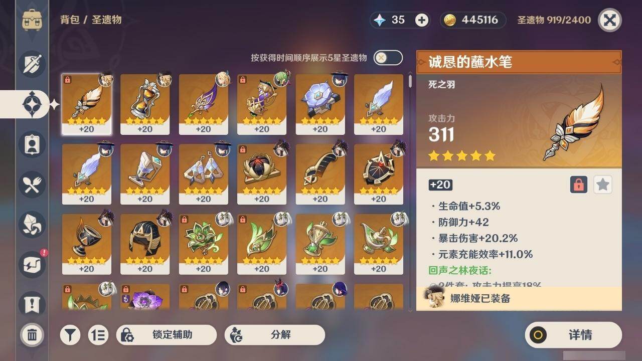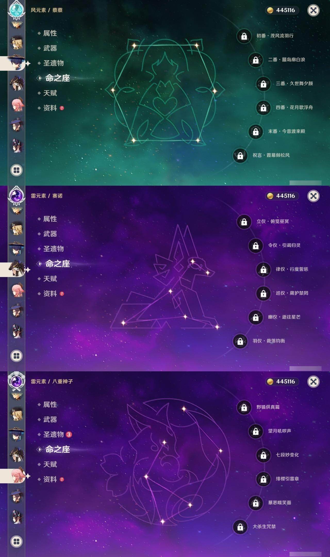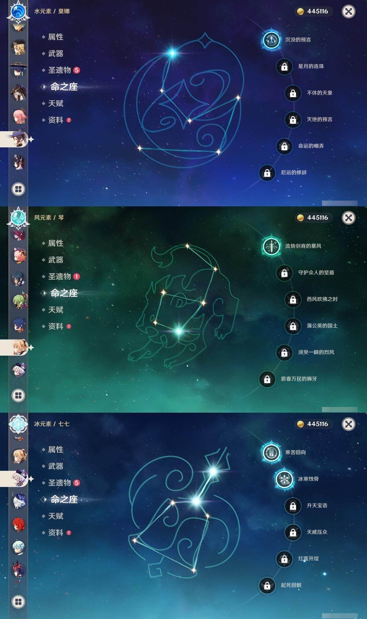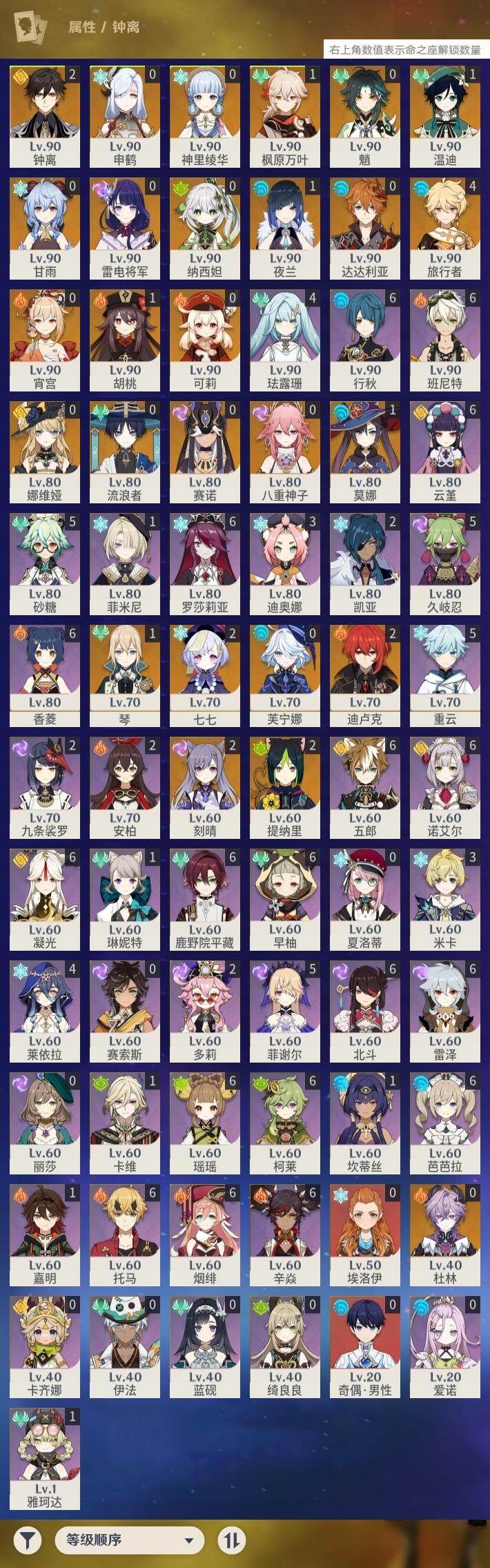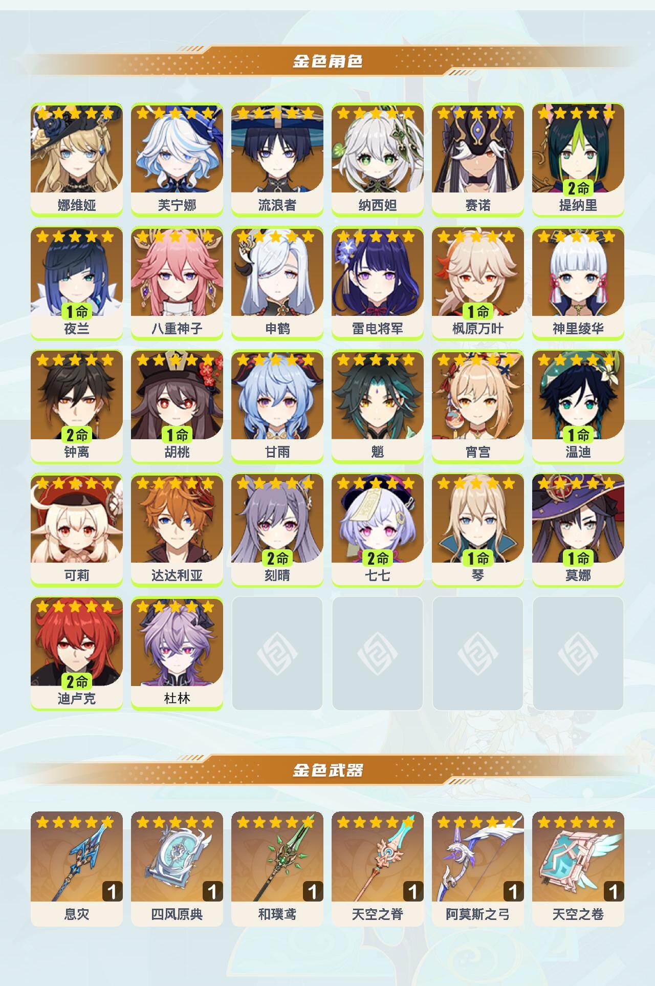 0命娜维娅,0命芙宁娜,0命流浪者,0命纳西妲,0命赛诺,2命提纳里,1命夜兰,0命八重神子,0命申鹤,0命雷电将军,1命枫原万叶,0命神里绫华,2命钟离,1命胡桃,0命甘雨,0命魈,0命宵宫,1命温迪,0命可莉,0命达达利亚,2命刻晴,2命七七,1命琴,1命莫娜,2命迪卢克,0命杜林,精1息灾,精1四风原典,精1和璞鸢,精1天空之脊,精1阿莫斯之弓,精1天空之卷