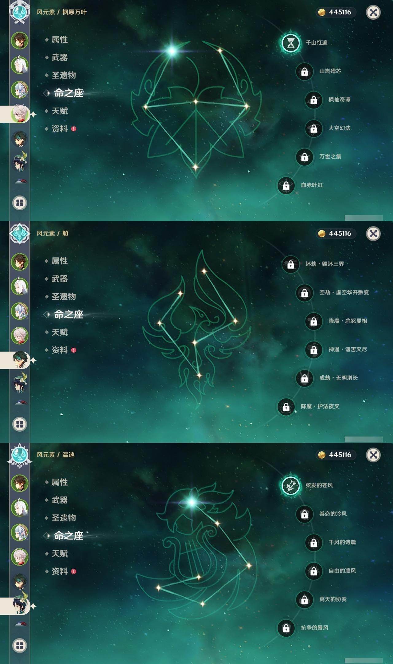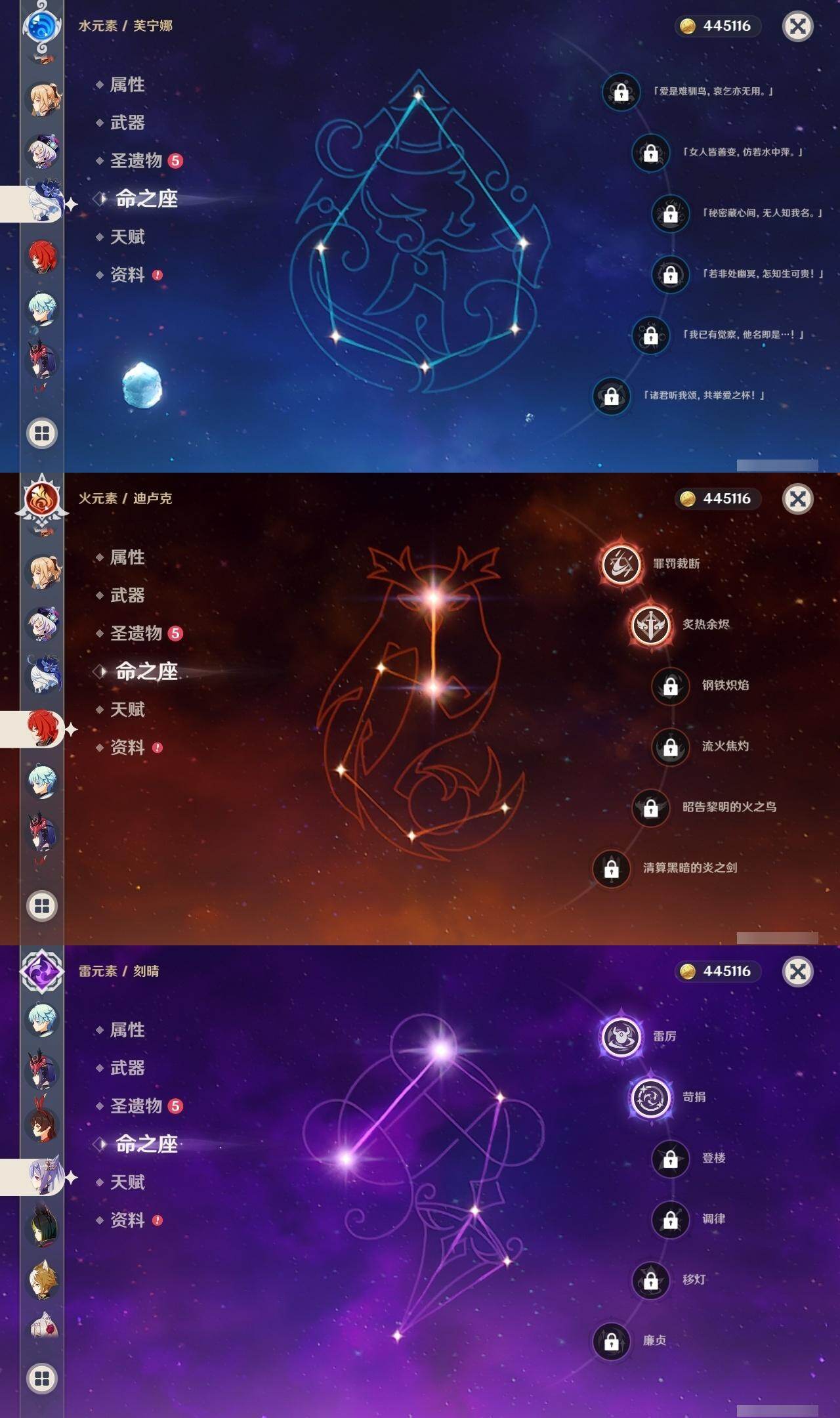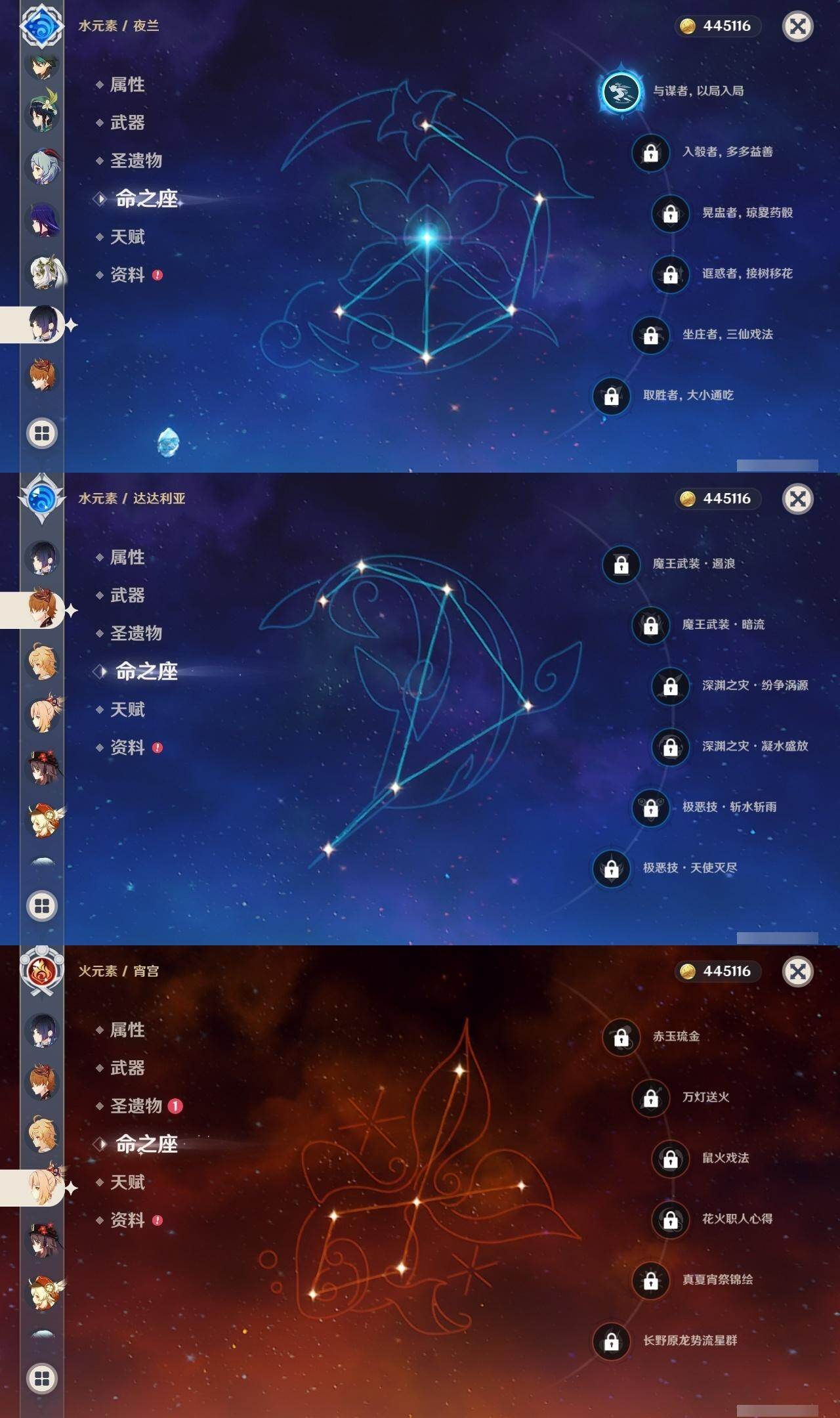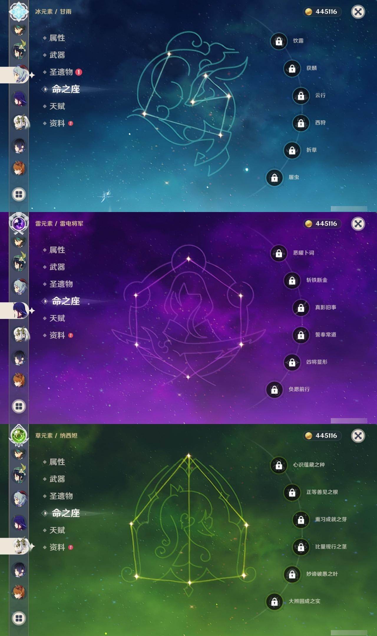 0命娜维娅,0命芙宁娜,0命流浪者,0命纳西妲,0命赛诺,2命提纳里,1命夜兰,0命八重神子,0命申鹤,0命雷电将军,1命枫原万叶,0命神里绫华,2命钟离,1命胡桃,0命甘雨,0命魈,0命宵宫,1命温迪,0命可莉,0命达达利亚,2命刻晴,2命七七,1命琴,1命莫娜,2命迪卢克,0命杜林,精1息灾,精1四风原典,精1和璞鸢,精1天空之脊,精1阿莫斯之弓,精1天空之卷