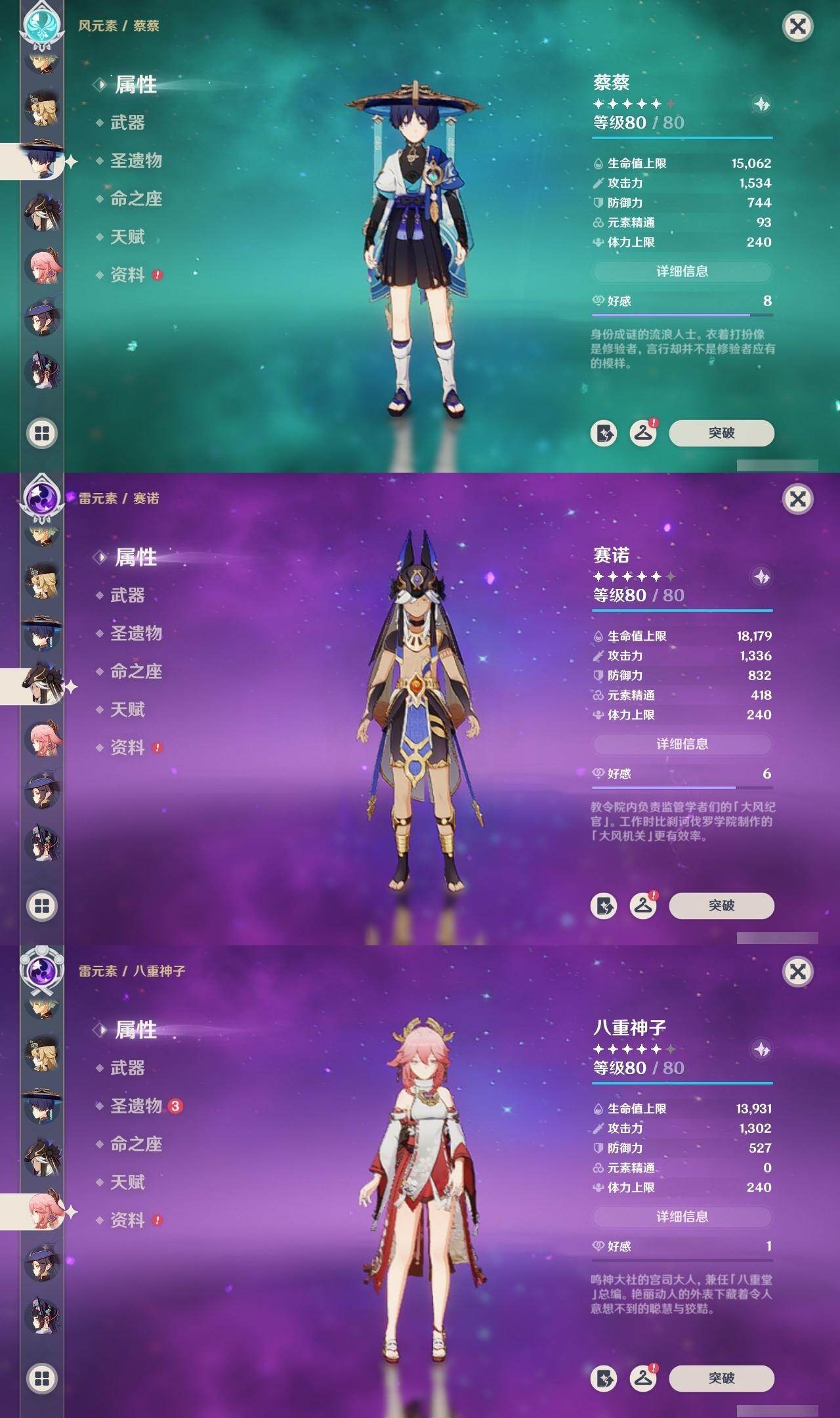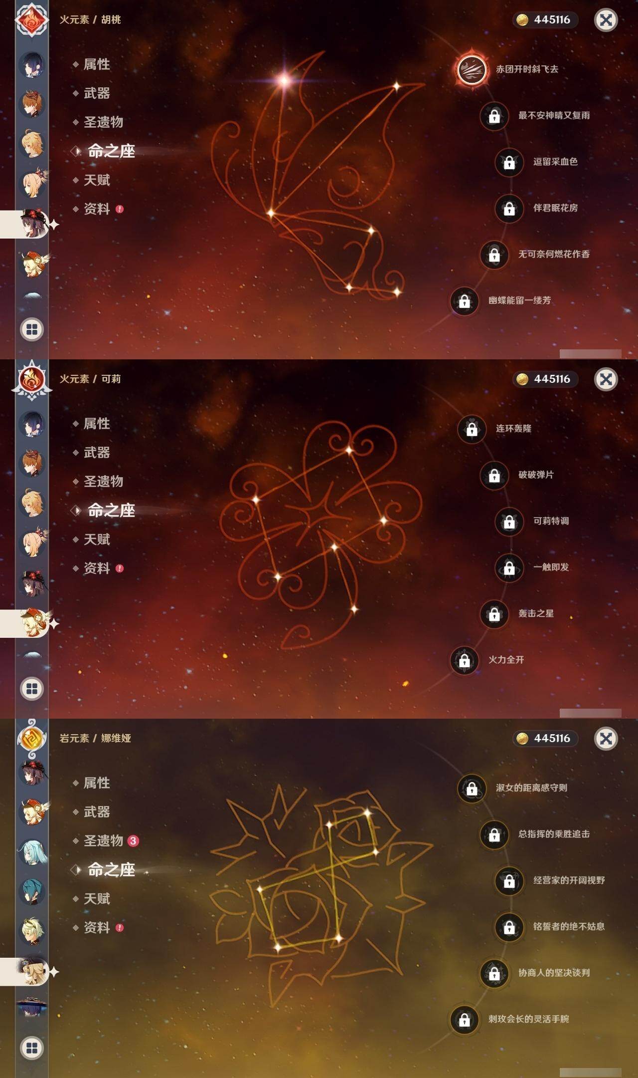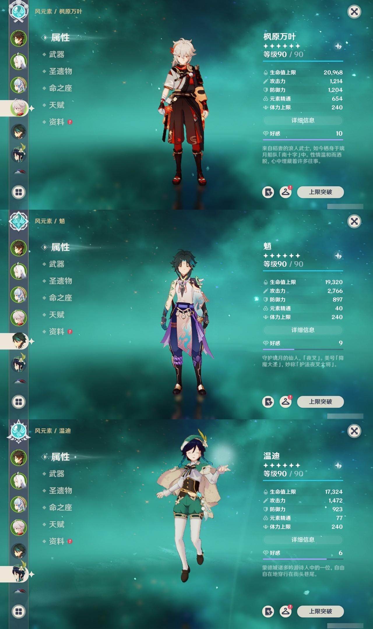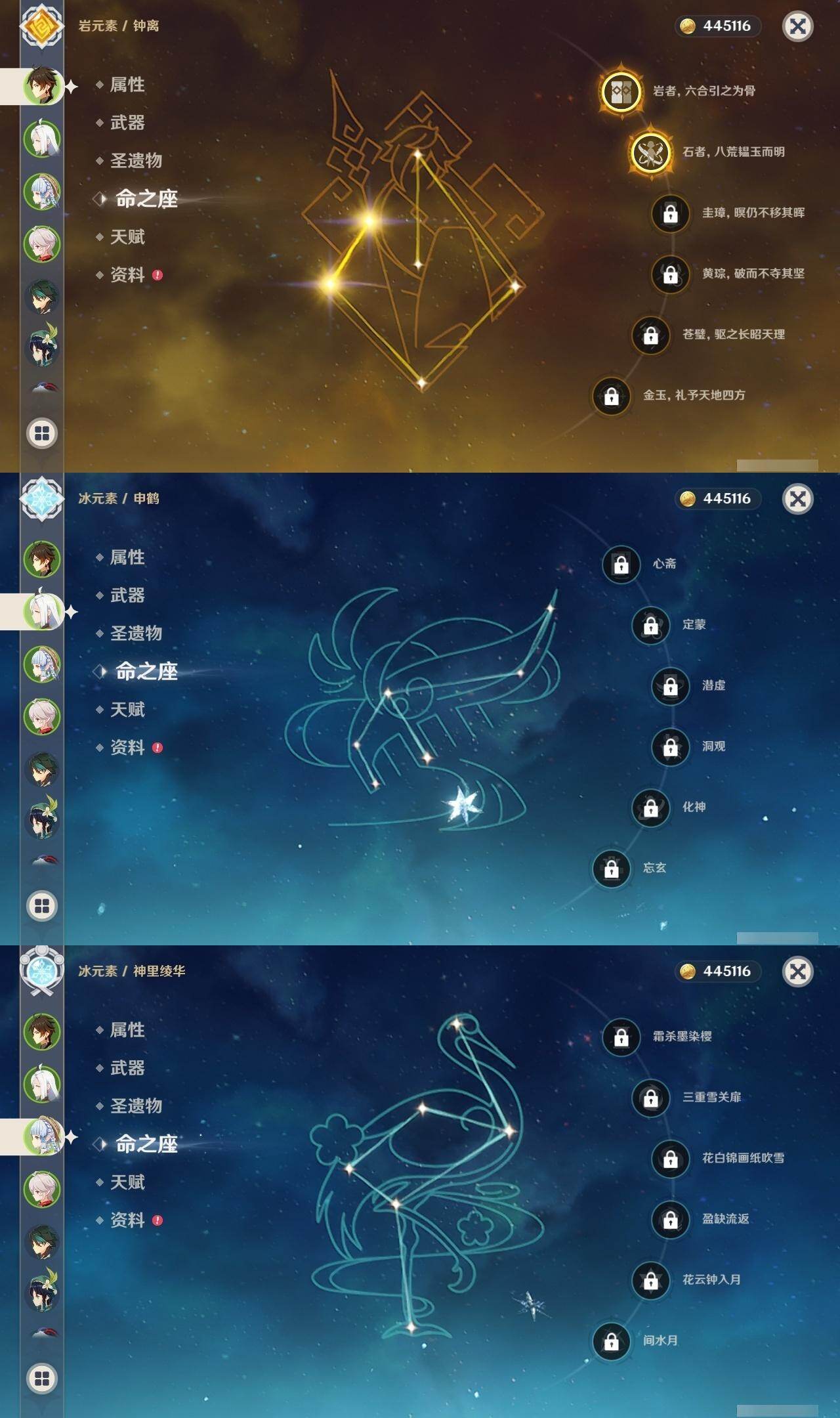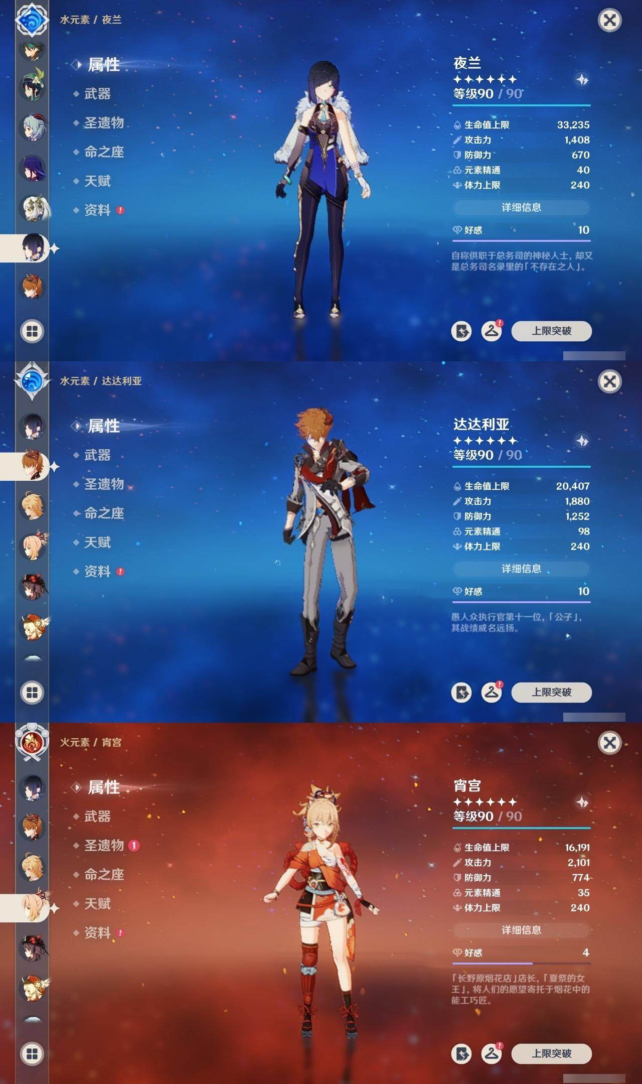 0命娜维娅,0命芙宁娜,0命流浪者,0命纳西妲,0命赛诺,2命提纳里,1命夜兰,0命八重神子,0命申鹤,0命雷电将军,1命枫原万叶,0命神里绫华,2命钟离,1命胡桃,0命甘雨,0命魈,0命宵宫,1命温迪,0命可莉,0命达达利亚,2命刻晴,2命七七,1命琴,1命莫娜,2命迪卢克,0命杜林,精1息灾,精1四风原典,精1和璞鸢,精1天空之脊,精1阿莫斯之弓,精1天空之卷