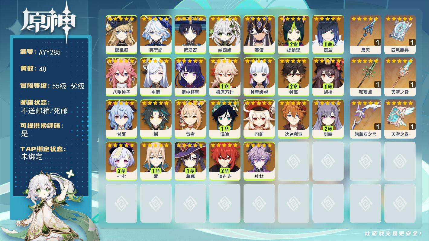 [15494143]60级/48黄/男主/26个五星角色/6个五星武器 0命娜维娅,0命芙宁娜,0命流浪者,0命纳西妲,0命赛诺,2命提纳里,1命夜兰,0命八重神子,0命申鹤,0命雷电将军,1命枫原万叶,0命神里绫华,2命钟离,1命胡桃,0命甘雨,0命魈,0命宵宫,1命温迪,0命可莉,0命达达利亚,2命刻晴,2命七七,1命琴,1命莫娜,2命迪卢克,0命杜林,精1息灾,精1四风原典,精1和璞鸢,精1天空之脊,精1阿莫斯之弓,精1天空之卷
