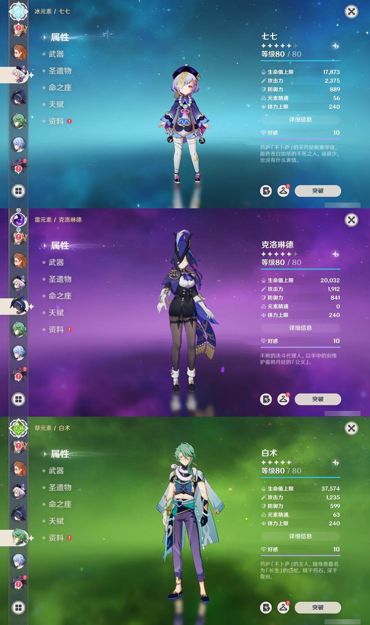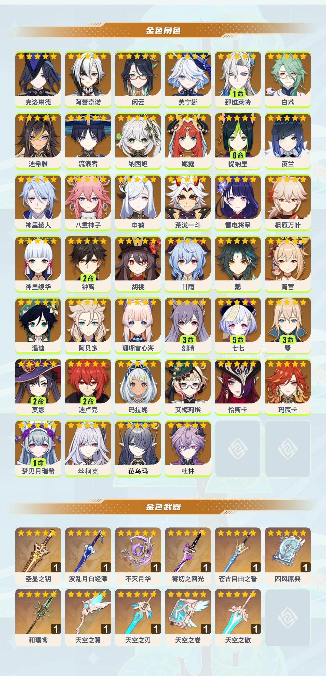 0命克洛琳德,0命阿蕾奇诺,0命闲云,0命芙宁娜,1命那维莱特,0命白术,0命迪希雅,0命流浪者,0命纳西妲,0命妮露,满命提纳里,0命夜兰,0命神里绫人,0命八重神子,0命申鹤,0命荒泷一斗,0命雷电将军,0命枫原万叶,0命神里绫华,2命钟离,0命胡桃,0命甘雨,0命魈,0命宵宫,0命温迪,0命阿贝多,0命珊瑚宫心海,3命刻晴,5命七七,3命琴,2命莫娜,2命迪卢克,0命玛拉妮,0命艾梅莉埃,0命恰斯卡,0命玛薇卡,1命梦见月瑞希,0命丝柯克,0命菈乌玛,0命杜林,精1圣显之钥,精1波乱月白经津,精1不灭月华,精1雾切之回光,精1苍古自由之誓,精1四风原典,精1和璞鸢,精1天空之翼,精1天空之刃,精1天空之卷,精1天空之傲